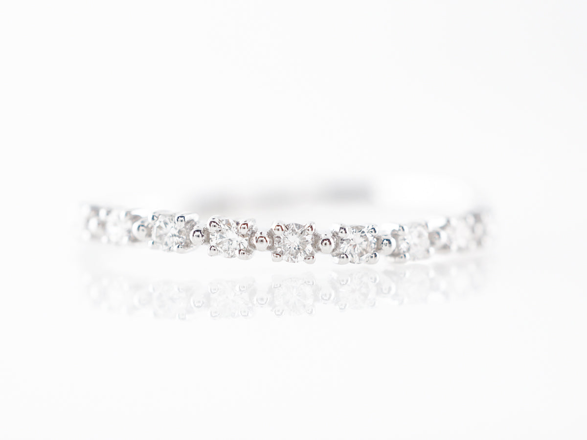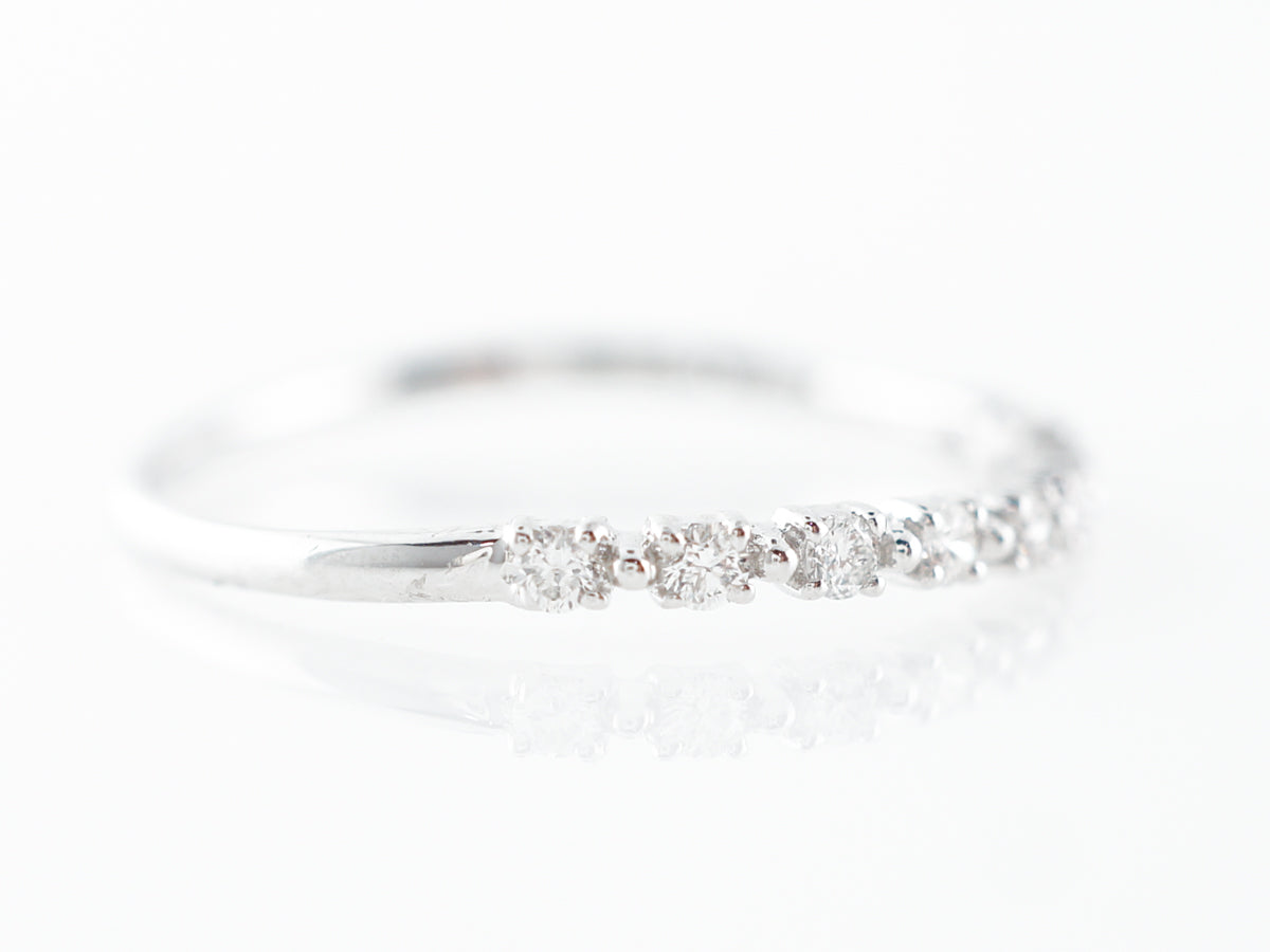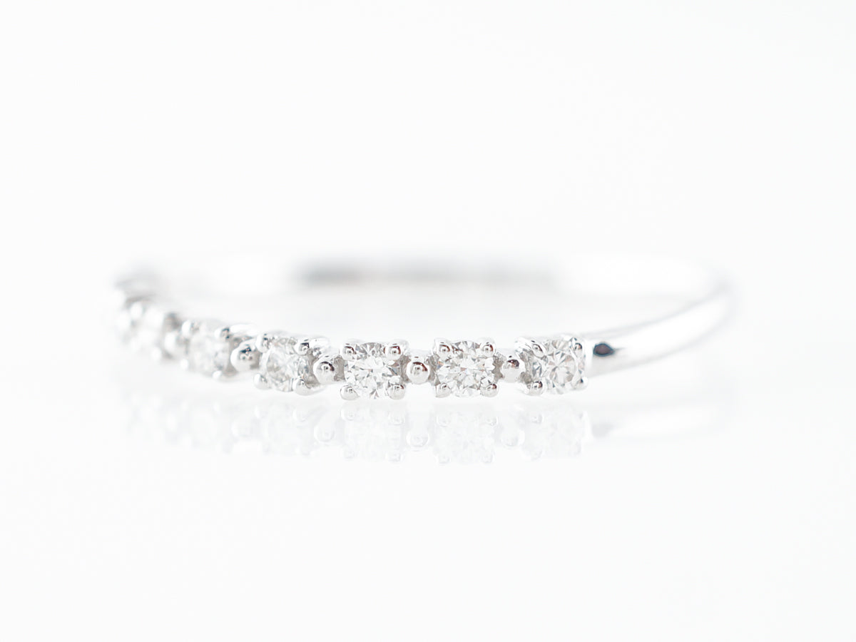 Slightly Curved Wedding Band w/ Diamonds in White Gold. This sparkling half-eternity wedding band features .14 carats of round brilliant cut diamonds set in 14 karat white gold. This would be a perfect addition to give a solitaire engagement ring a little extra sparkle, or could be worn on the right hand as a stacking ring.