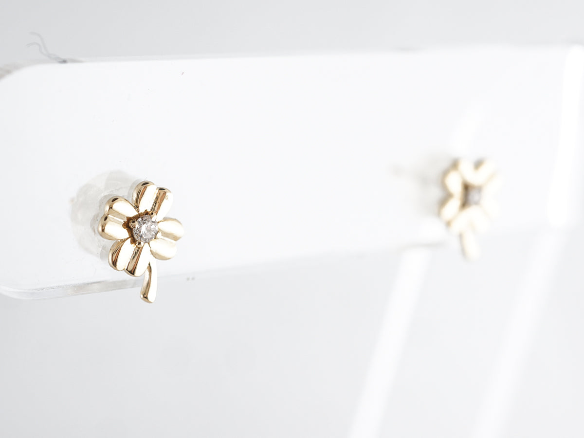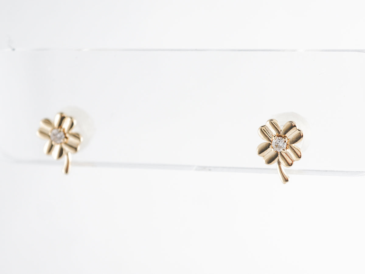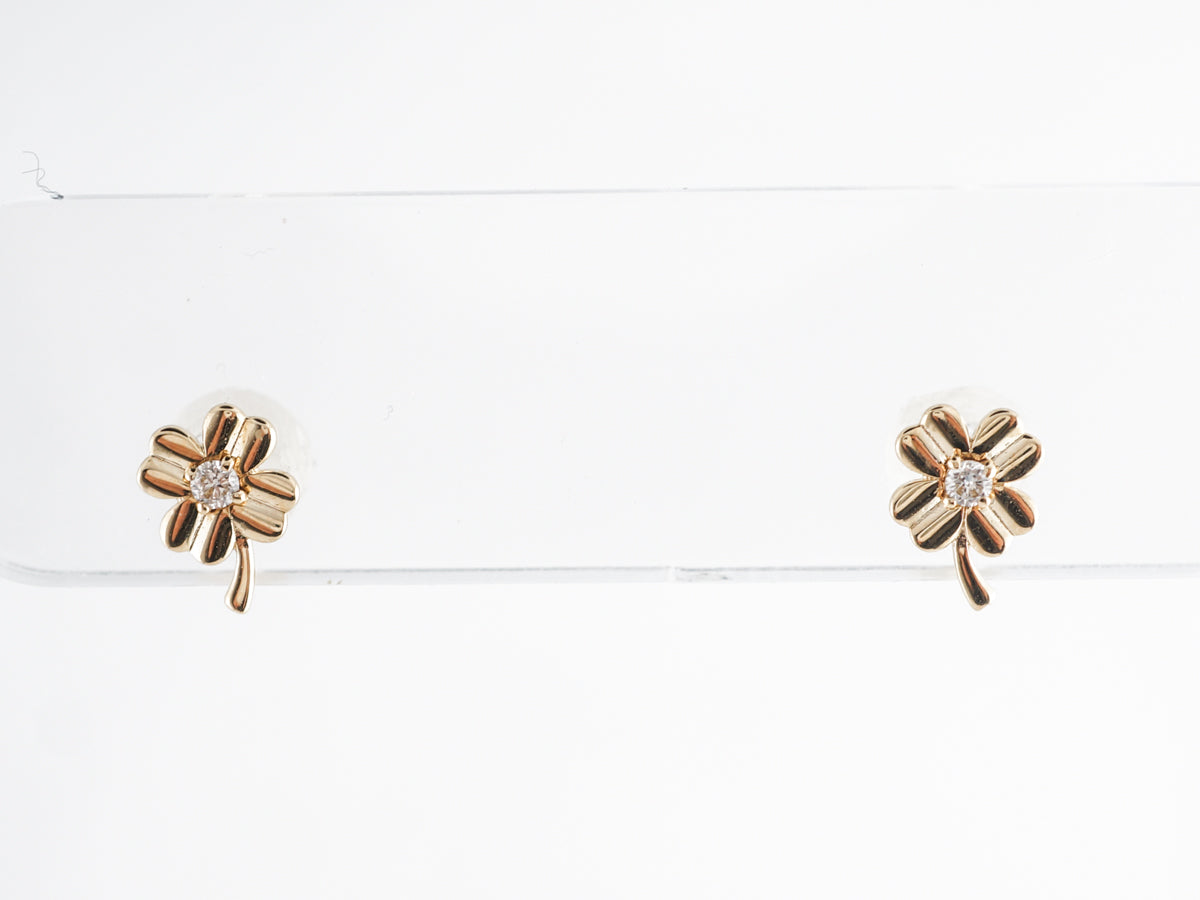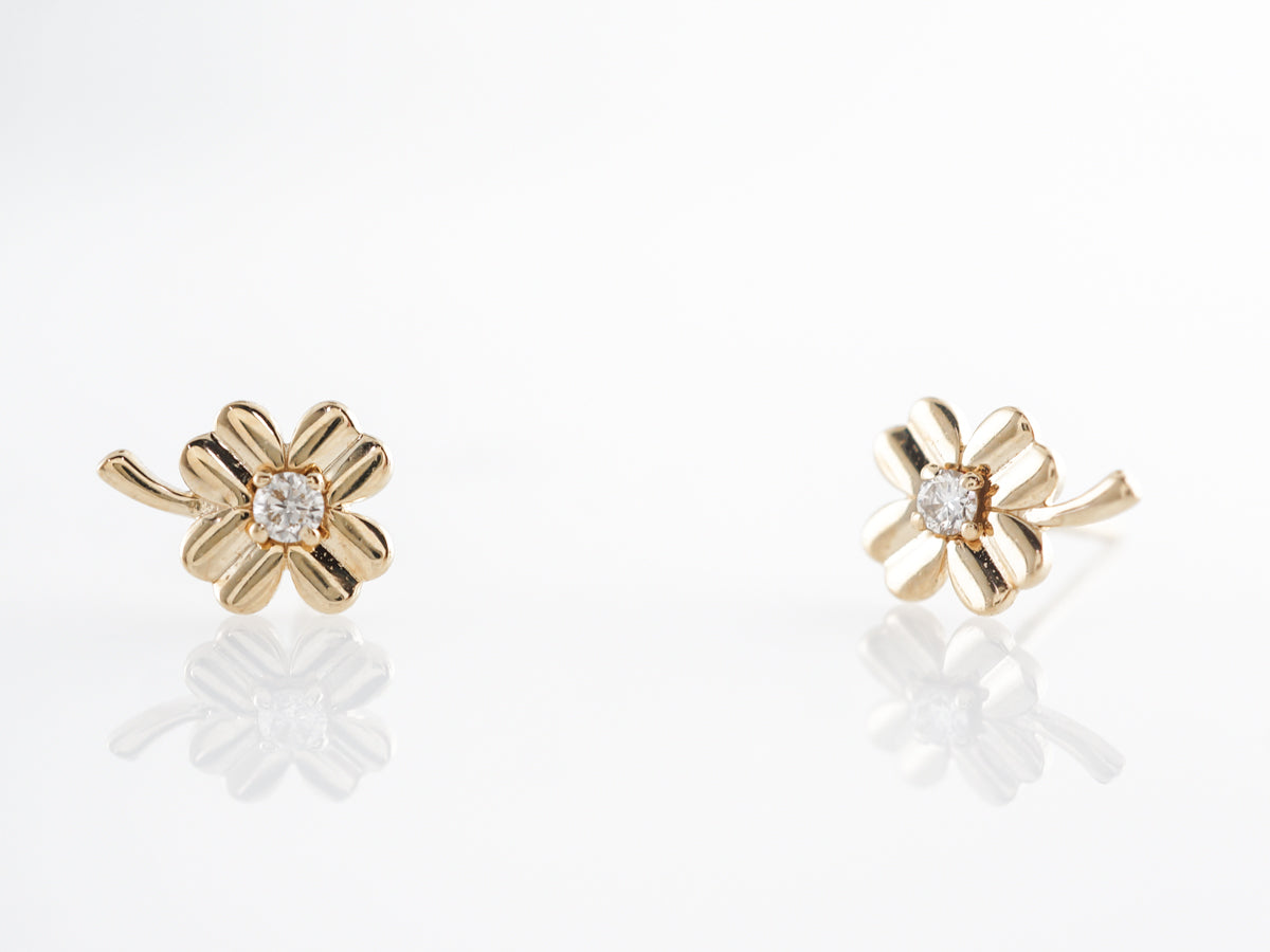 Small Diamond Clover Earrings 14K Yellow Gold. These darling little stud earrings feature .05 carats of round brilliant diamonds set in 14 karat yellow gold. The earrings are shaped as pretty little clovers with diamonds at their center. These would make a great gift for someone looking for a bit of luck!