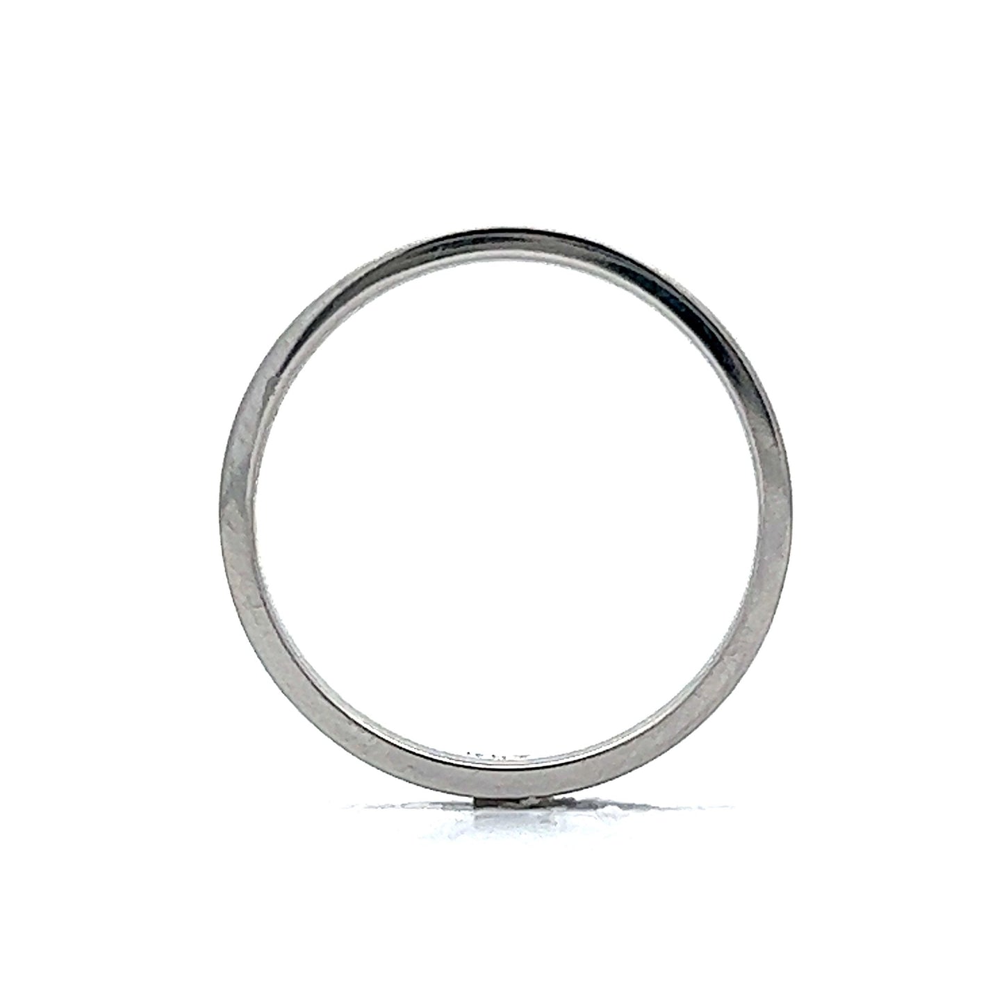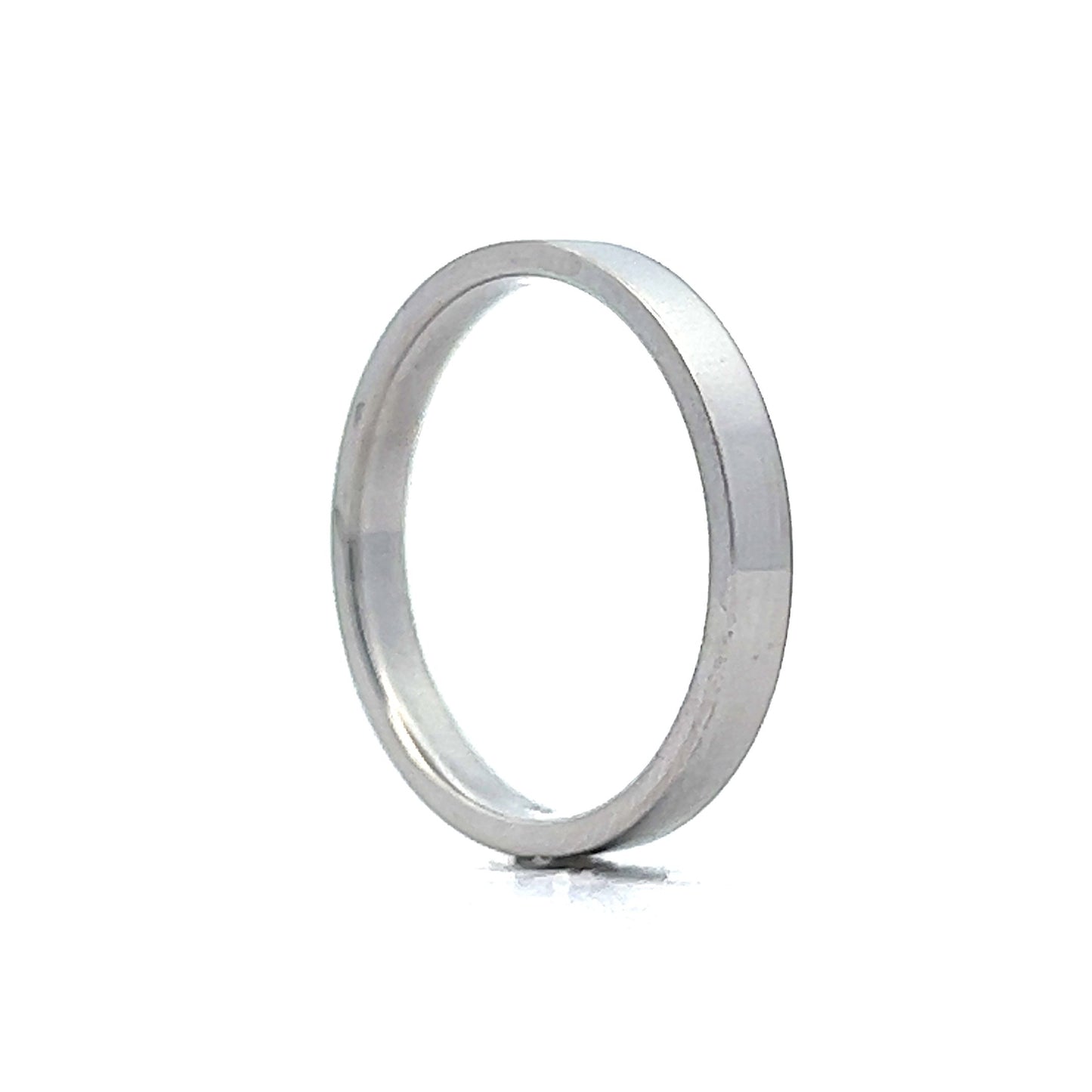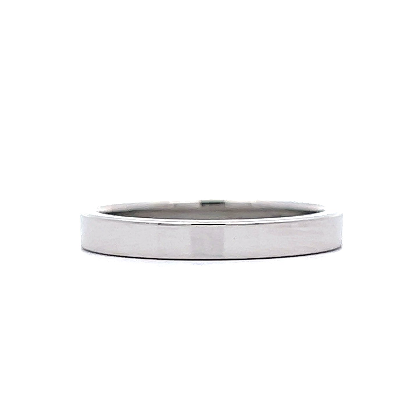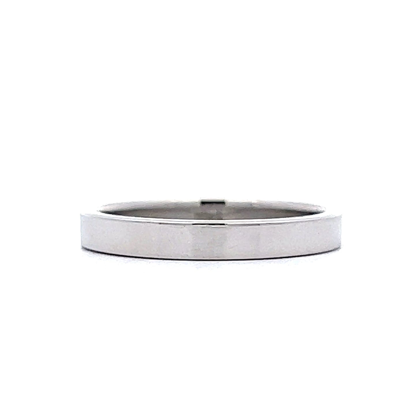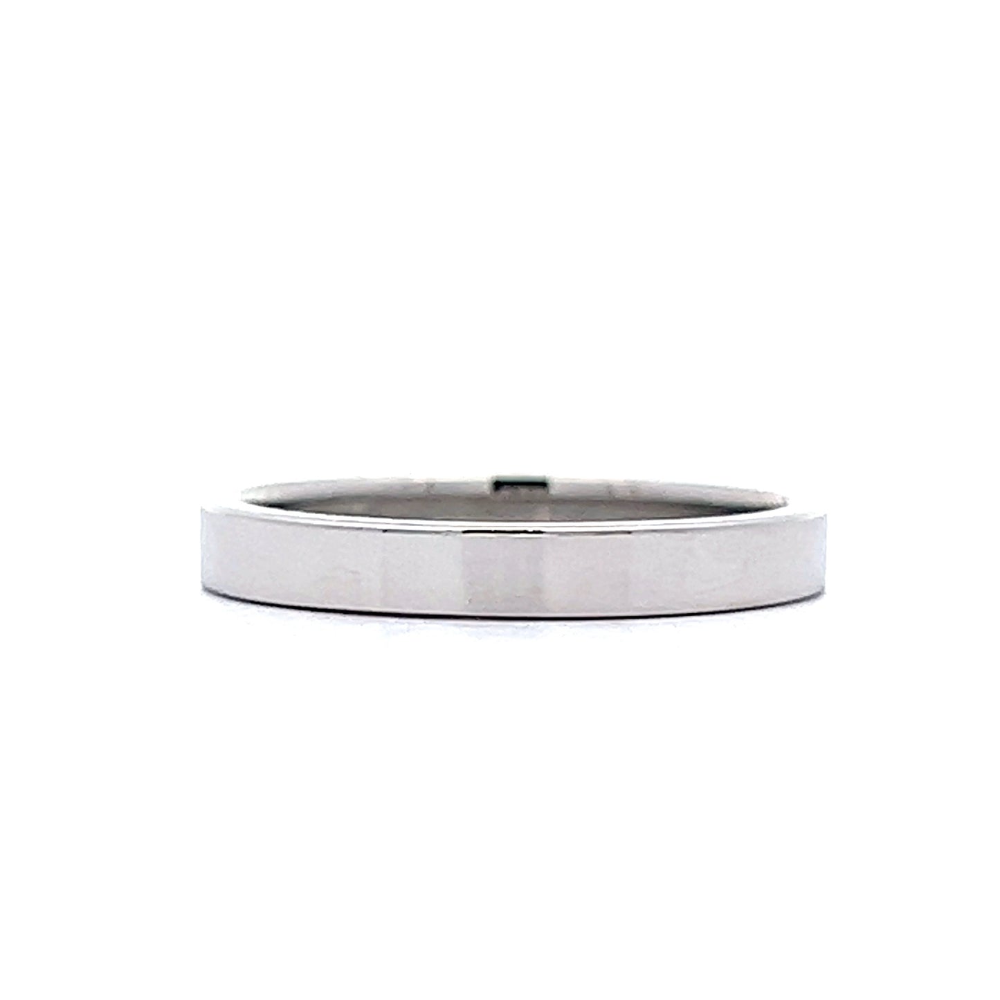 This unisex wedding band features a narrow flat edge in high polish platinum. Minimal shimmering. Platinum wedding bands are durable and stylish. A classic ring that is comfortable for everyday wear.