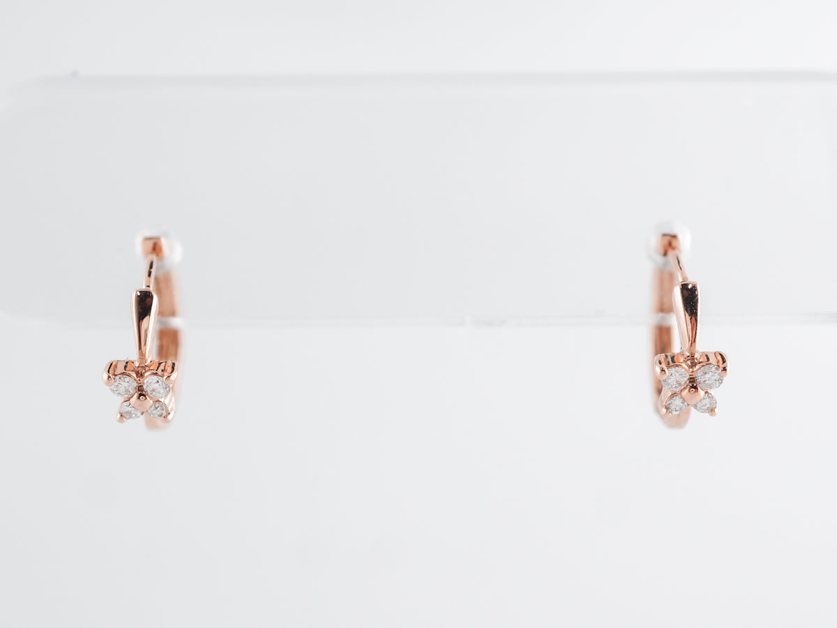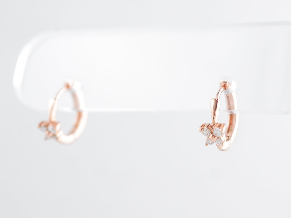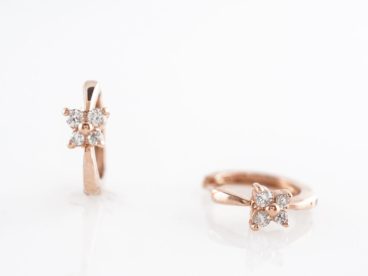 Small Hoop Diamond Earrings in 14k Rose Gold. These delightful little hoop earrings have a small diamond cluster containing .10 carats of round brilliant diamonds set in 14 karat rose gold. A great pair if you arent going for the flashiest look, and want to be able to wear them just about anywhere.