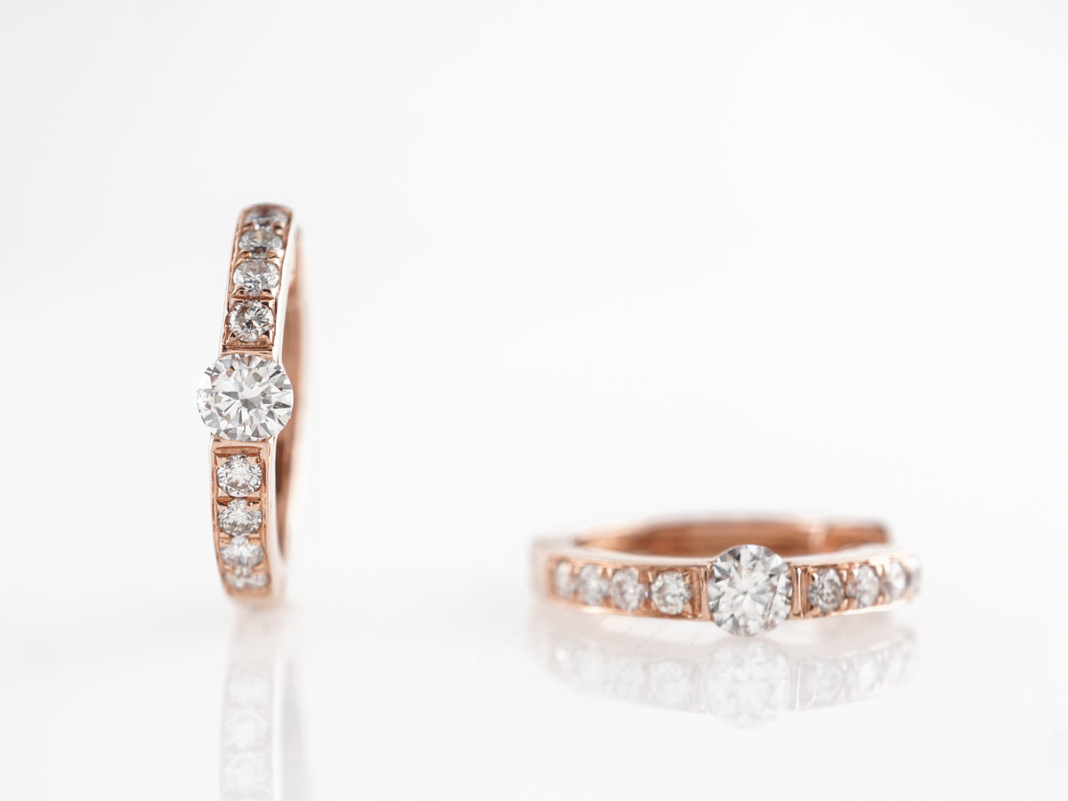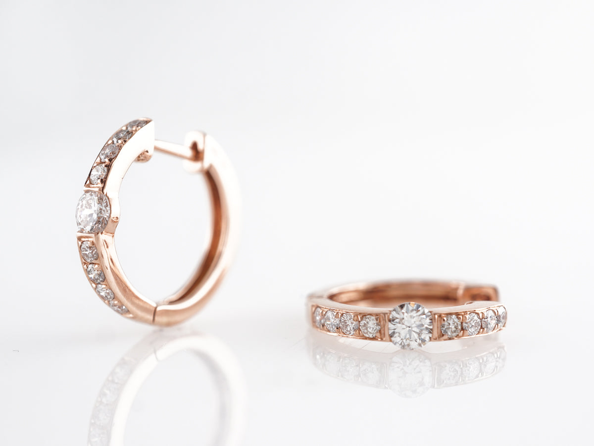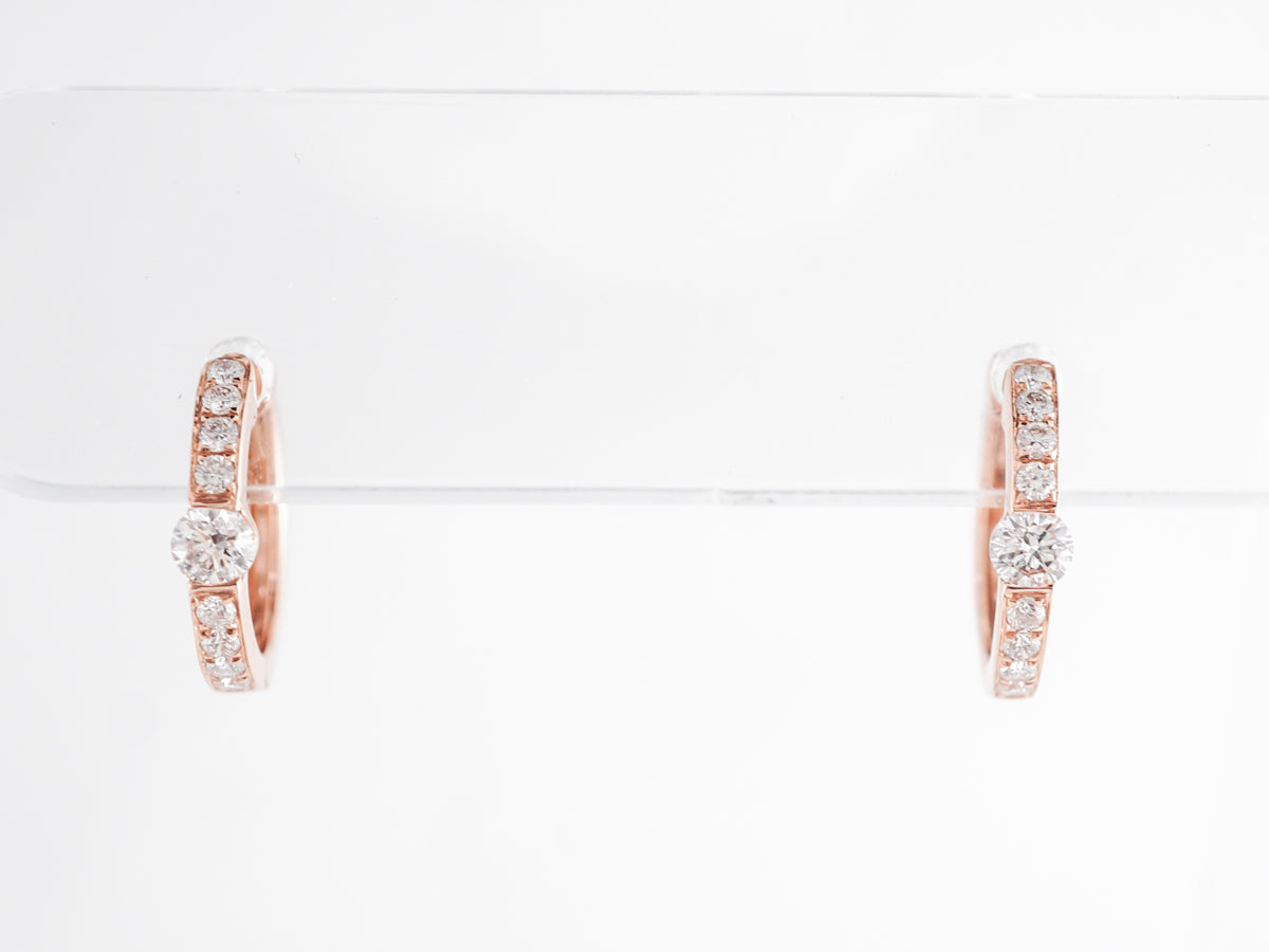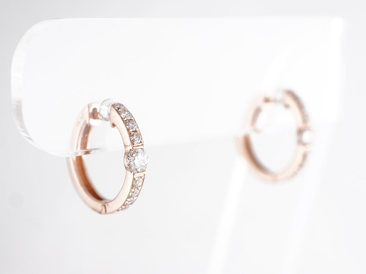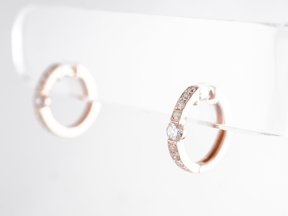 Small Hoop Earrings w/ Diamonds in 14k Rose Gold. These cute little hoop earrings feature .39 carats of round brilliant cut diamonds set in 14 karat rose gold. Small enough to wear while youre active, everyone needs a cute pair of everyday earrings like this!