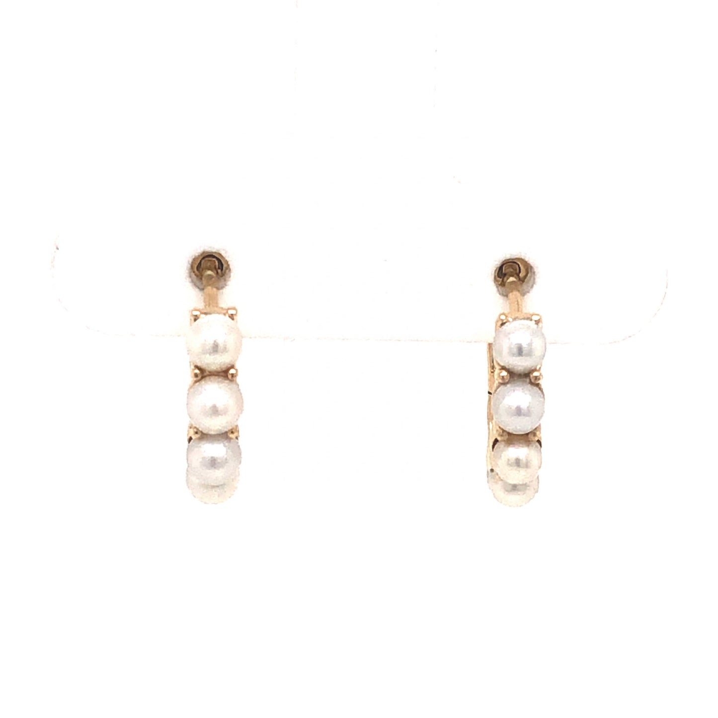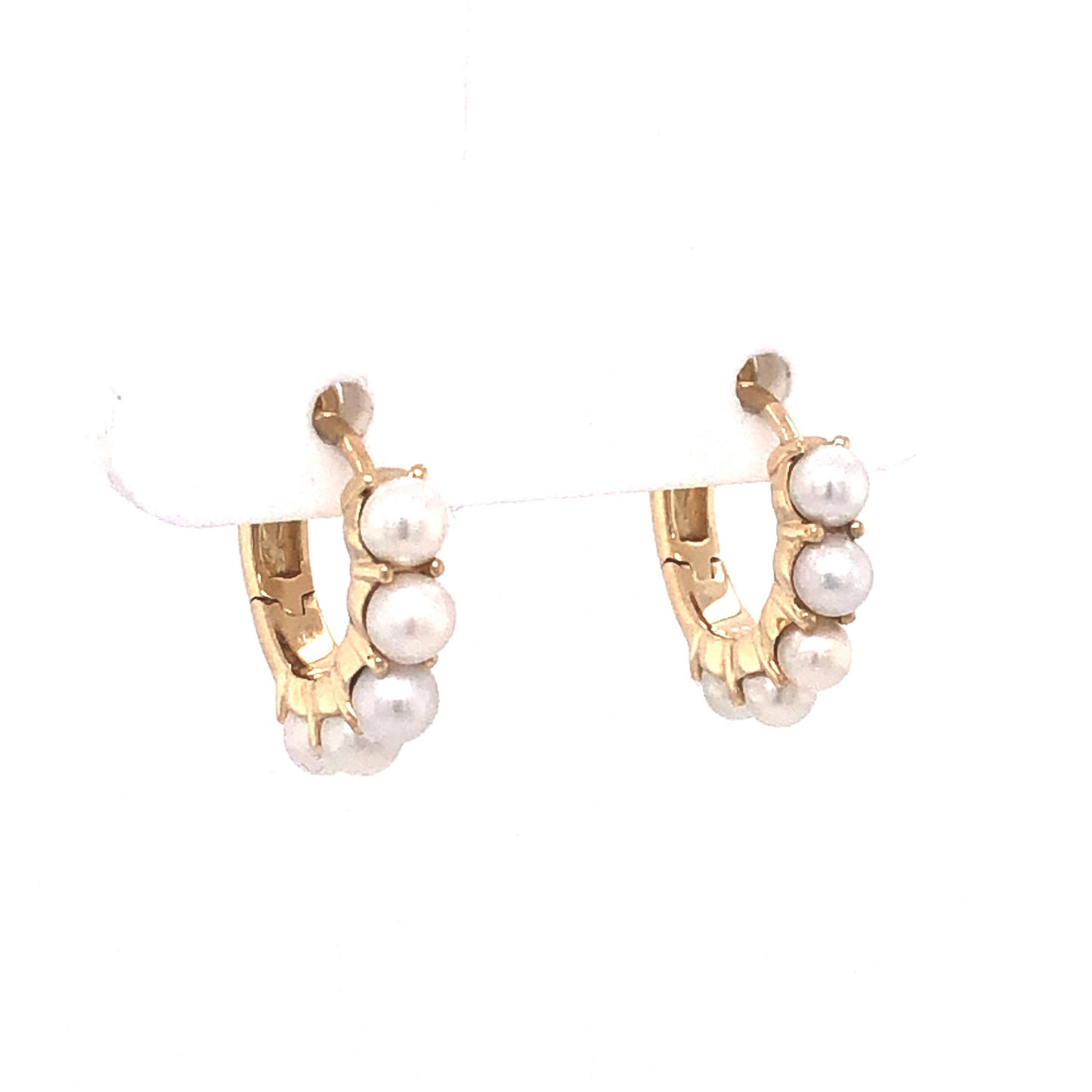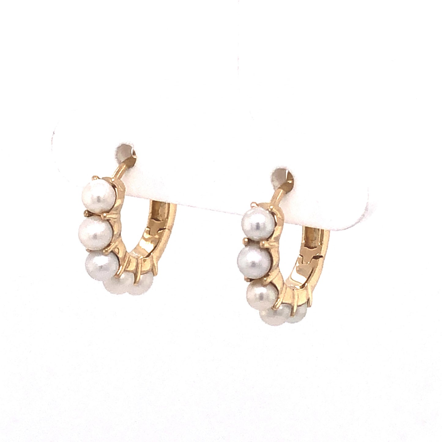 Small Pearl Hoop Earrings in 14k Yellow Gold. Add some style and flair to your jewelry collection with these small pearl hoop earrings! The pearls are bead set on the front half of the 14k yellow gold hoops. Wear these hoops on their own or pair with some golden studs for a timeless look. A pearl lovers dream!