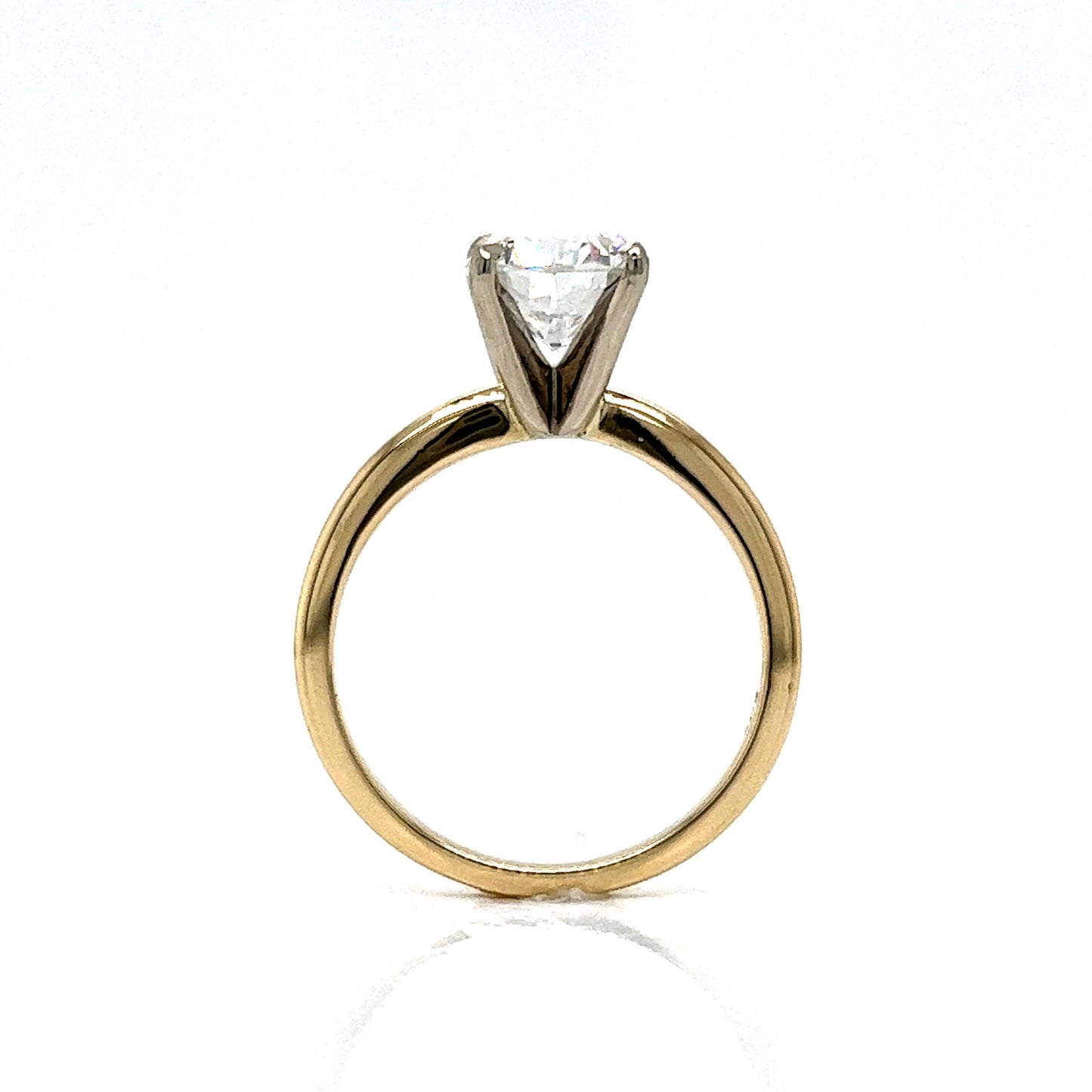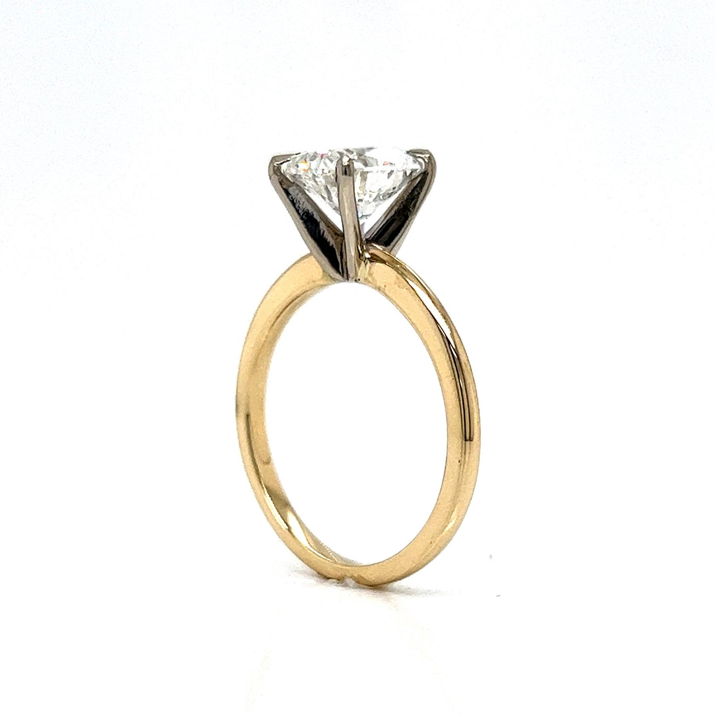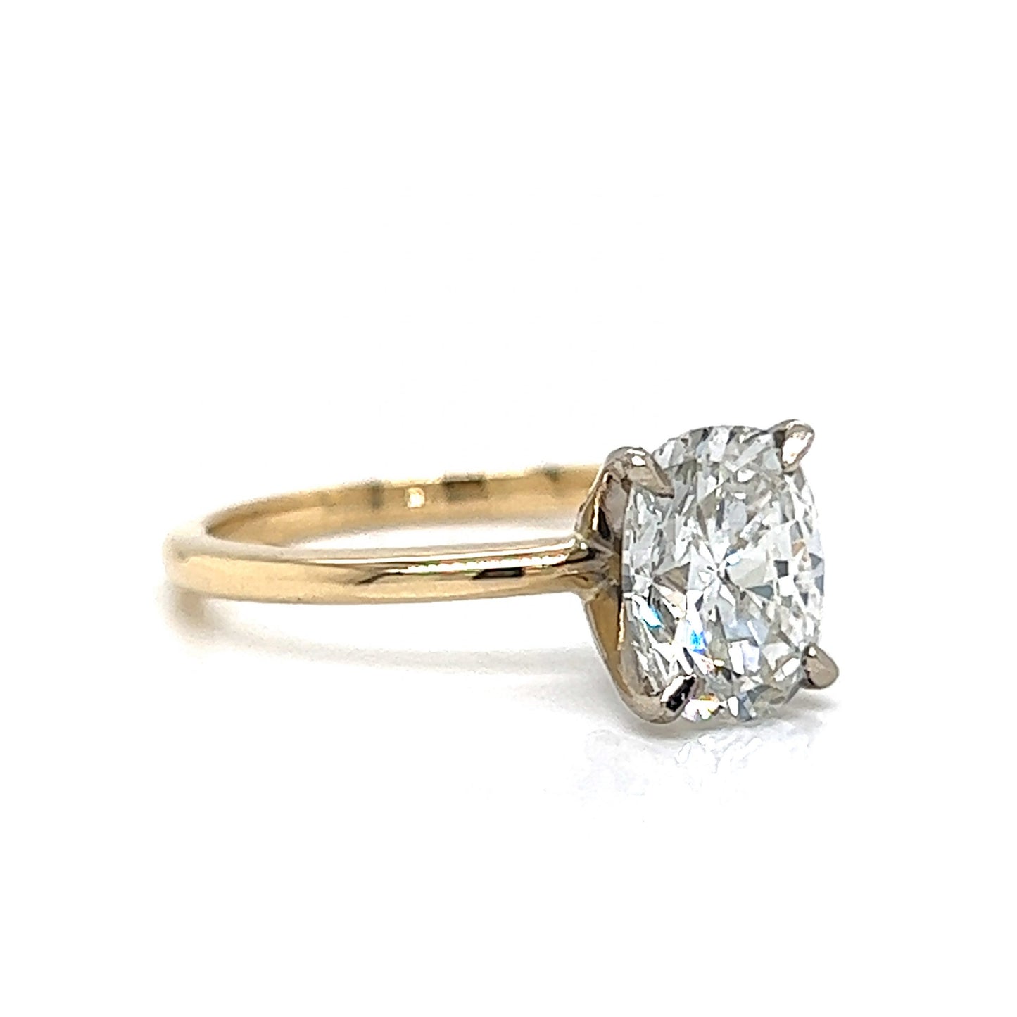 Your dream engagement ring is here! This timeless solitaire diamond engagement ring features a GIA-certified 2.12 carat cushion cut diamond in 14 karat yellow and 14 karat white gold. Featuring an impressive near colorless (G) color grading, the GIA-certified diamond is set in four secure claw prongs. Highly brilliant and alluring in design. The prongs are composed of 14 karat white gold. Finished on a radiant 14 karat yellow gold band. This dazzling engagement ring is fit for a queen. A perfect solitaire for a modern ceremony. Chic ideal to pair with any style of wedding band.
