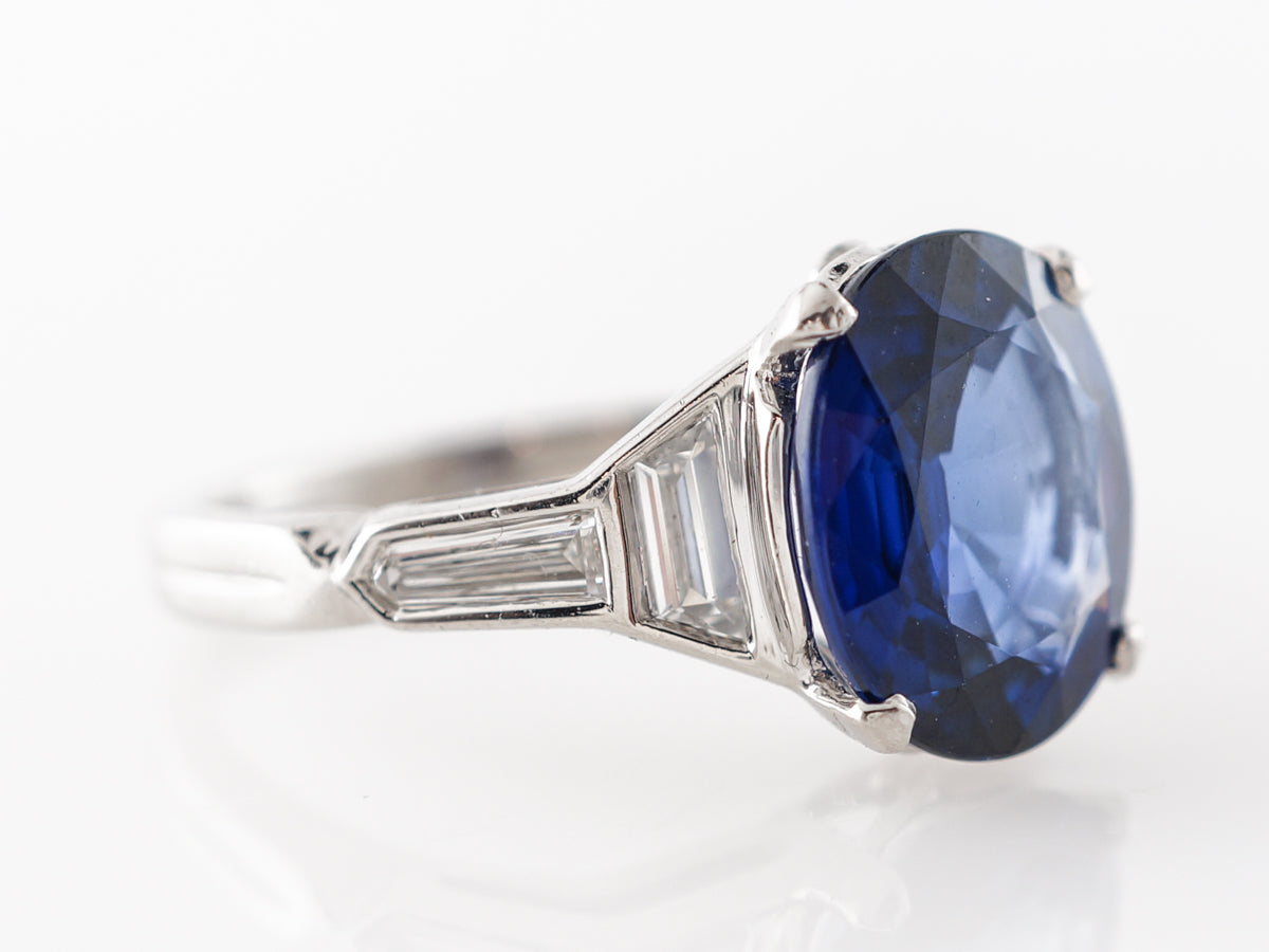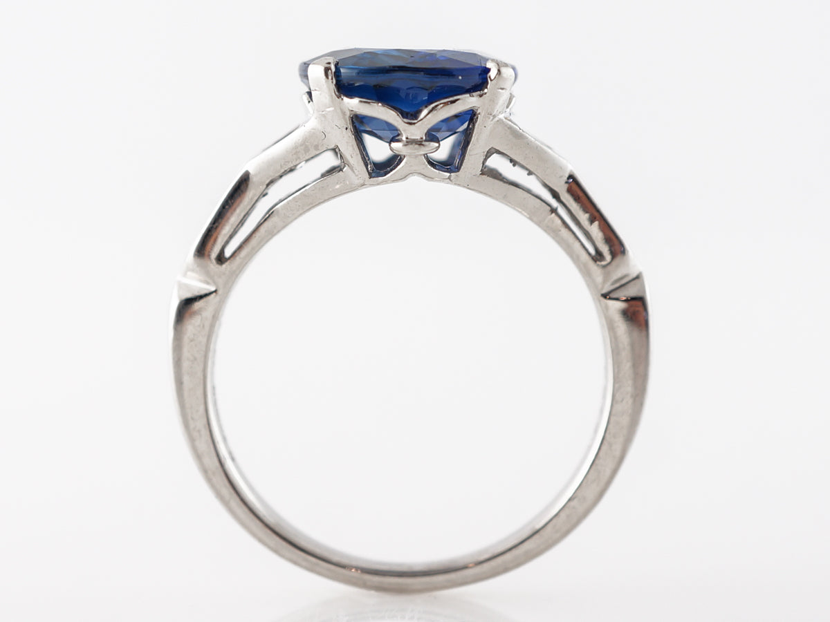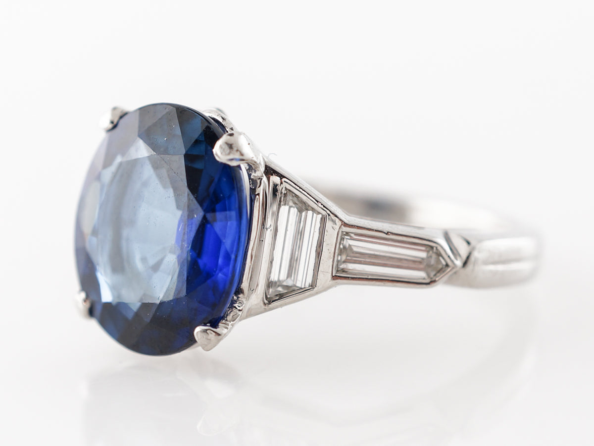 Solitaire Cushion Cut Sapphire Engagement Ring in Platinum. This modern engagement ring features a magnificent 4.45 carat cushion cut sapphire with .42 carats of accent diamonds and is set in platinum. The classy design of the ring starts at the incredible sapphire which is then flanked by trapezoid diamonds that run into baguette cuts. The shoulder accents are laid out in such a clever and deliberate design all of the stones look like they were meant to be next to one another. If you are looking for a striking sapphire engagement ring, you cant do much better than this ring.