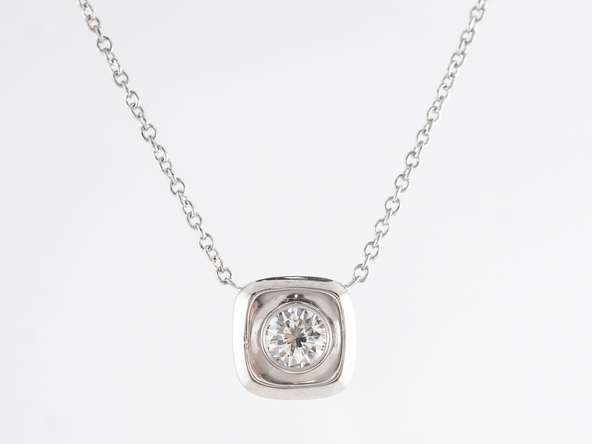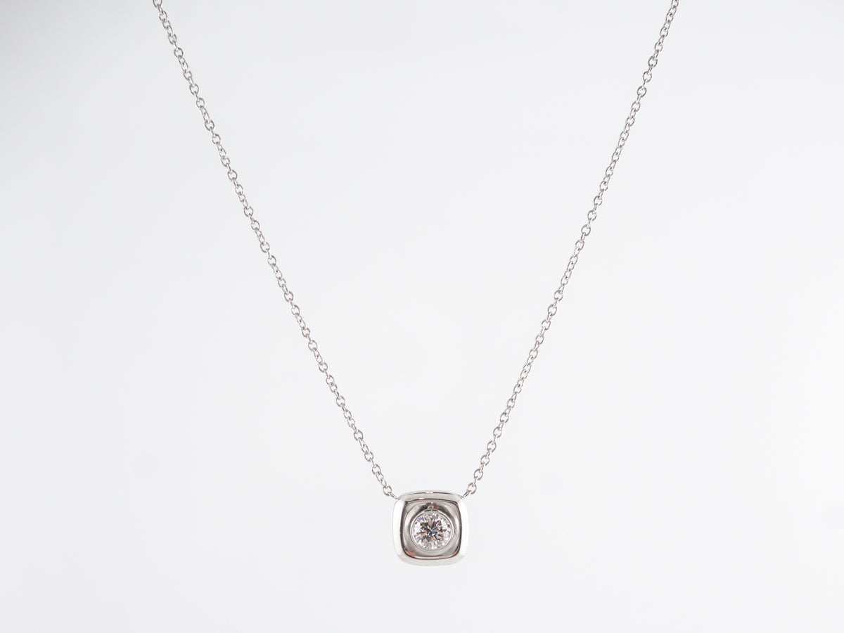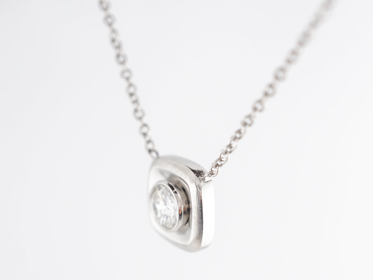Solitaire Diamond Pendant in Platinum w/ 18k White Gold Chain. This fine modern necklace features a .27 carat round brilliant cut diamond set in platinum. The chain measures 18 inches and is made of 18K white gold. The diamond is bezel set and sits inside the polished platinum, shining brightly for all to see!