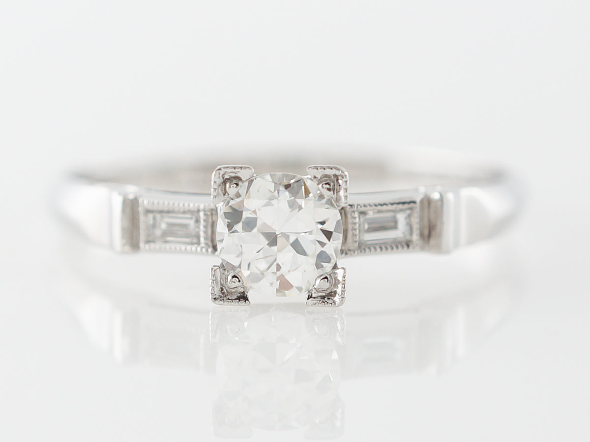 Solitaire Engagement Ring w/ Baguette Cut Diamonds Vintage Art Deco. This classic Art Deco diamond engagement ring is finished in platinum and is very clean and elegant. Featuring baguette diamonds in milgrained bezel settings on the shoulders and a bead set center stone with milgrain around each of the beads, this ring is a beautiful example of Art Deco design brilliance.