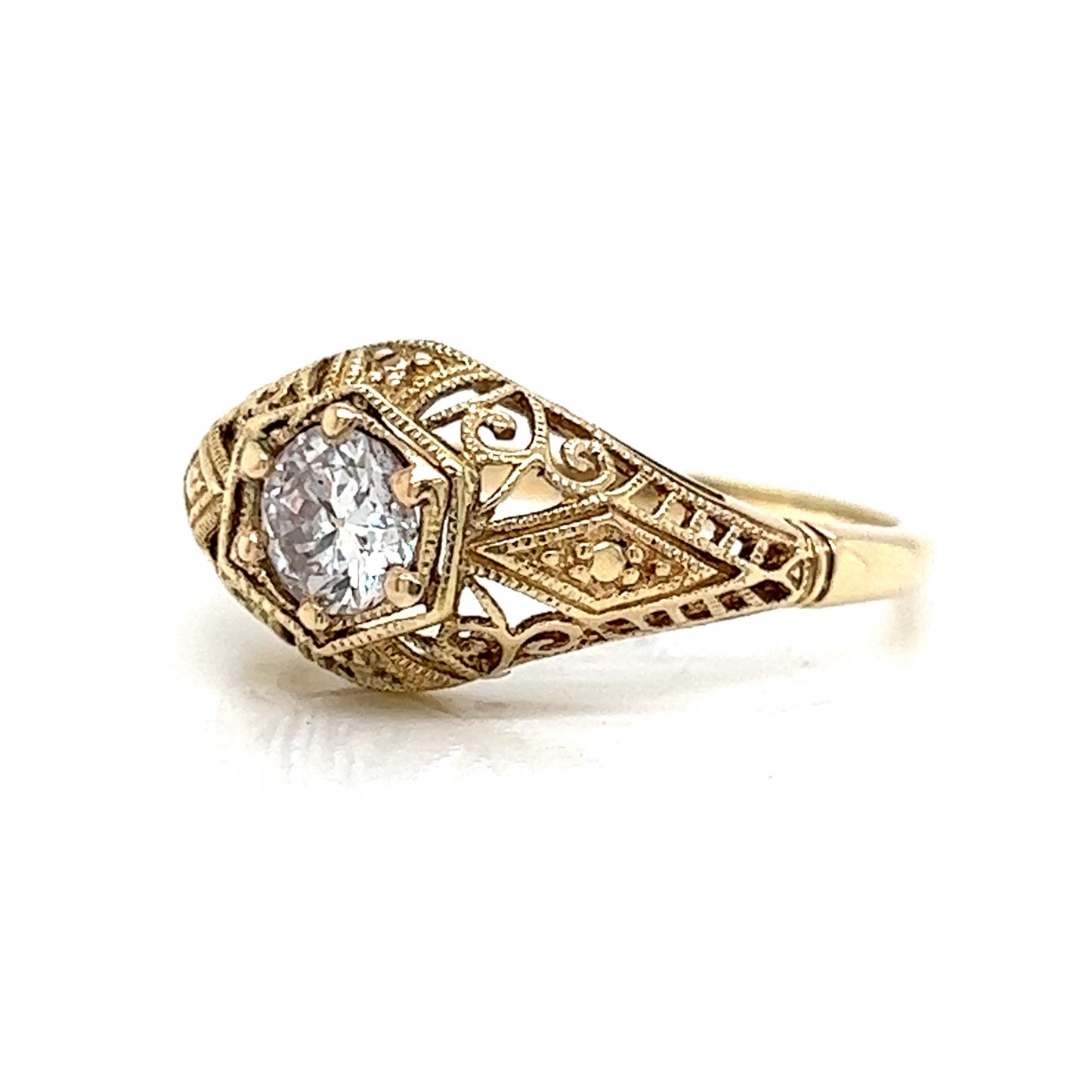 This Art Deco diamond engagement ring features a fiery .50 carat old European cut diamond. The center diamond is bead set on a geometric mounting with milgrain details. The vintage ring features decorative filigree metalwork that decorates the shoulders and gallery rail of the band. The solitaire near colorless diamond stands out against the 14 karat yellow gold composition. This one of a kind antique engagement ring is inspiring in both in brilliance and design.