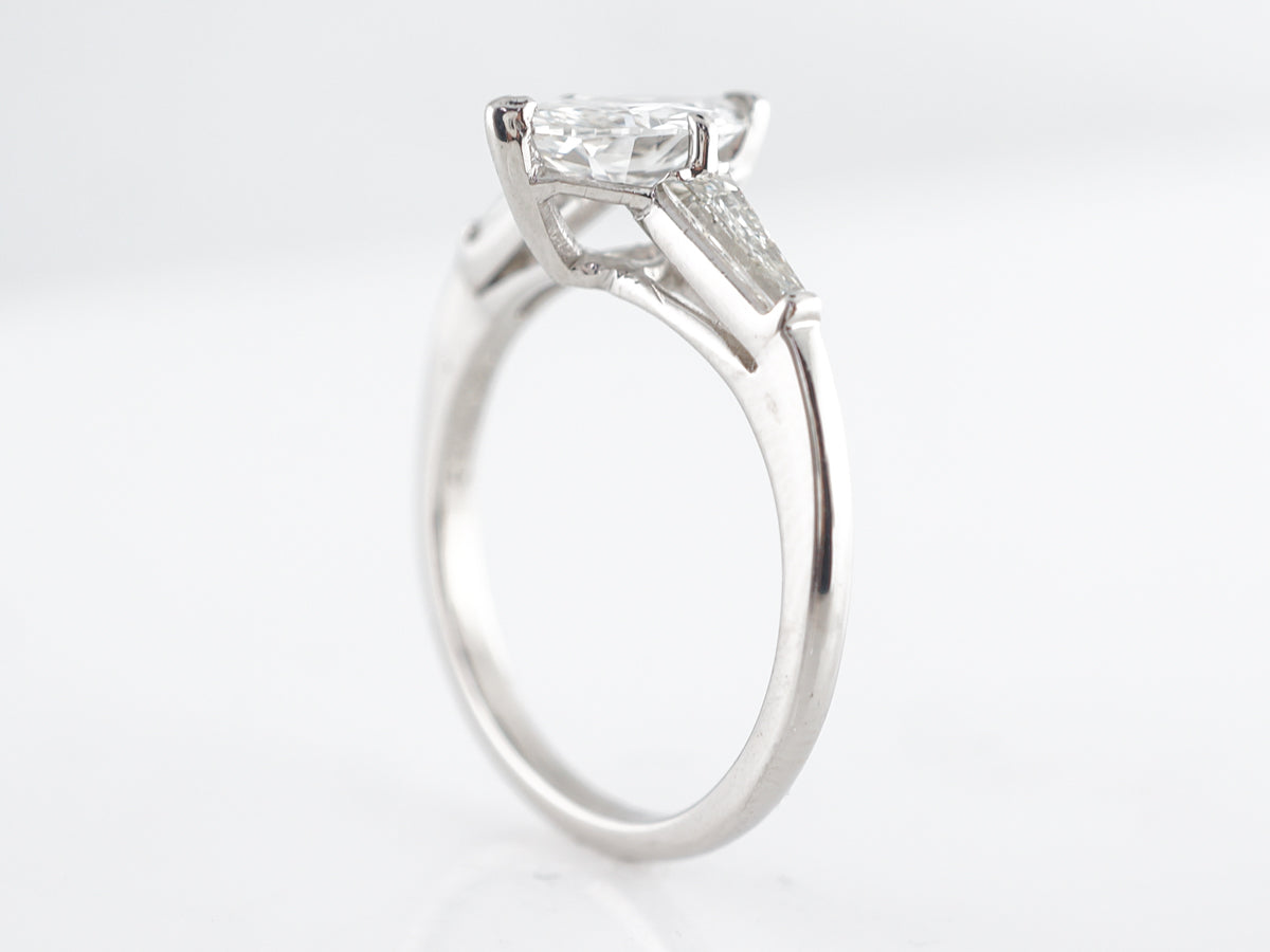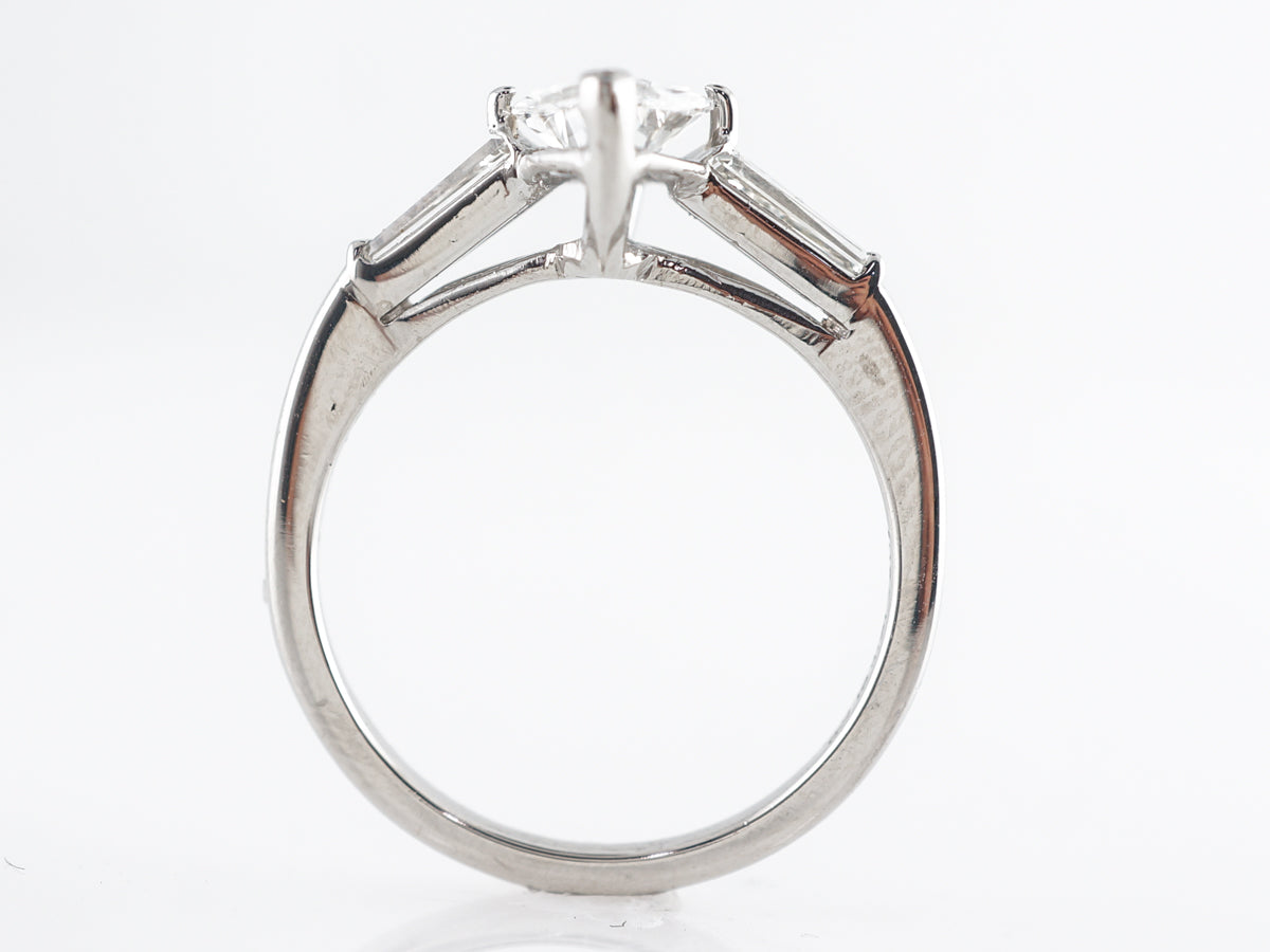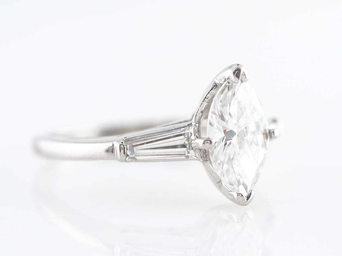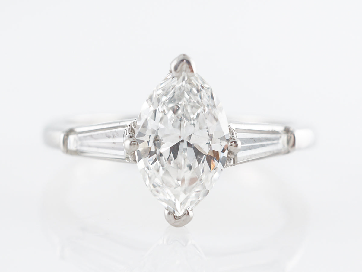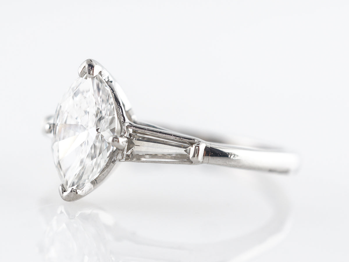 Solitaire Marquise Diamond Engagement Ring in Platinum. This modern engagement ring features a .93 carat marquise cut diamond set in platinum. The marquise cut has recently seen a surge in popularity. A rather shallow cut, marquise diamonds often appear larger than comparable weights of more traditional cuts. This stone is set on both sides by tapered baguettes to complete this beautiful look.