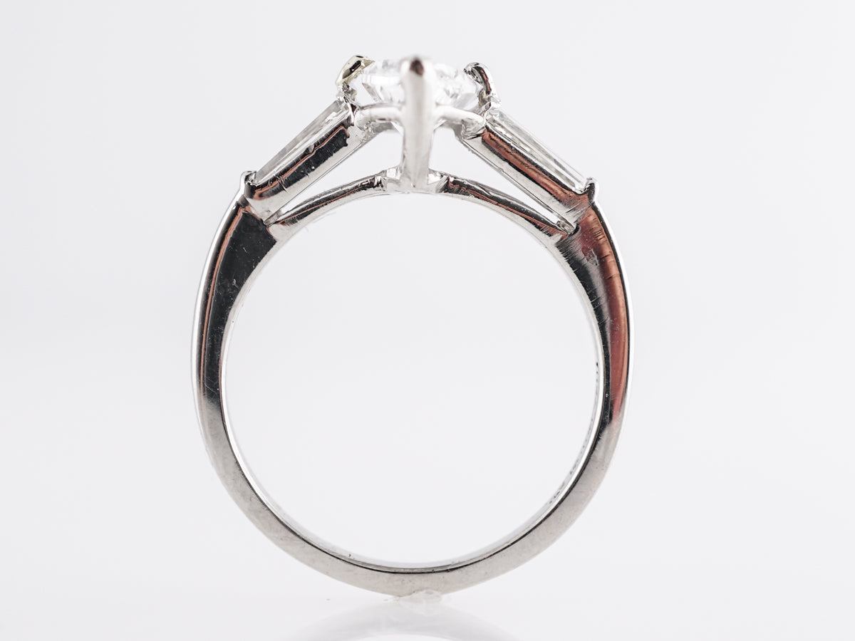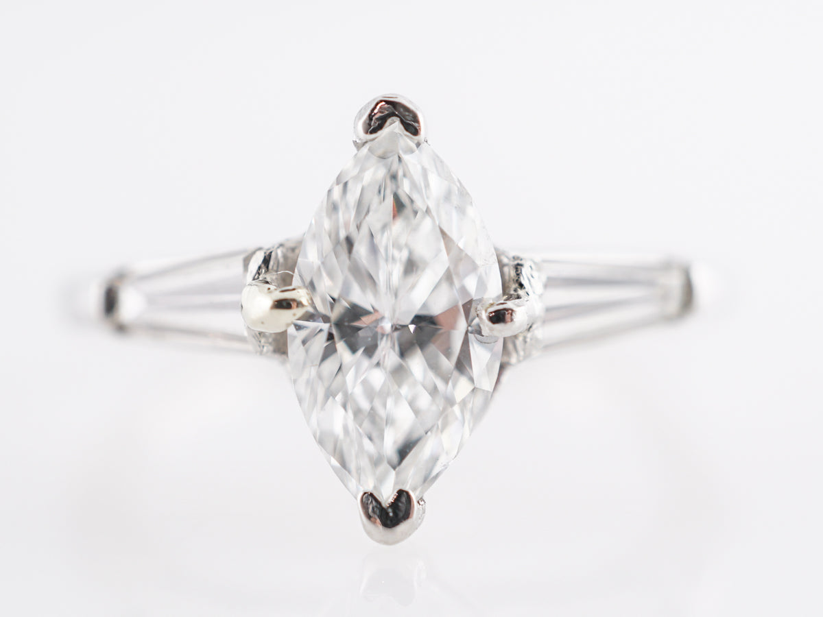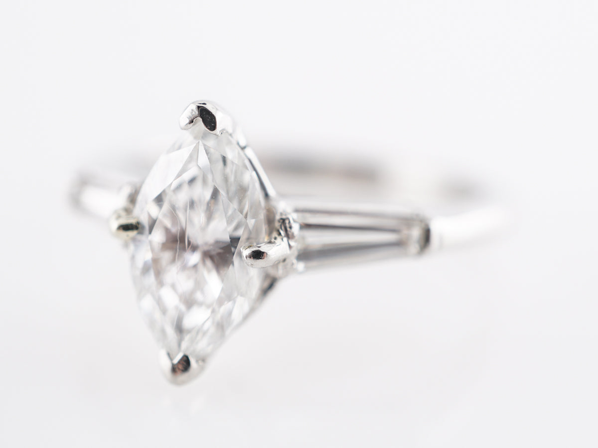 Solitaire Marquise Diamond Engagement Ring in Platinum. This modern engagement ring features a 1.00 carat marquise cut diamond set in platinum. The marquise cut has recently seen a surge in popularity. A rather shallow cut, marquise diamonds often appear larger than comparable weights of more traditional cuts. This stone is set on both sides by tapered baguettes to complete this beautiful look.
