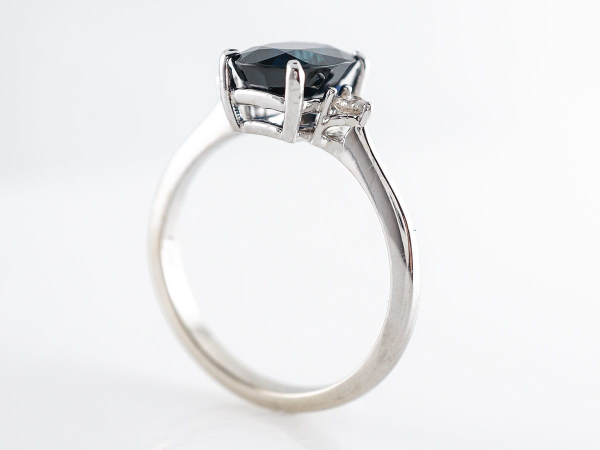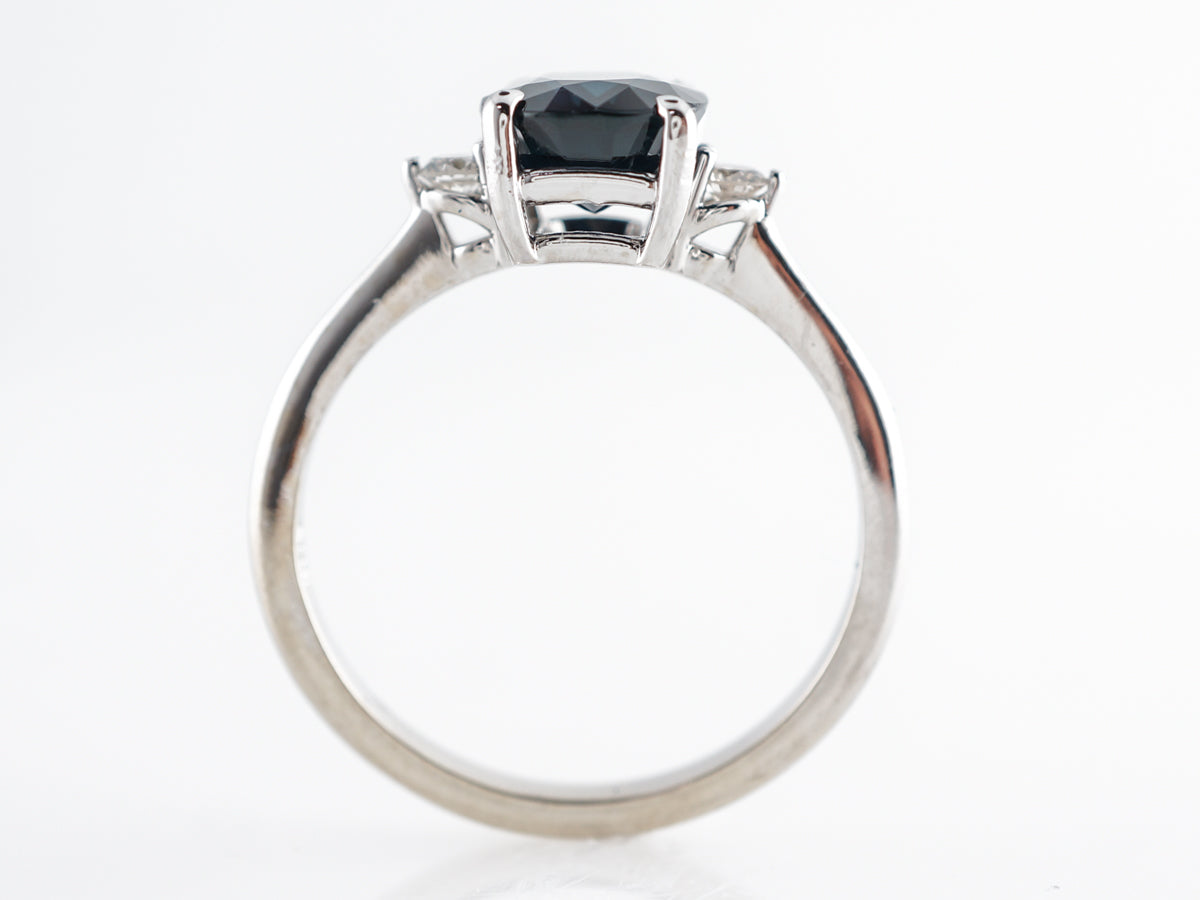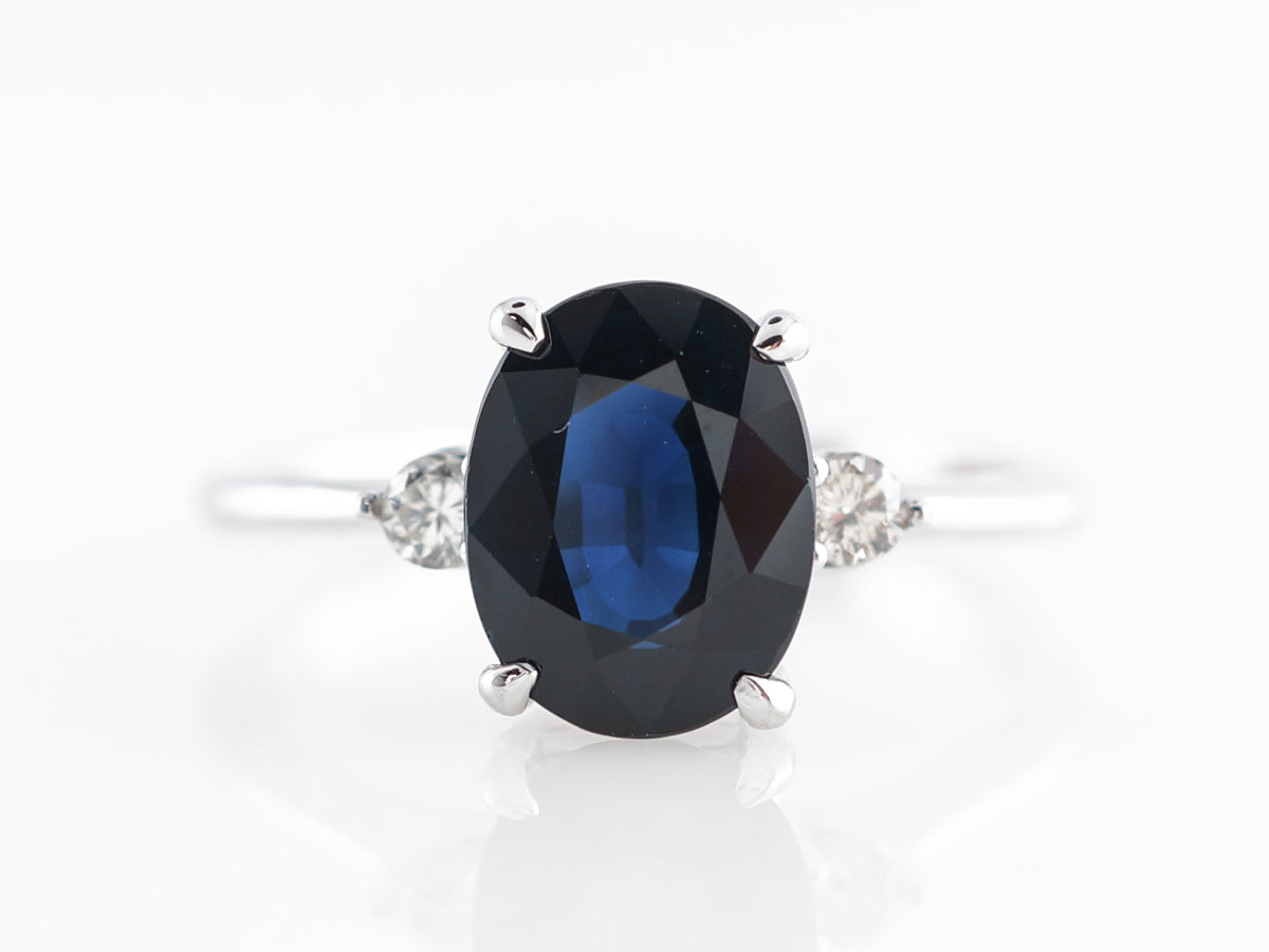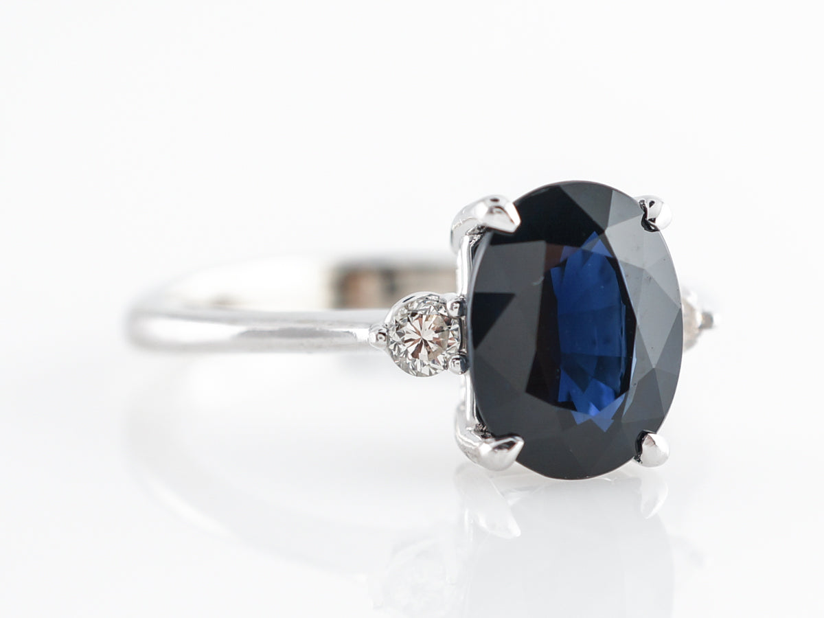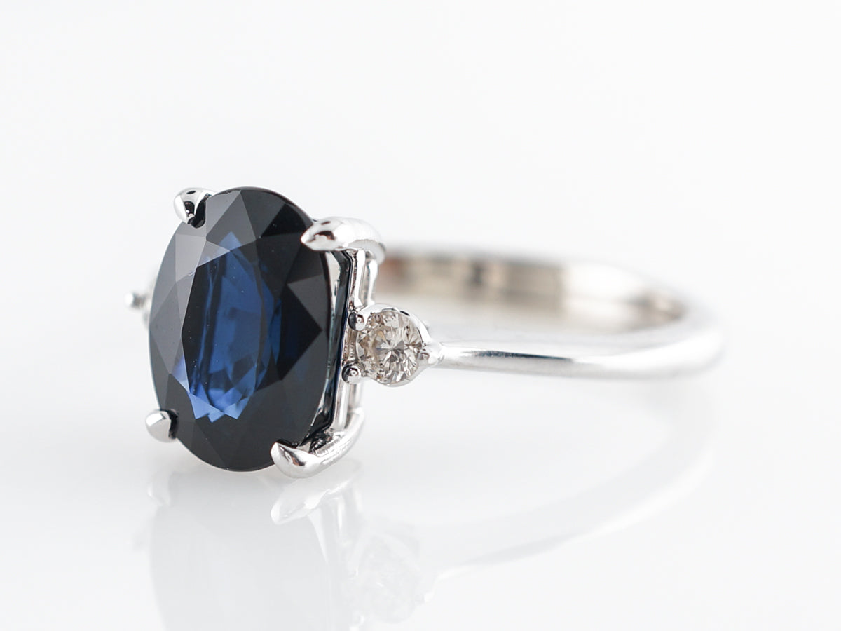 Solitaire Oval Sapphire Diamond Engagement Ring in White Gold. This modern engagement ring features a marvelous 2.39 carat oval cut sapphire set in 14 karat white gold. An elegant design with two small round diamonds flanking both sides of the sapphire. The deep blue color and beautiful faceting of this sapphire make this a very special ring.