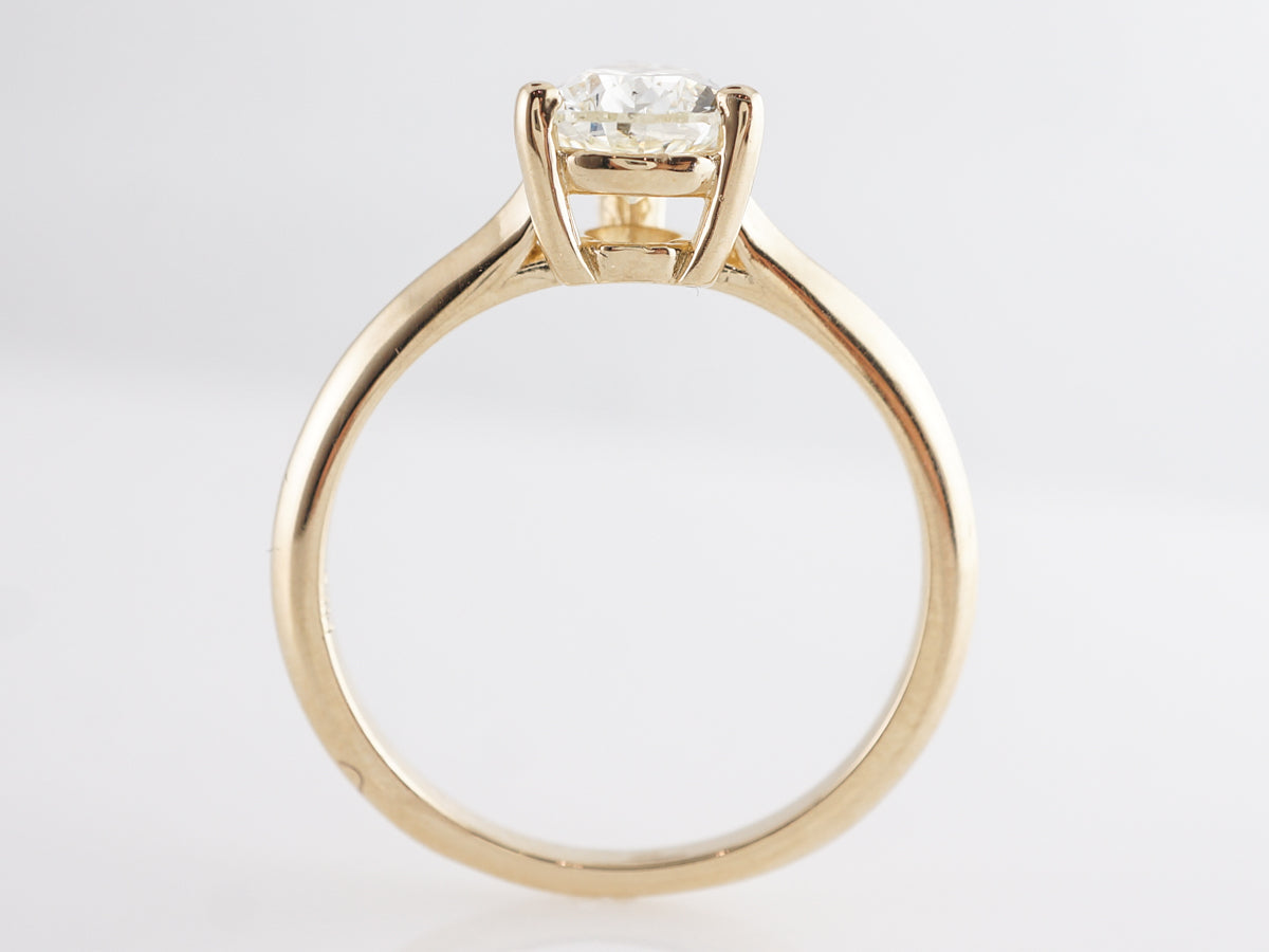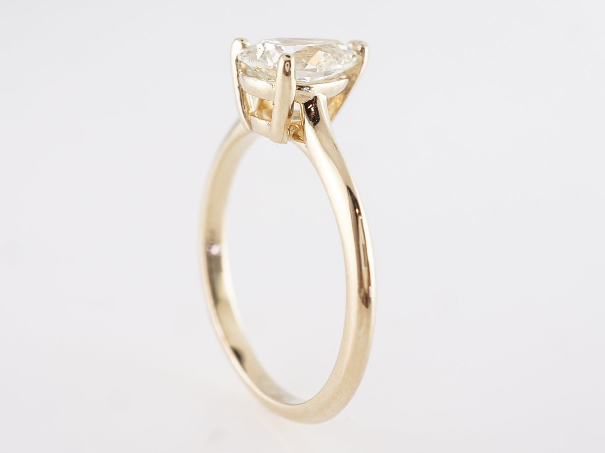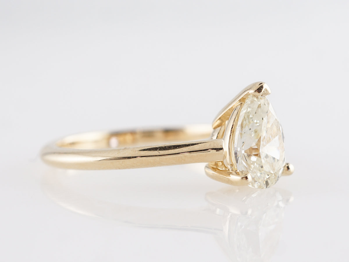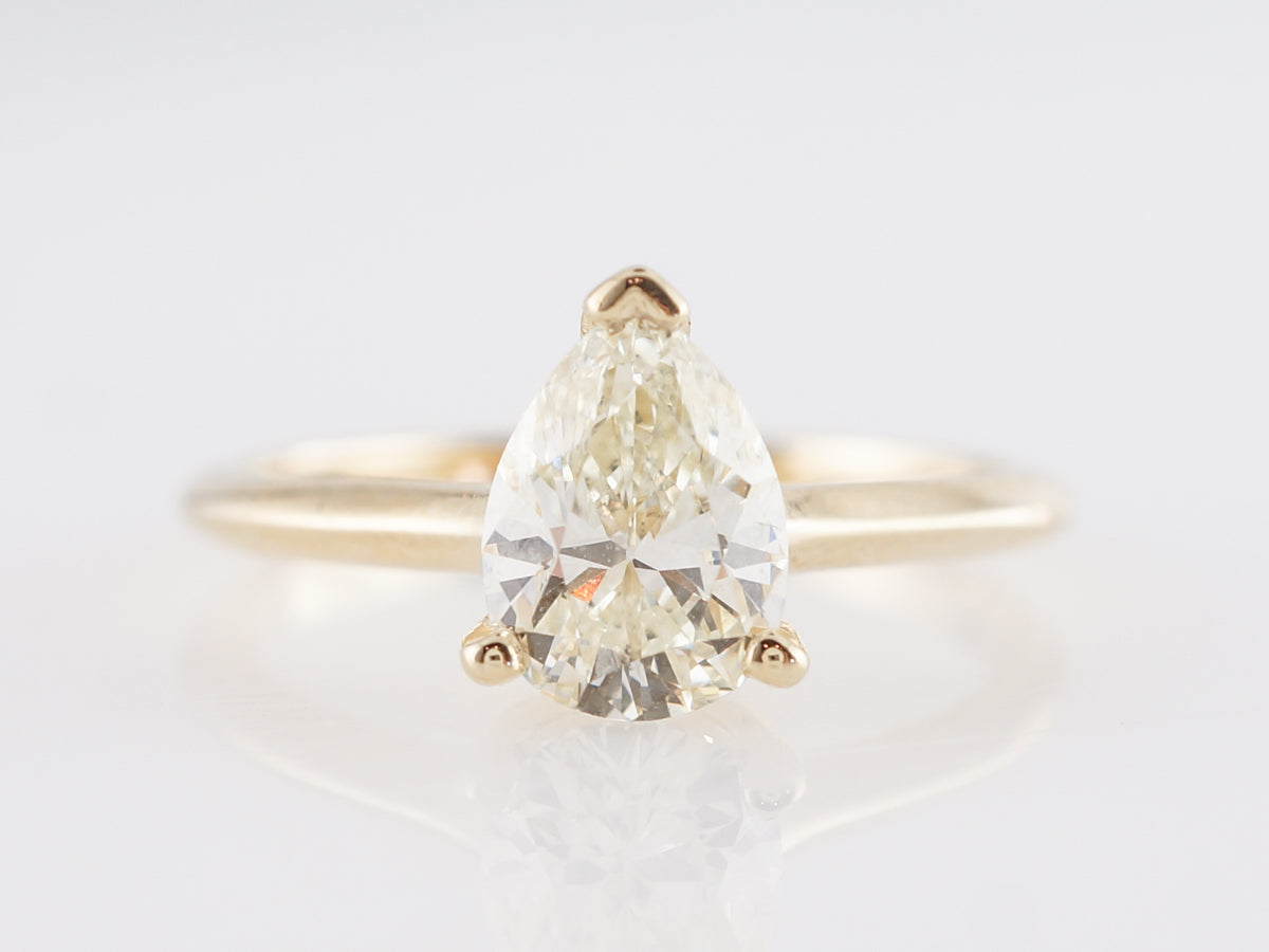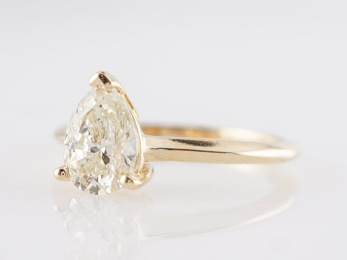 Solitaire Pear Cut Diamond Engagement Ring in 14k Yellow Gold. This fine modern solitaire engagement ring features a 1.20 carat pear cut diamond set in 14 karat yellow gold. The simple, charming appearance of this ring opens so many ways to accent it with just about any wedding band. Perfect for someone after a classic, minimalist bridal set.