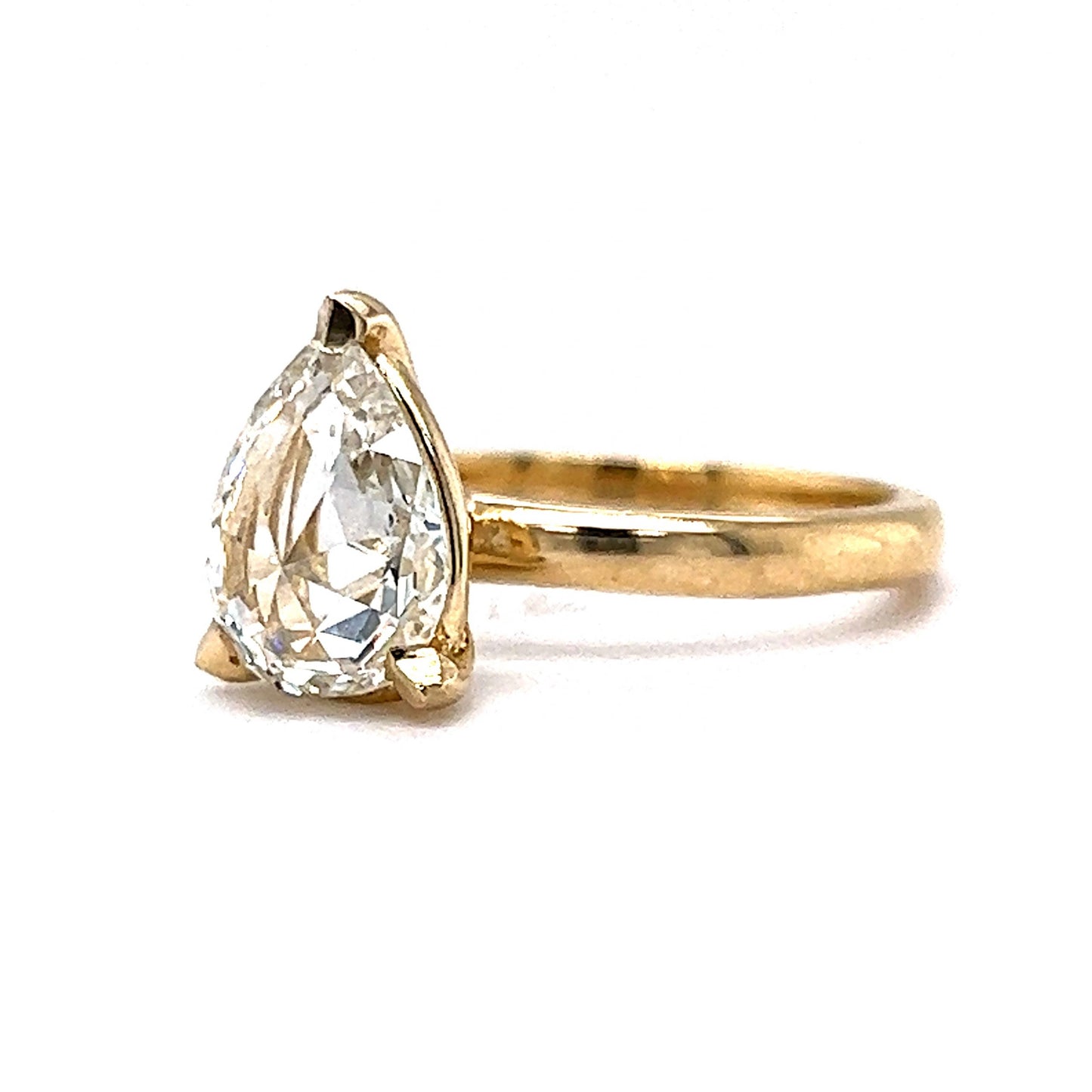 A breathtaking beauty! This sparkling solitaire diamond engagement ring features a modified brilliant 1.72 carat pear shape with what’s commonly known as rose cut faceting. This utterly unique estate diamond has been GIA-certified and set in a lovely, classic 14K yellow gold solitaire mounting. The pear diamond features a mixture of Round Brilliant and plump rose cut facets that allows for dimensional sparkle and fire when touched with light. A dream engagement ring for any bride!