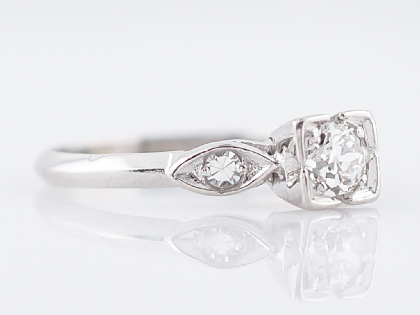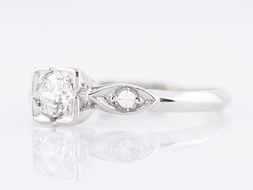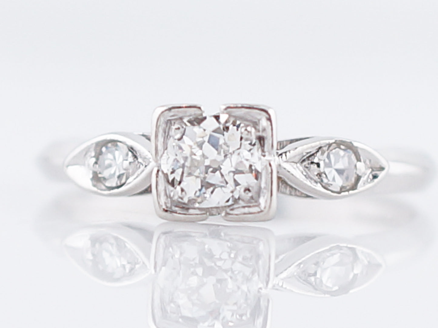 This square-and-marquise Art Deco engagement ring has a streamlined, classic design. The center stone is a .26 Old European cut diamond. Two (2) .03 carat single cut diamonds accent the center stone to each side and provide another layer of sparkle.