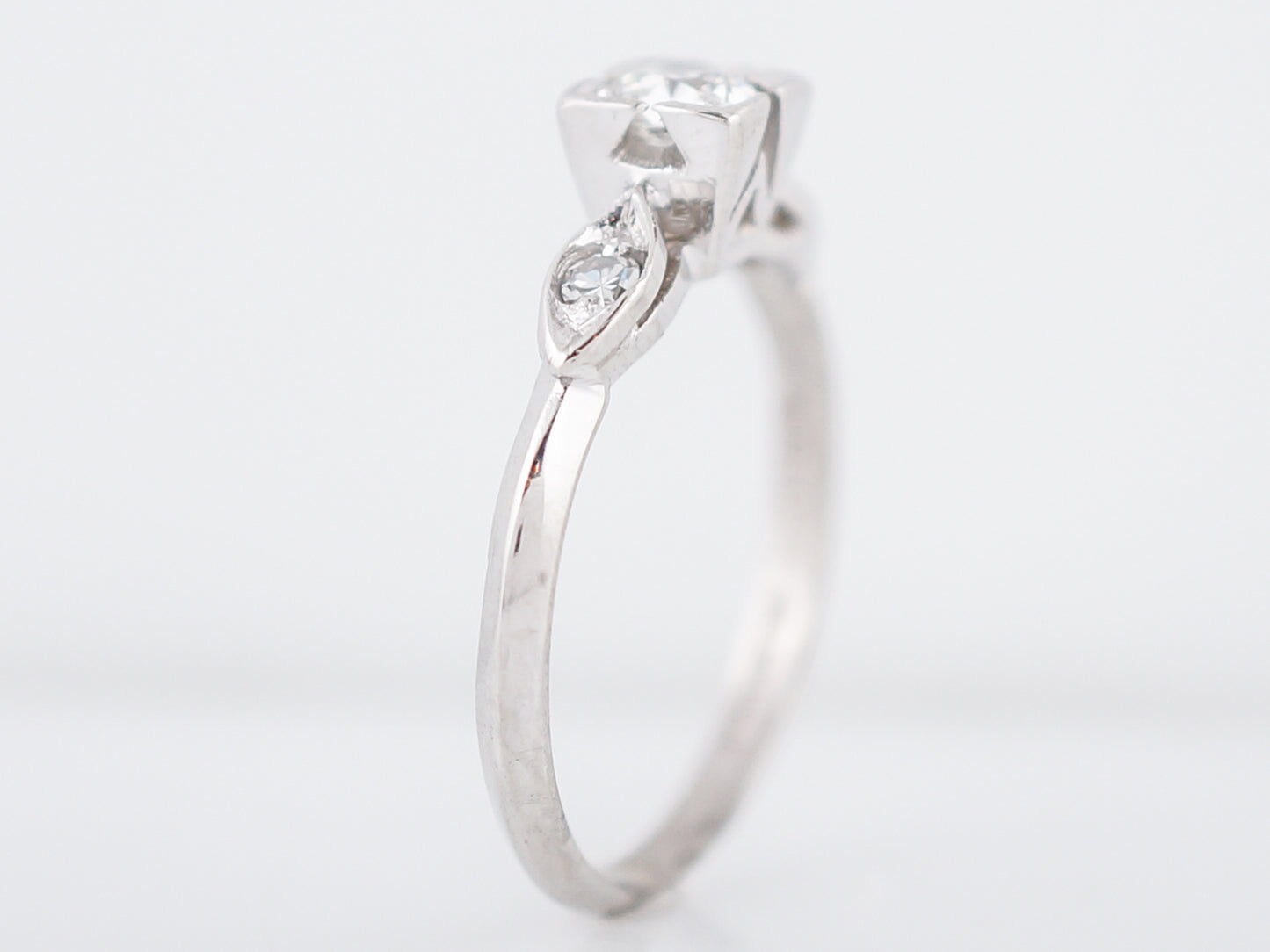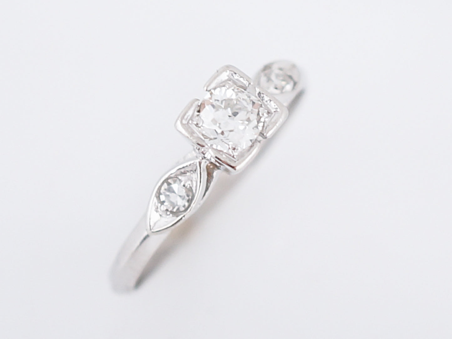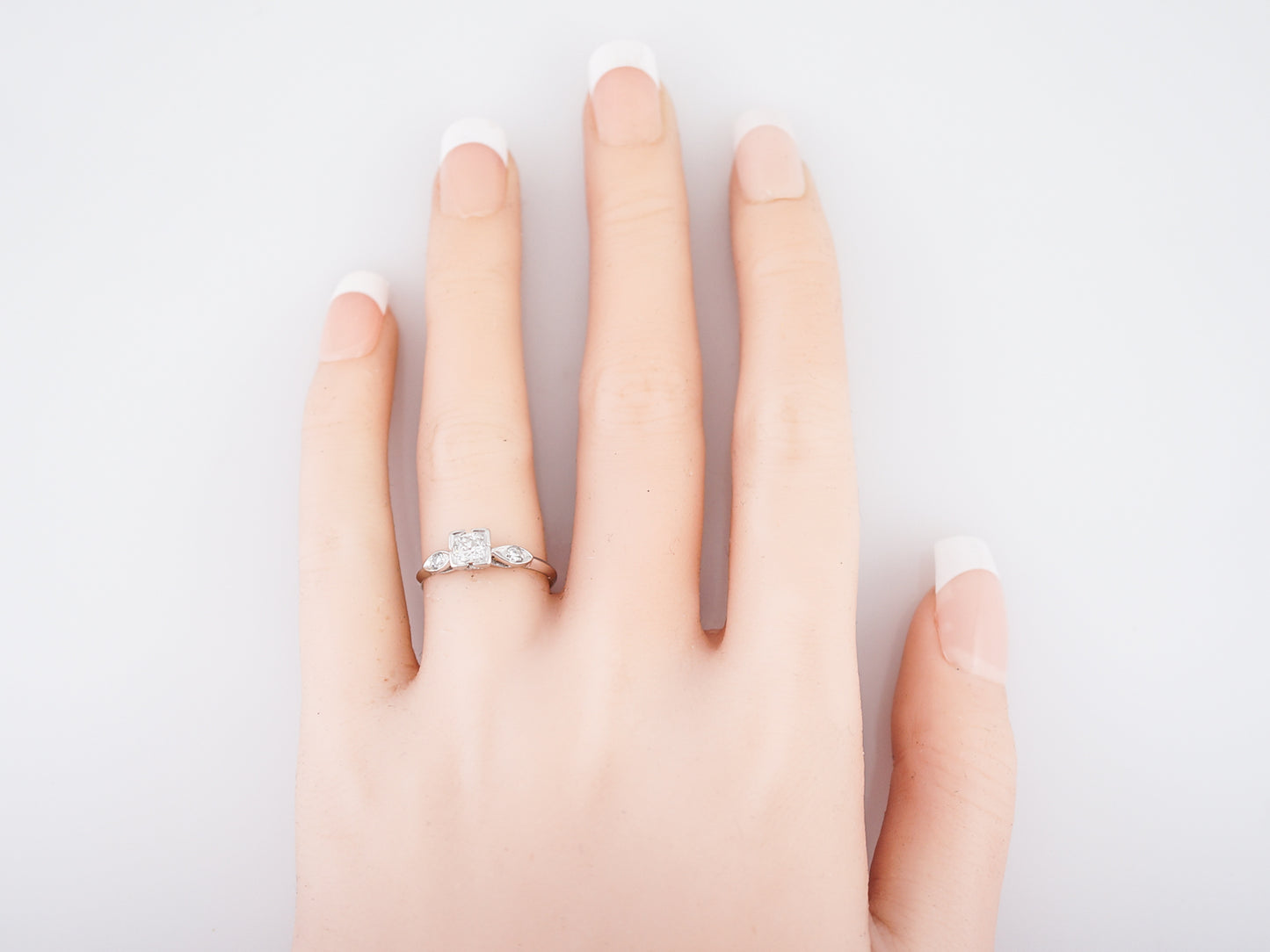 This square-and-marquise Art Deco engagement ring has a streamlined, classic design. The center stone is a .26 Old European cut diamond. Two (2) .03 carat single cut diamonds accent the center stone to each side and provide another layer of sparkle.
