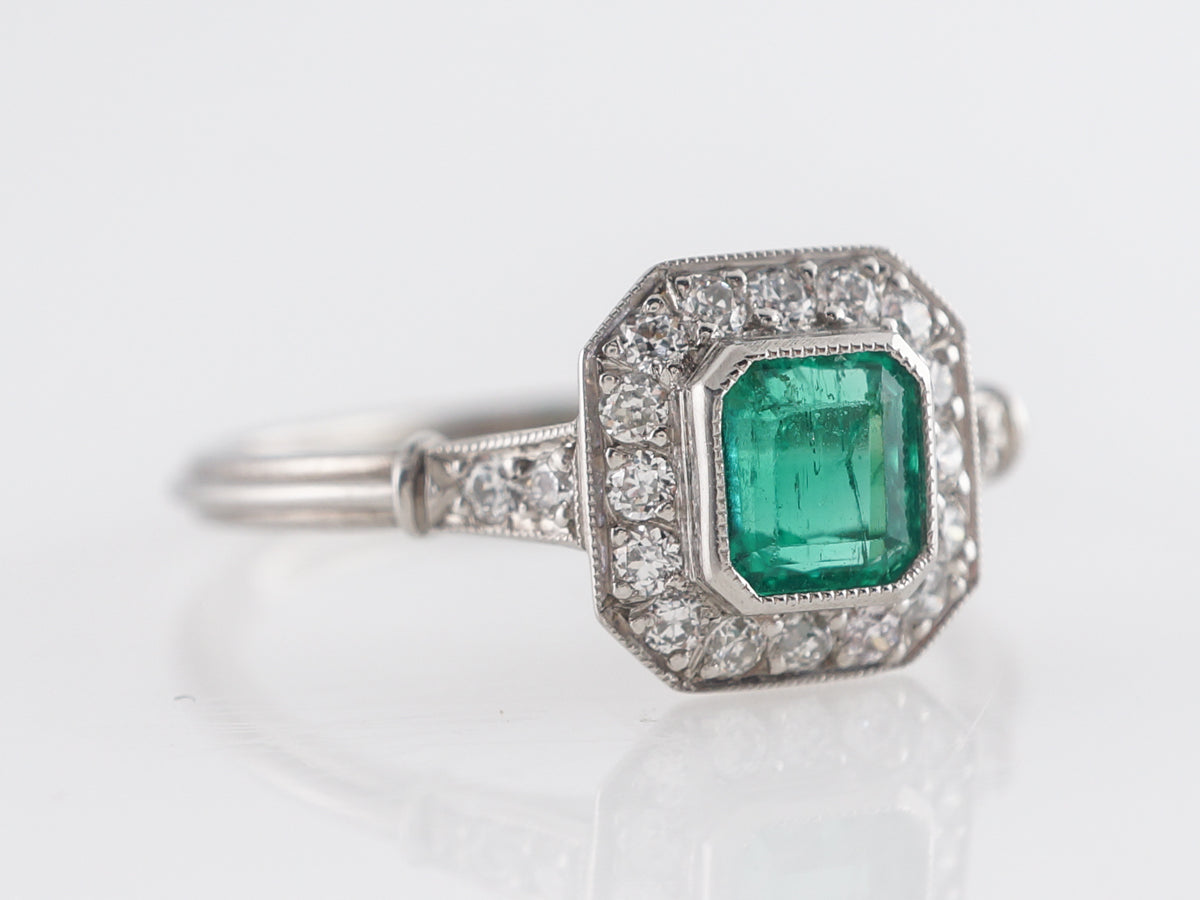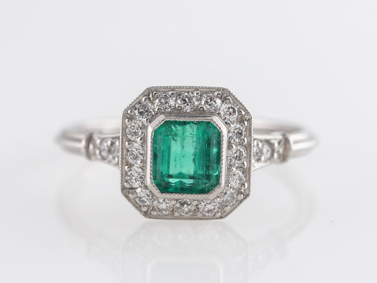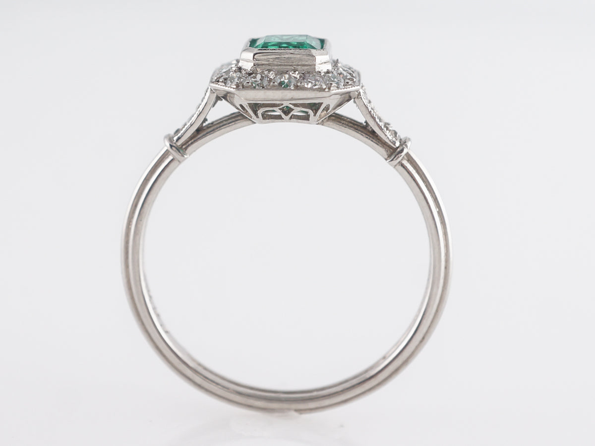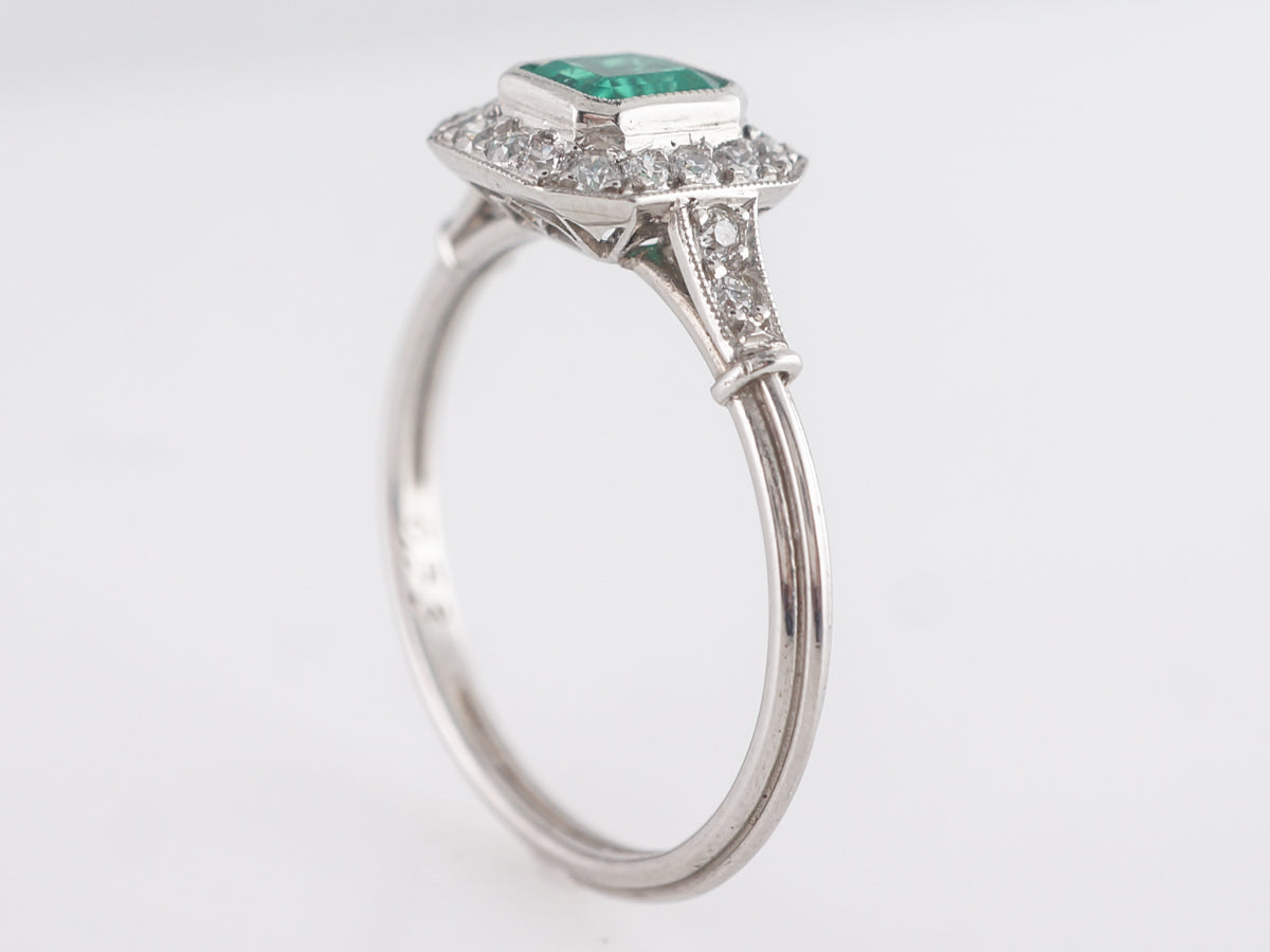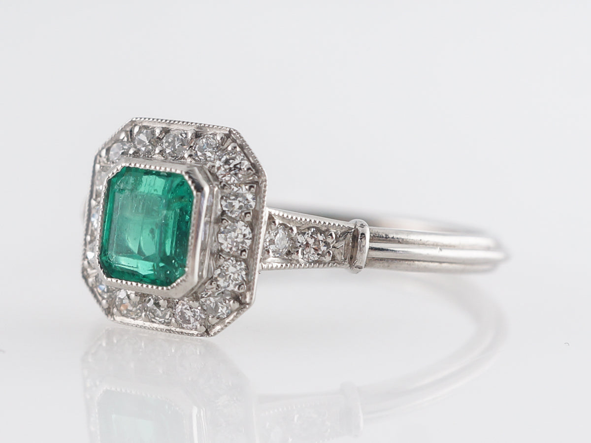 Square Emerald Cut Ring w/ Diamonds in Platinum. This ring features a .53ct natural emerald with accented diamonds framing the center stone. The natural emerald has beveled sides and a beautiful, rounded platinum band.