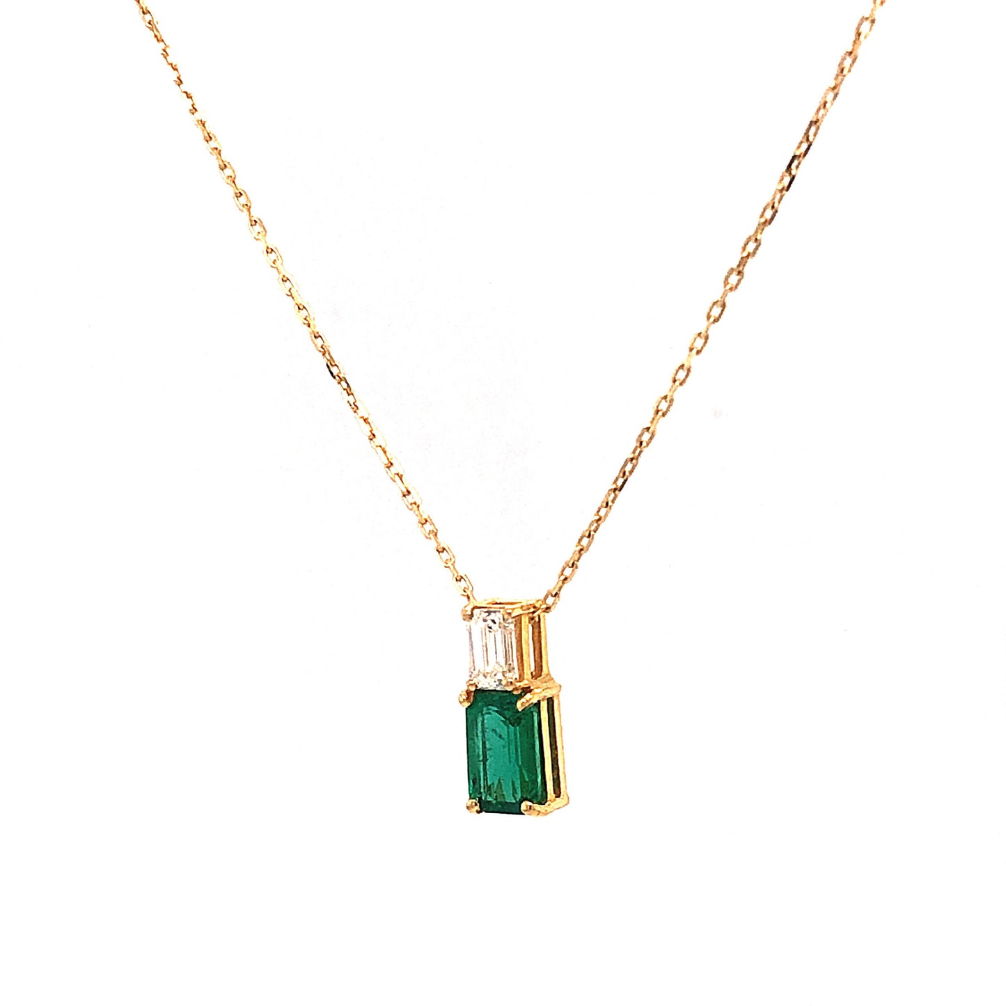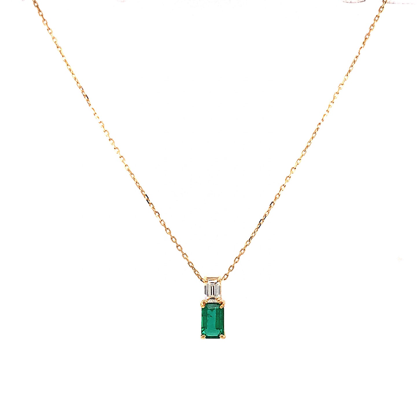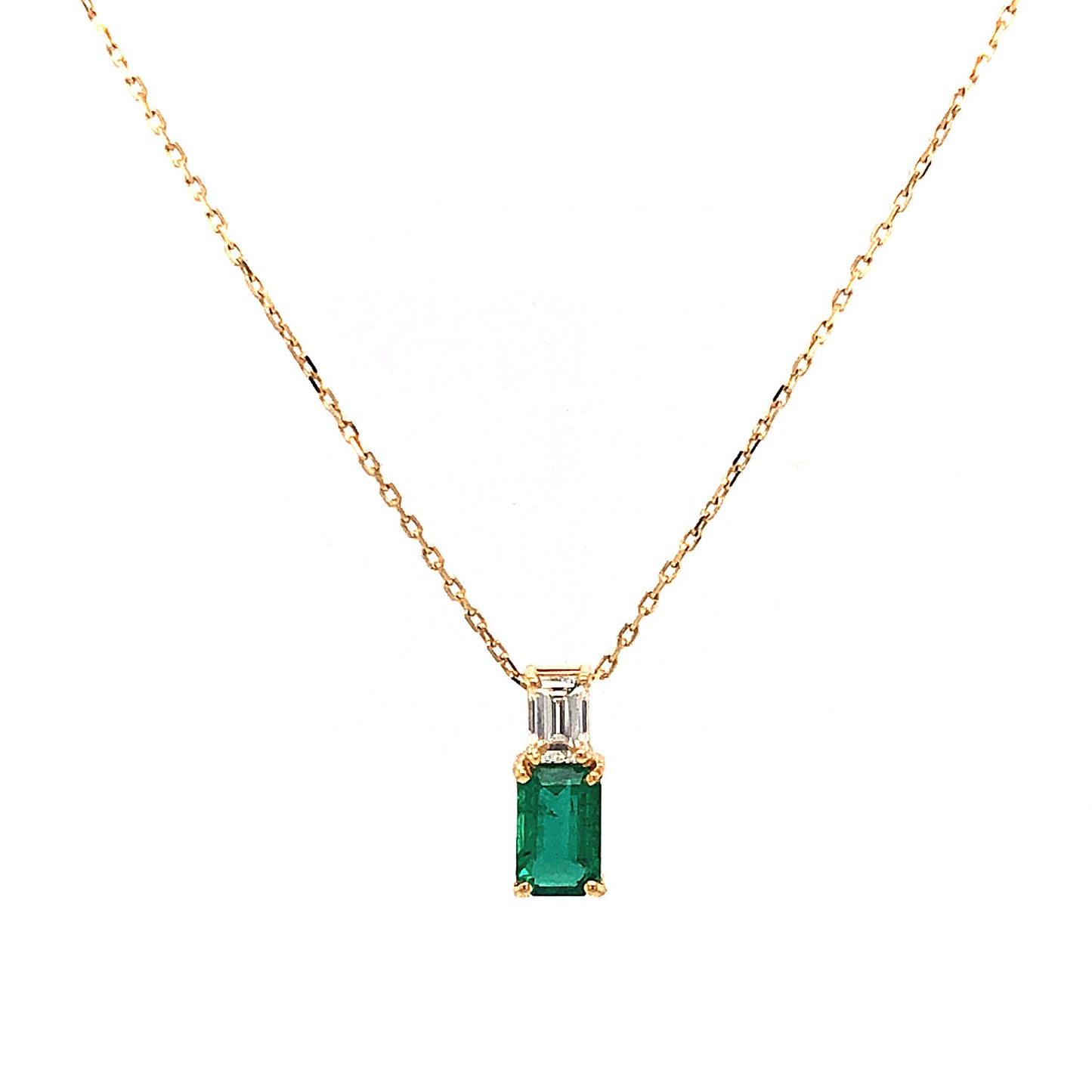 Adorable to layer or wear on its own – this romantic pendant necklace features a .47 carat emerald cut emerald and a .19 carat near colorless diamond in 18 karat yellow gold. The bright green emerald is set in a four prong basket and is stacked with an accent diamond for added brilliance. The necklace comes complete with a classic adjustable chain necklace measuring 16-18 inches long. A fabulous gift for any loved one! Shop More Necklaces.