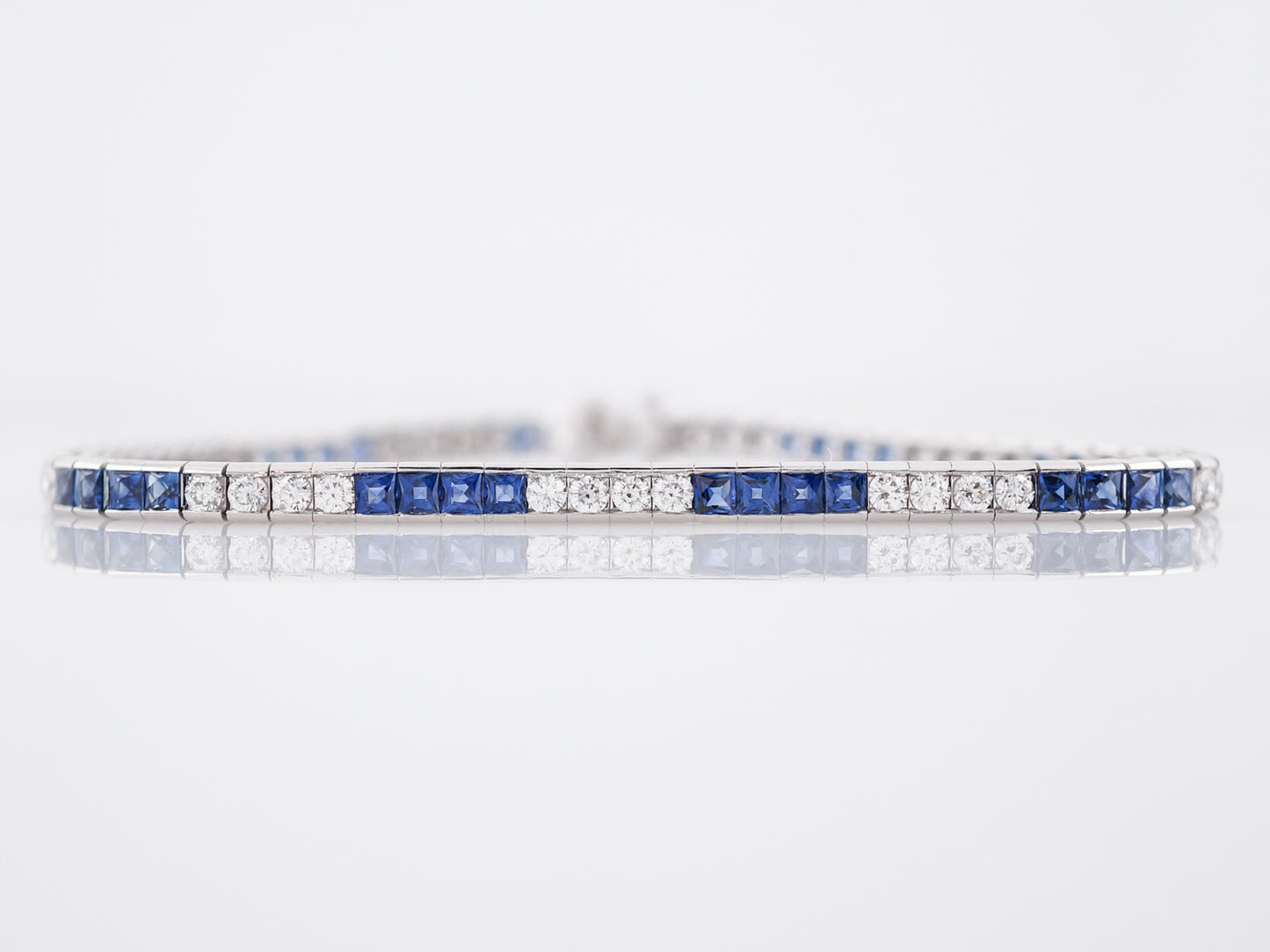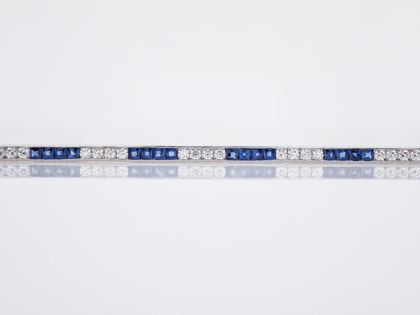 This Modern Era, straight line bracelet is a lovely twist on the classic tennis bracelet. The bracelet is channel set with thirty six (36) Round Brilliant Cut Diamonds weighing 1.80 carats total and thirty-six French Cut blue sapphires weighing 4.06 carats total, which alternate in a pattern of four (4) sapphire and then four (4) diamonds. Cast in platinum, this piece is a simple way to add a little luxe into your everyday wardrobe.