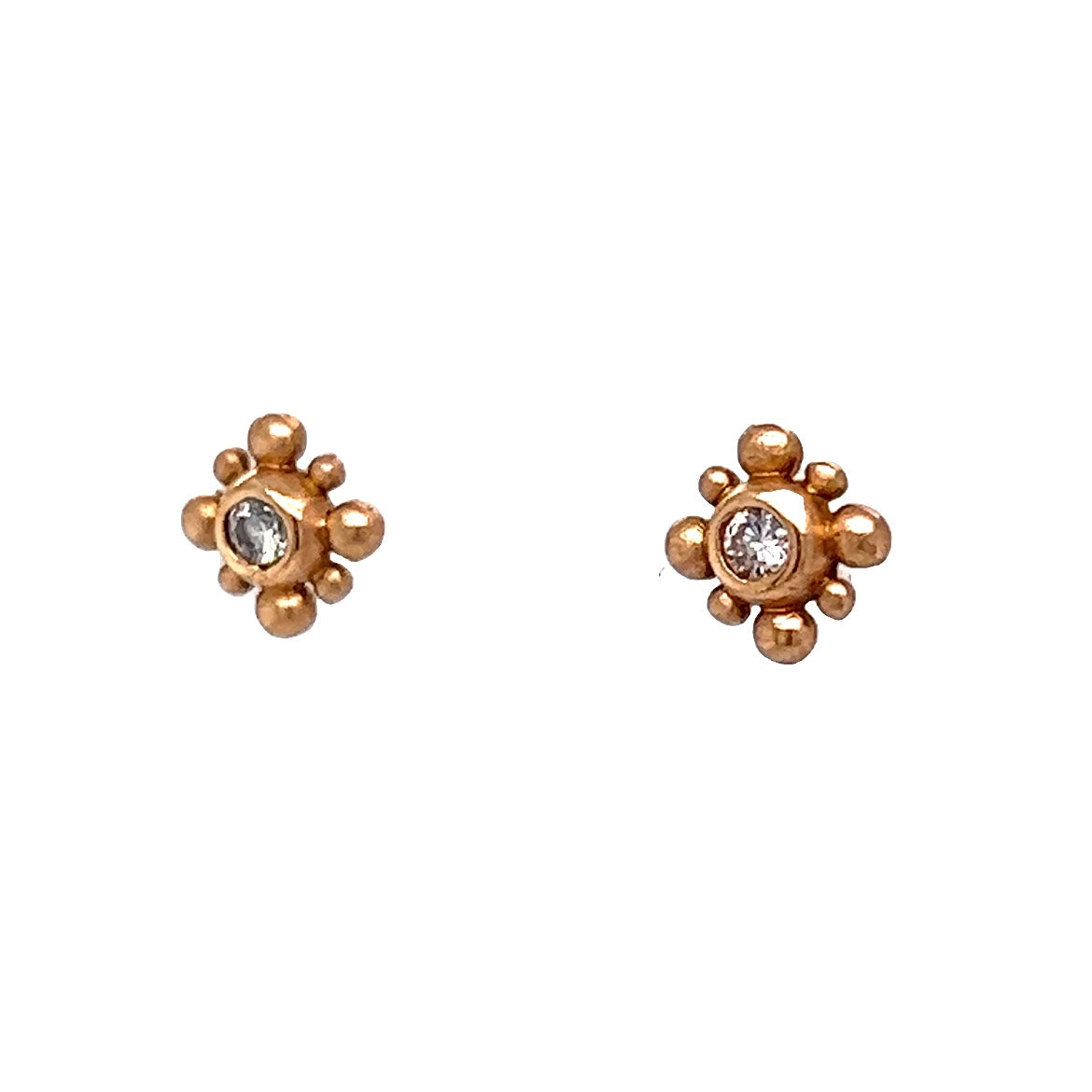 These modern and stylish stud earrings are finished in 14 karat rose gold. Featuring a unique bezel set design, the earrings showcase two round stones, each measuring 1.75mm in size and .03 carats in weight. The stones are set in bezels that add an intricate detail to the earrings. The stones are securely fastened with stud backings. These studs are perfect for everyday wear and are sure to add a touch of sophistication and glamour to any ensemble.