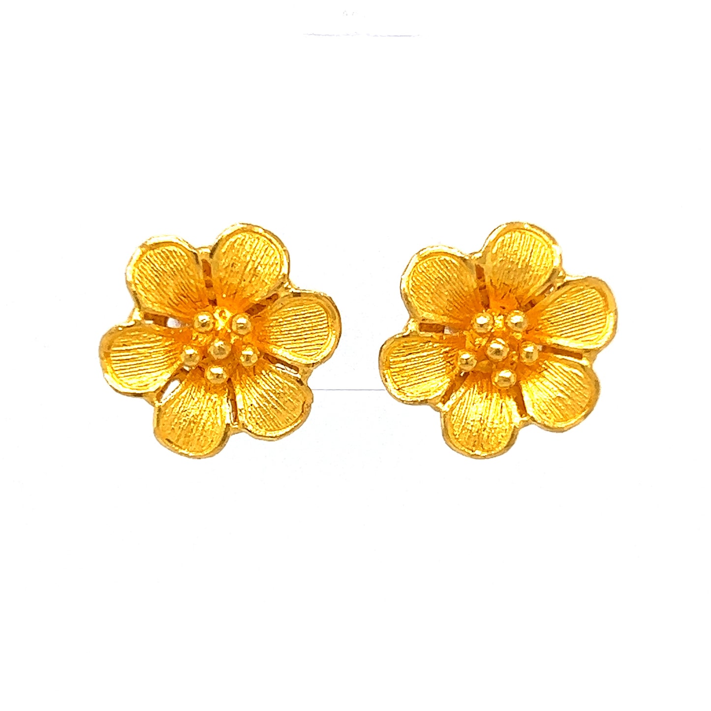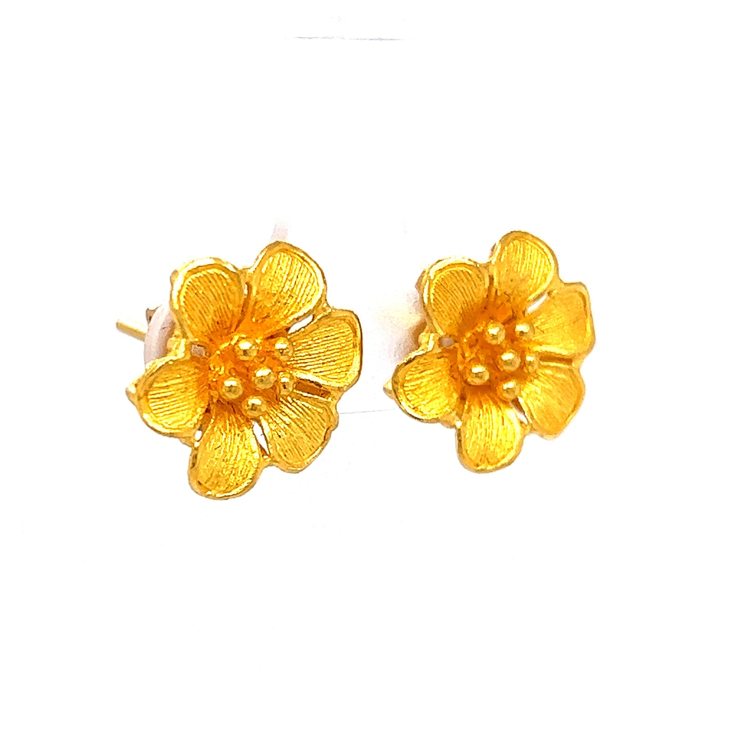 These modern flower-shaped stud earrings are crafted with 22 karat yellow gold for a luxurious look. The petite design of the earring features a whimsical floral motif that will give your look a romantic touch. The stud earrings are lightweight and perfect for everyday wear.