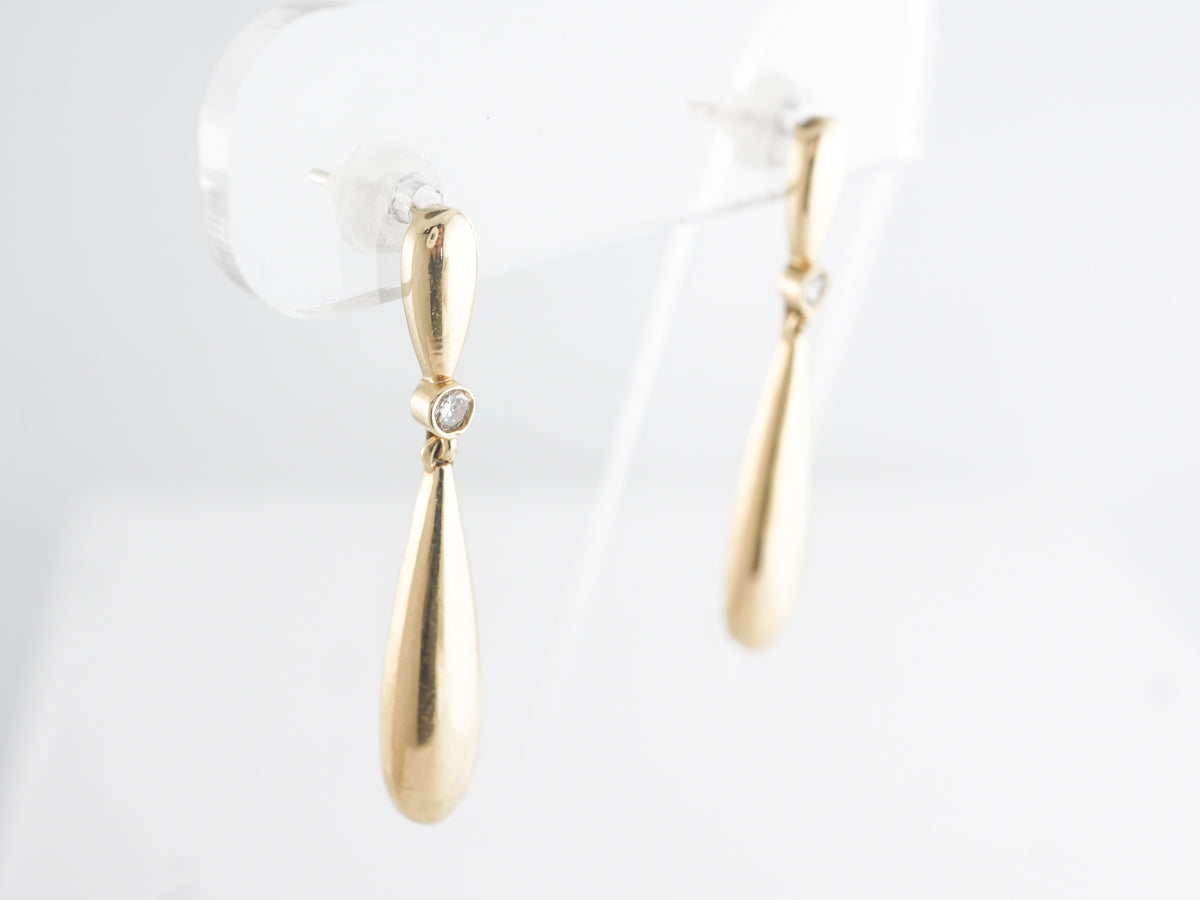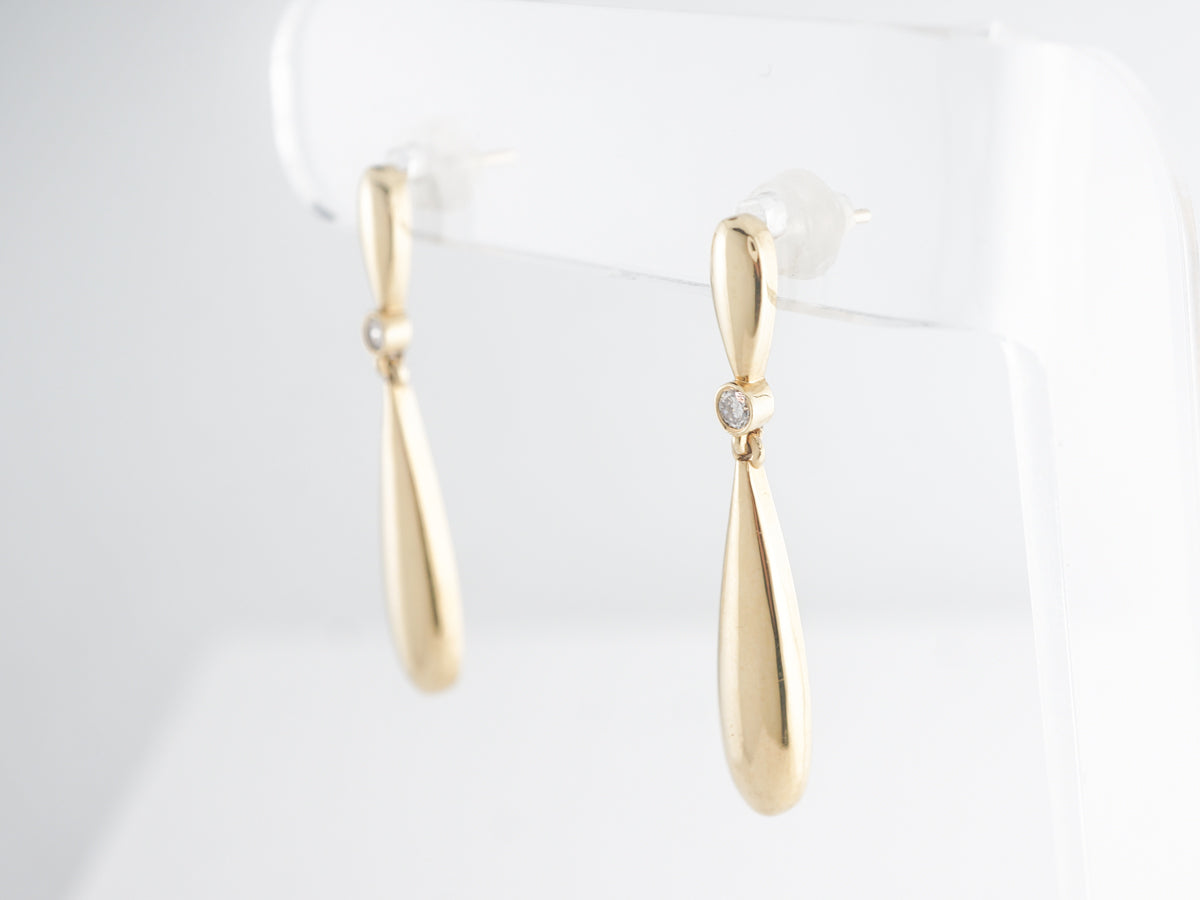 Teardrop Diamond Earrings in 14k Yellow Gold. These thin drop earrings feature a .028 carat round brilliant cut diamond set in warm 18 karat yellow gold. The highly polished yellow gold teardrops face each other and connect with a jump ring. The minimalist design provides lovely movement and a delightful look that could be worn every day.