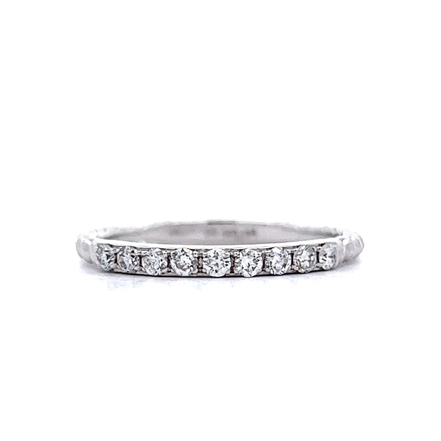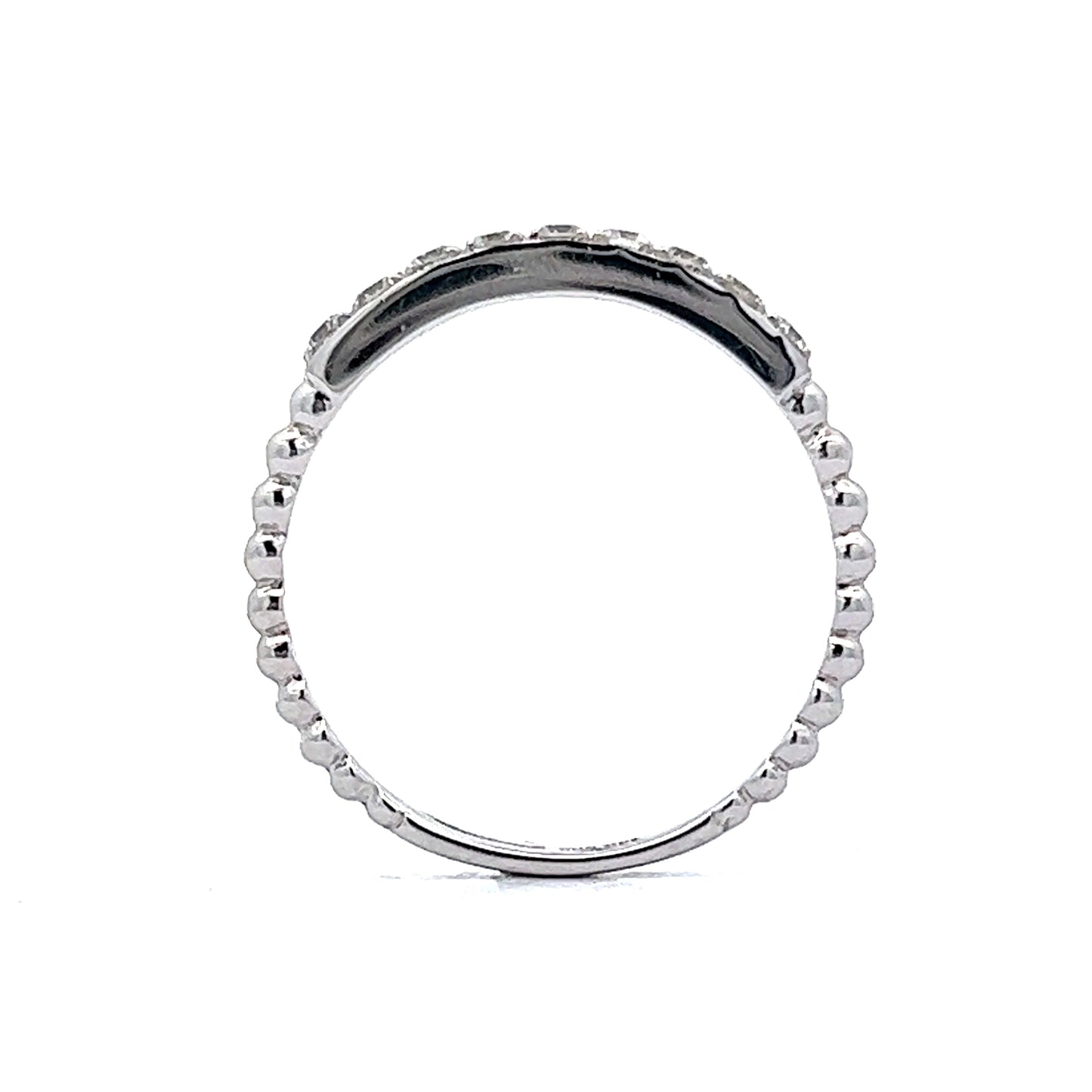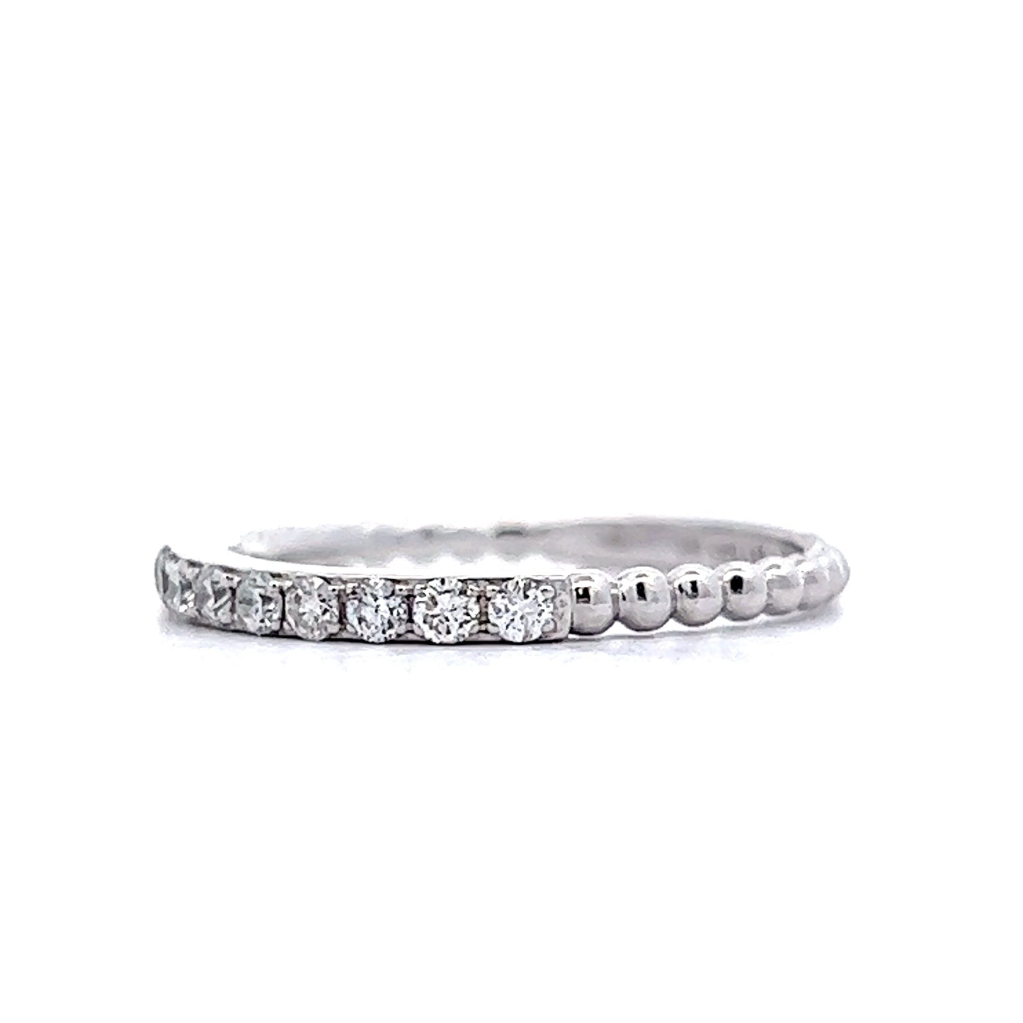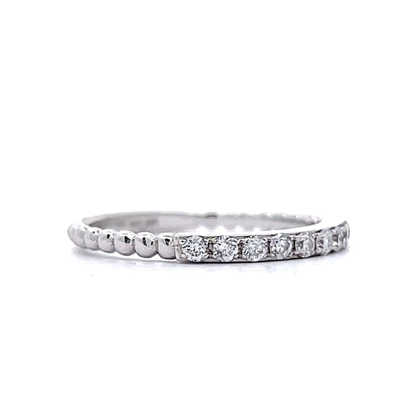 Textured Diamond Wedding Band in 14k White Gold. This modern wedding band contains .21 carats of round brilliant cut diamonds set in 14 karat white gold. With the diamonds set across the top half and the bottom half comprised of beaded gold, this unique composition would make a perfect stacking ring!