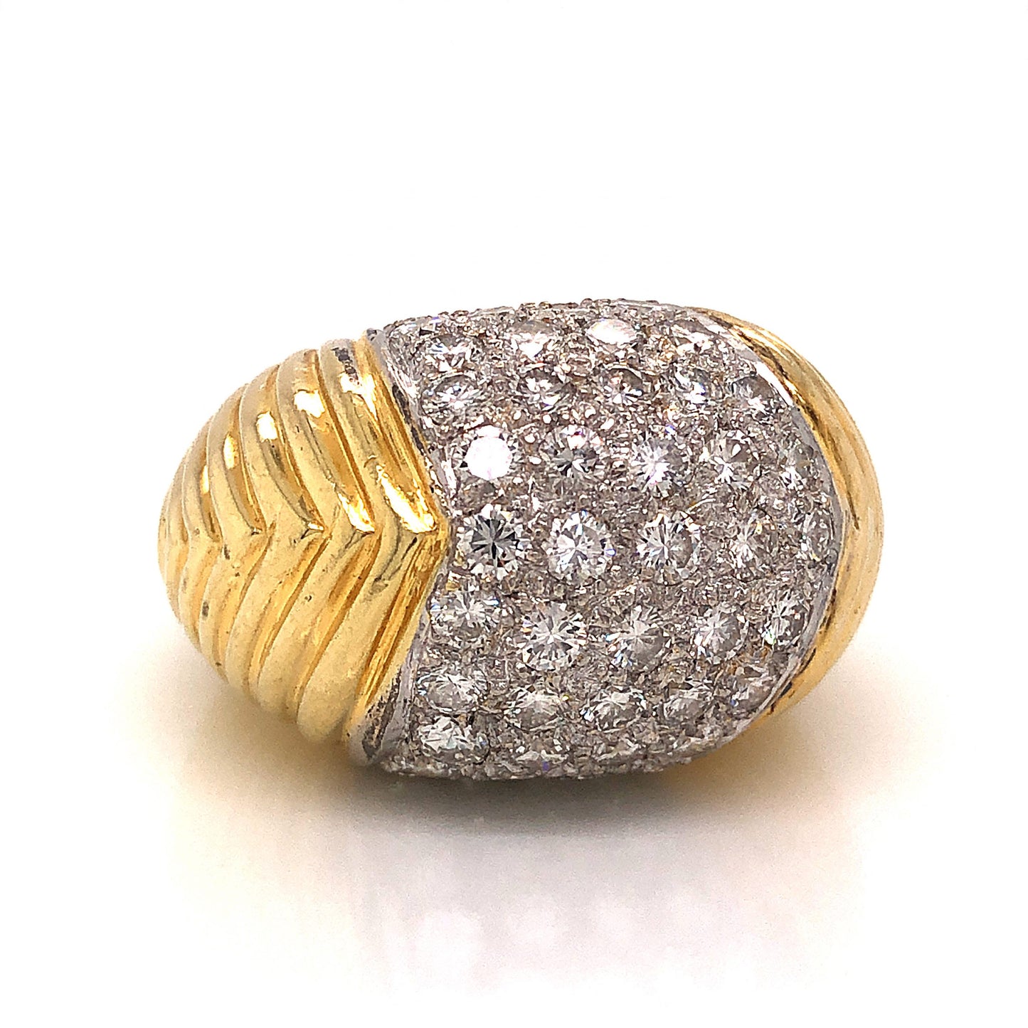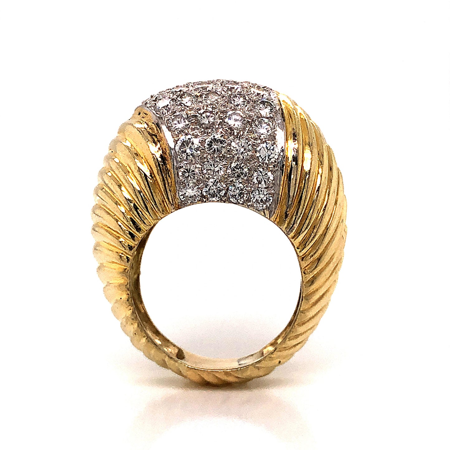This sparkling statement ring features 3.30 total carats of diamonds on a textured two-tone band in 18 karat white and 18 karat yellow gold. A pave of fifty-five (55) Round Brilliant cut diamonds sparkle in 18K white gold. Beach wave engravings in 18K yellow gold decorate the tapered band. This Mid-Century ring has disco style! A lovely gift for any diamond lover. Shop more Mid-Century Jewelry.