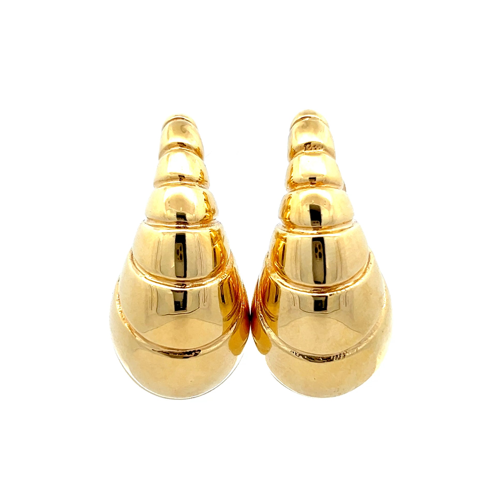 These 14 karat yellow gold hoop earrings measure 1.5 inches long and 18.8mm wide with a hollow center design that keeps them lightweight despite their oversized appearance. The ridged surface mimics the texture of raindrops and catches light to create shimmer with movement. The hollow construction allows for comfortable wearing while maintaining the dramatic impact of their generous proportions.