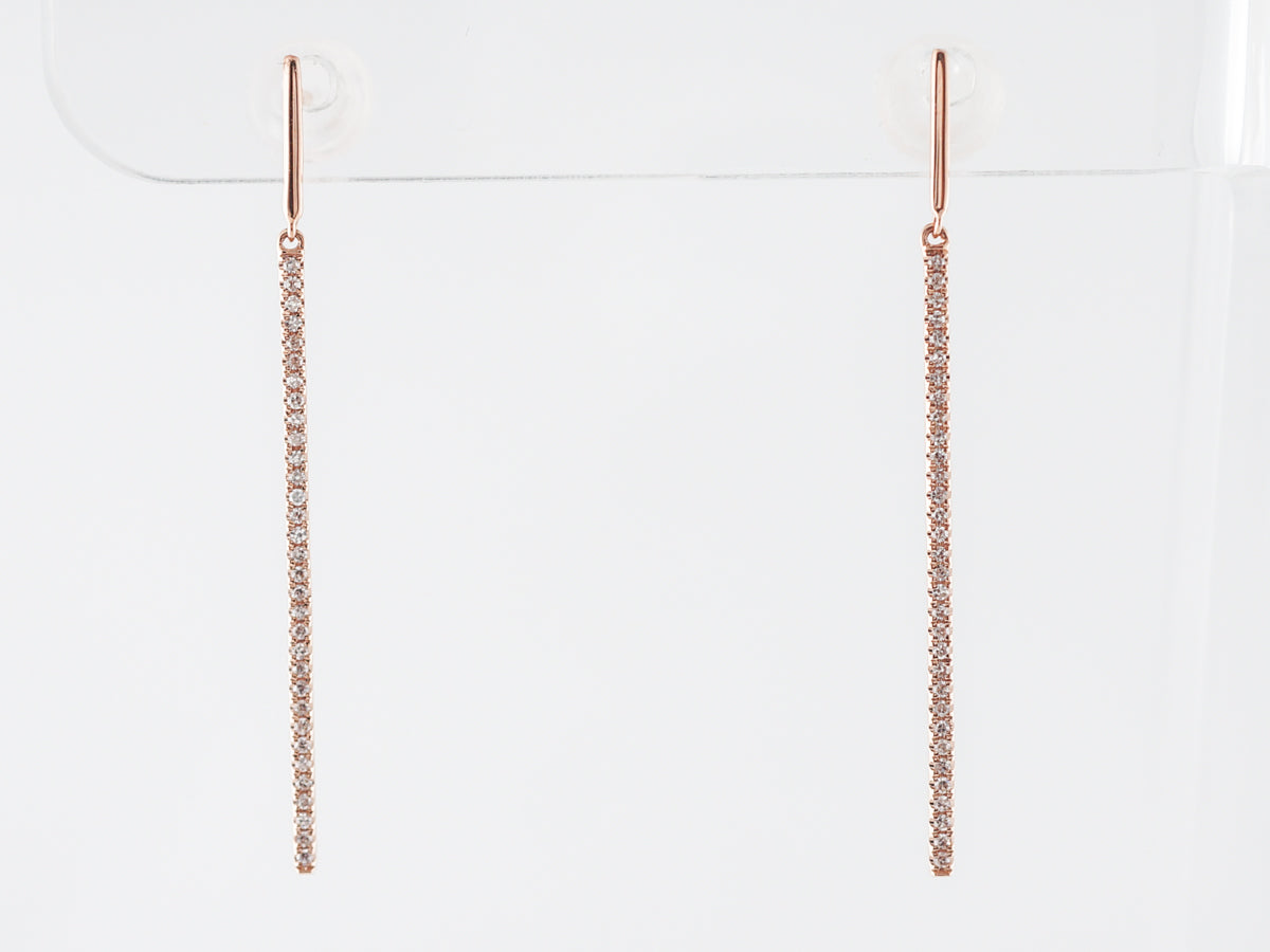 Thin Diamond Dangle Earrings in 18k Rose Gold.  We like the sleekness of these thin, stick style diamond earrings. The top of these modern posts are a smooth, polished piece of rose gold and the bottom section is rose gold covered with sparkling diamonds. These articulated, dangle earrings can go from casual to formal so they are sure to be in heavy rotation.