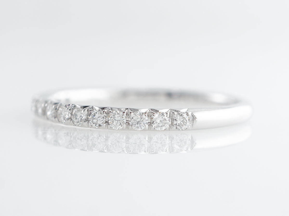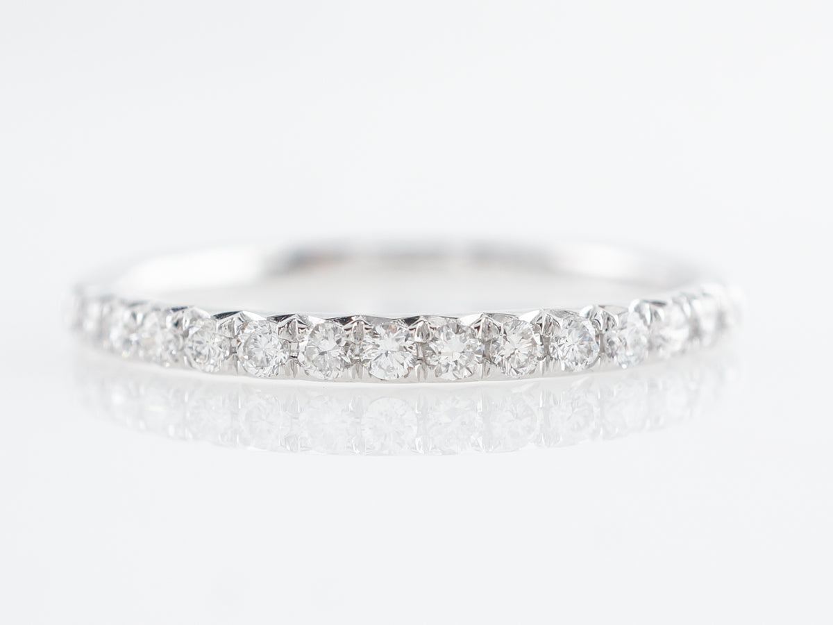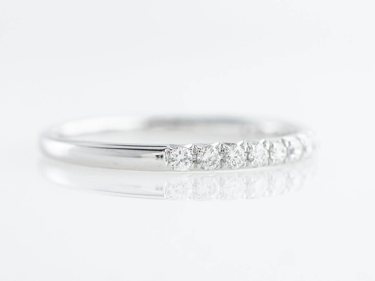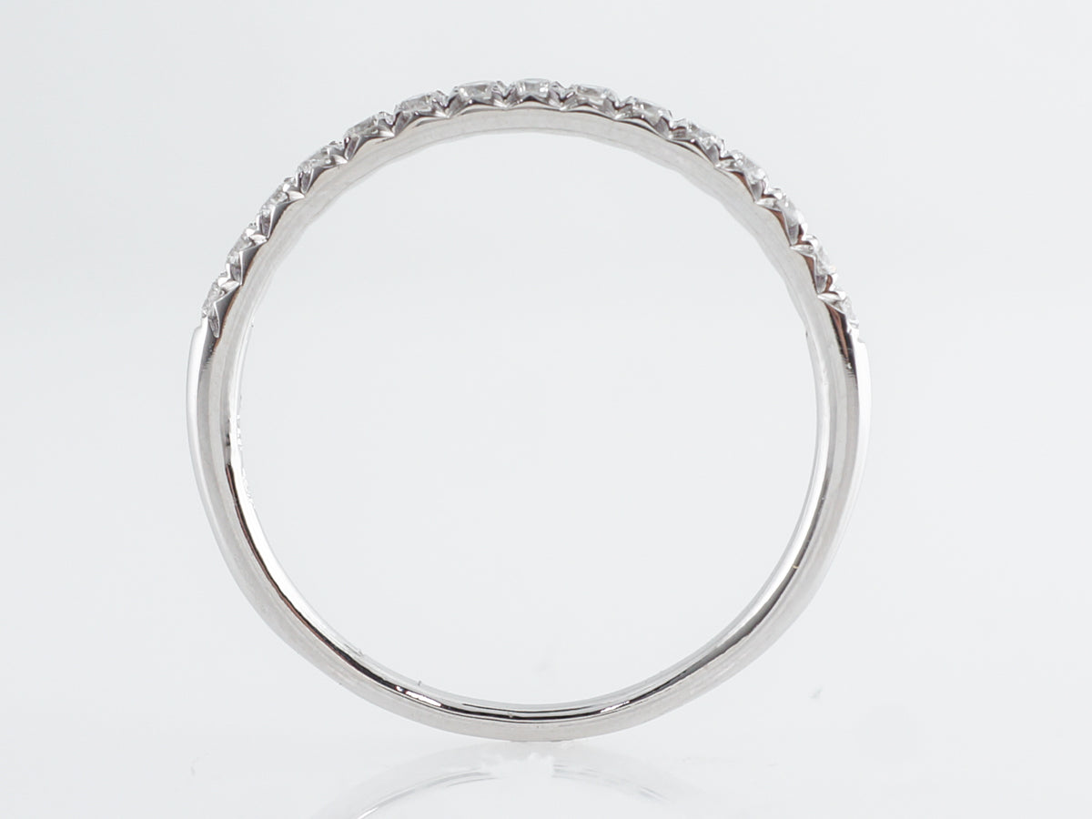 Thin Diamond Stacking Band in 14k White Gold. This simple wedding band is finished in 14 karat white gold and contains .21 carats of round brilliant cut diamonds. An clean and elegant way to add sparkle to a solitaire engagement ring.