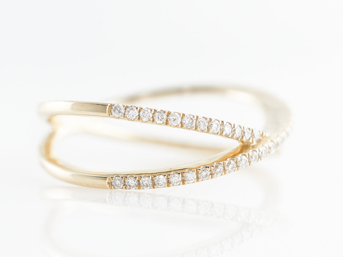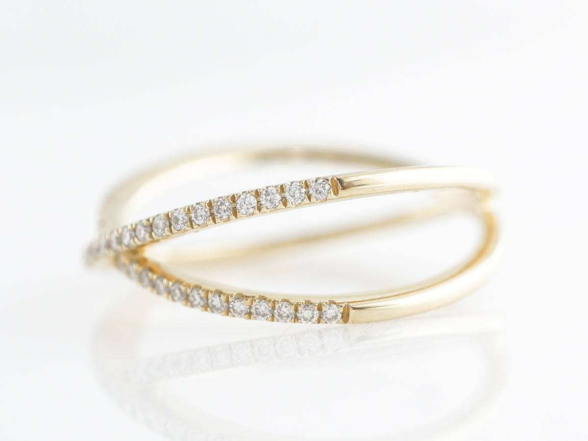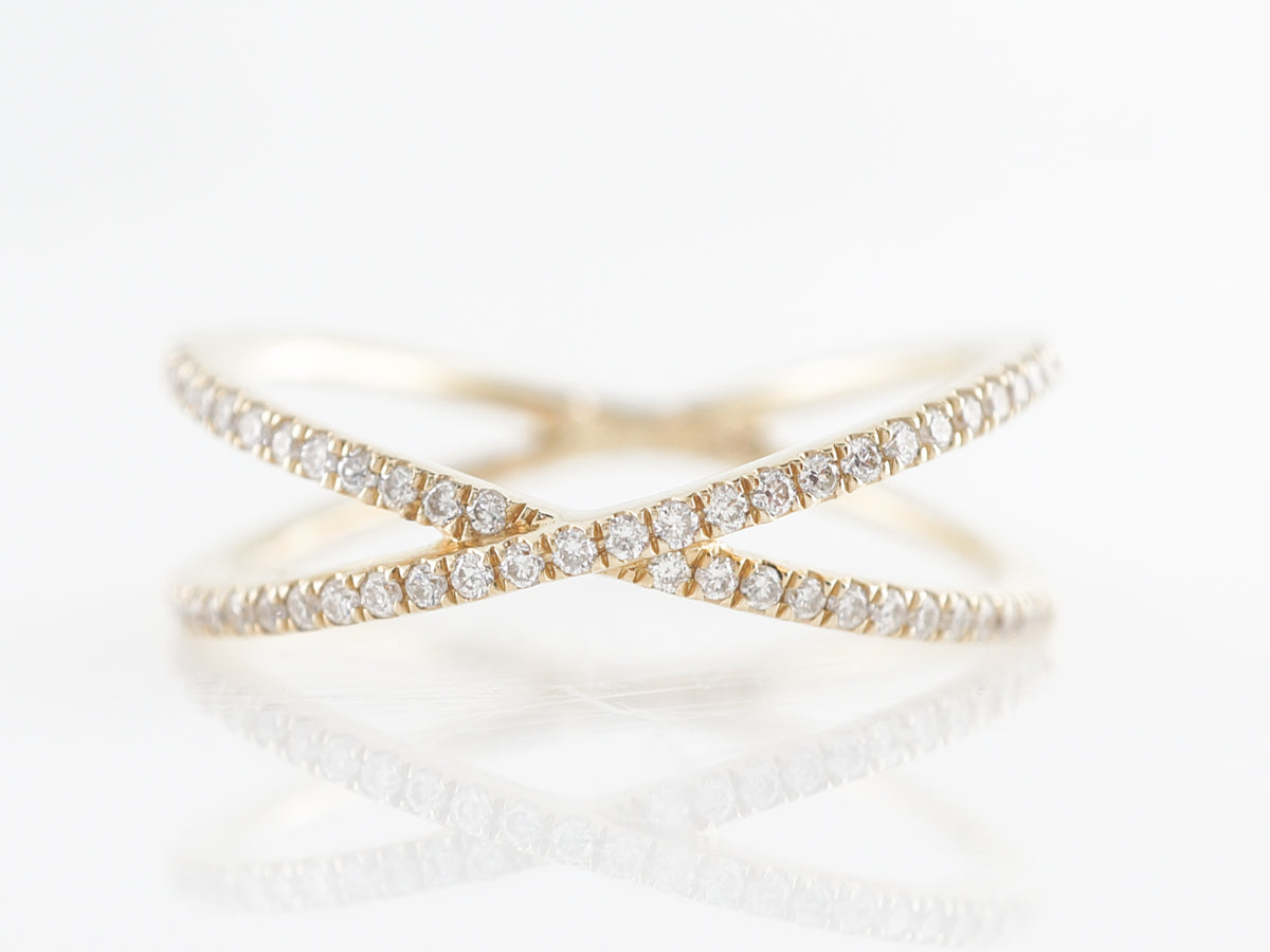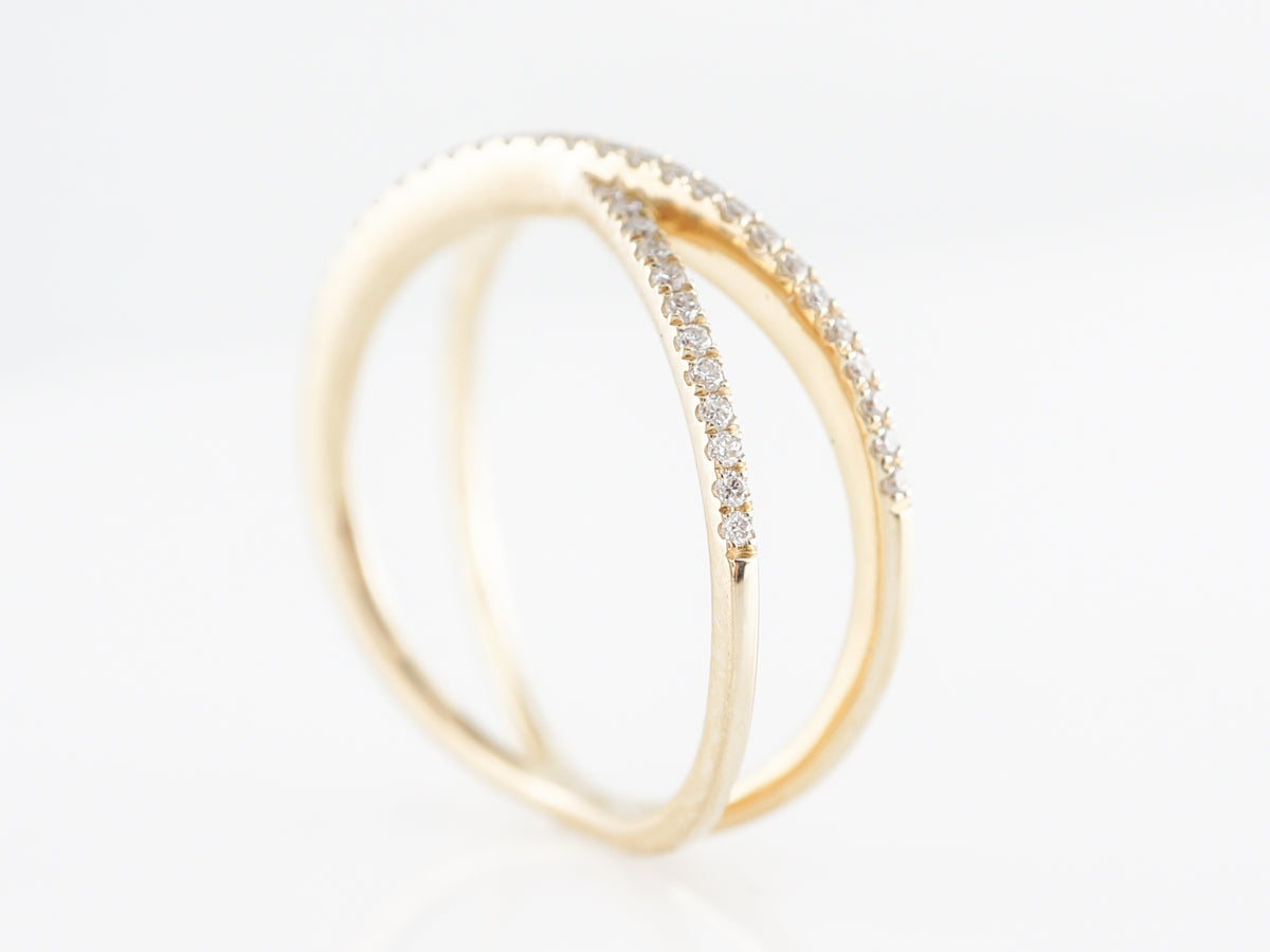 This double shank wedding band features .25 carats of round brilliant cut diamonds is finished in 14 karat yellow gold. The two shanks cross in a delicate X across the top of your finger, and sparkle with the fifty-one (51) small diamonds. The shape of this band allows for an engagement ring to snuggle right up and have a perfect fit. This band would also be beautifully worn on the right hand.