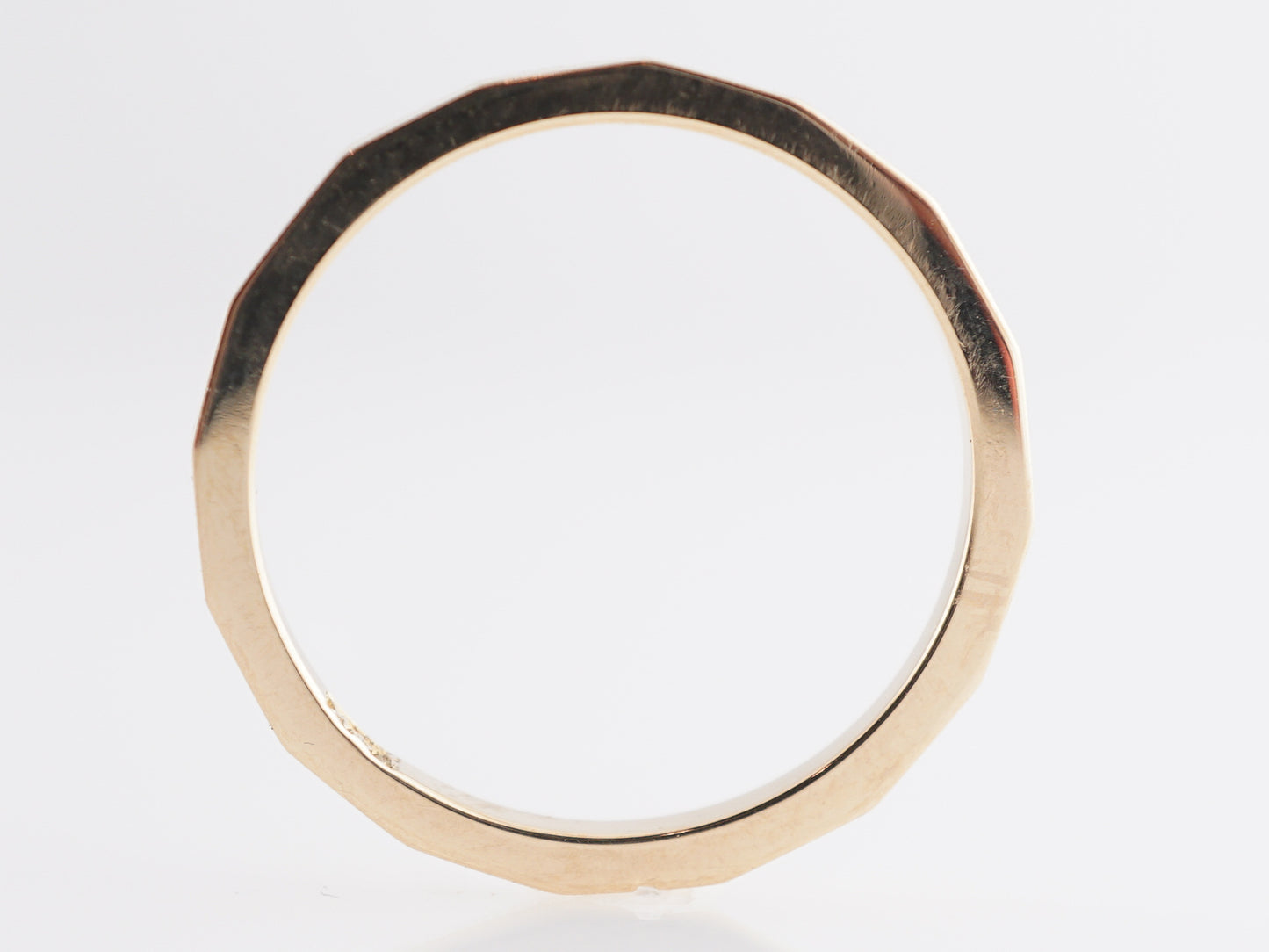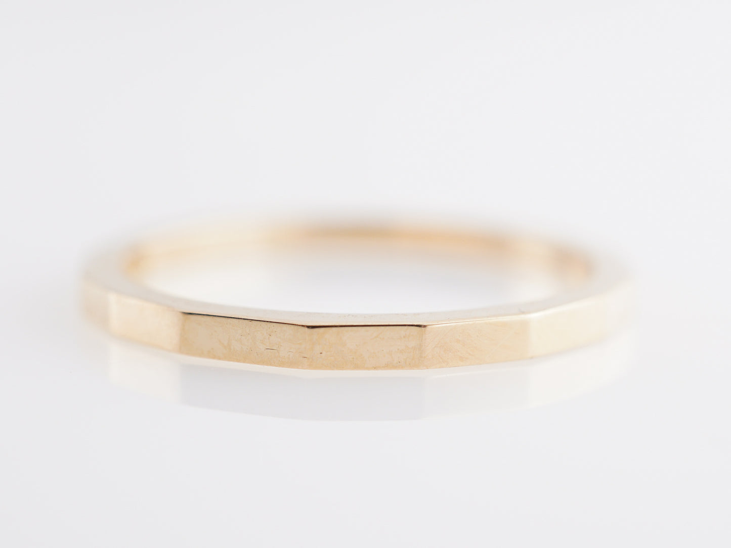 Thin Geometric Wedding Band in 14k Yellow Gold. This modern wedding ring features geometric details on a 14k yellow gold band. The inner shank is polished and smooth so that it is both comfortable to wear with a bit of dimension on the angled exterior of the shank. Pair this wedding band with an engagement ring or wear it stacked with other 14k yellow gold bands for a fashionable look!
