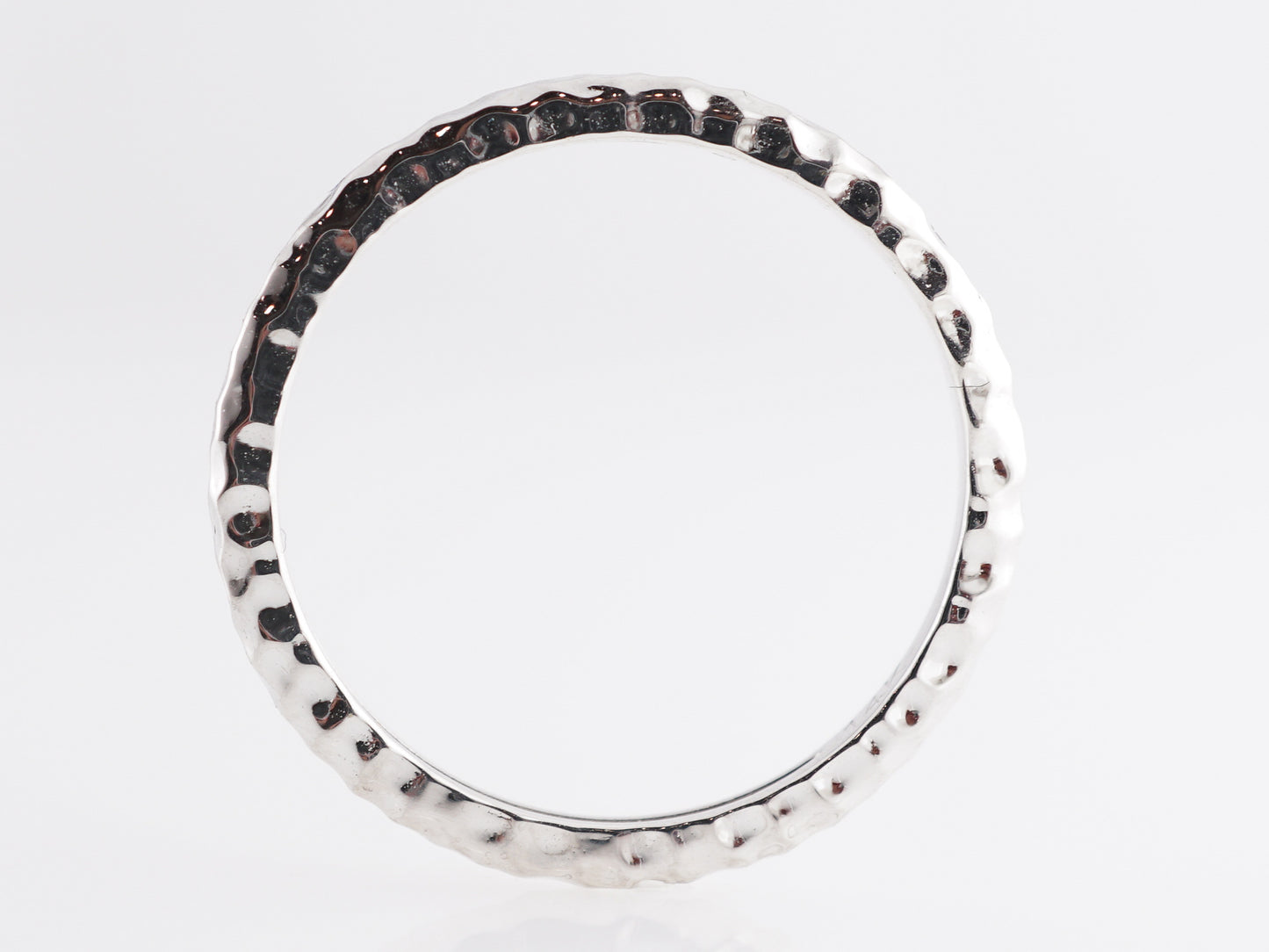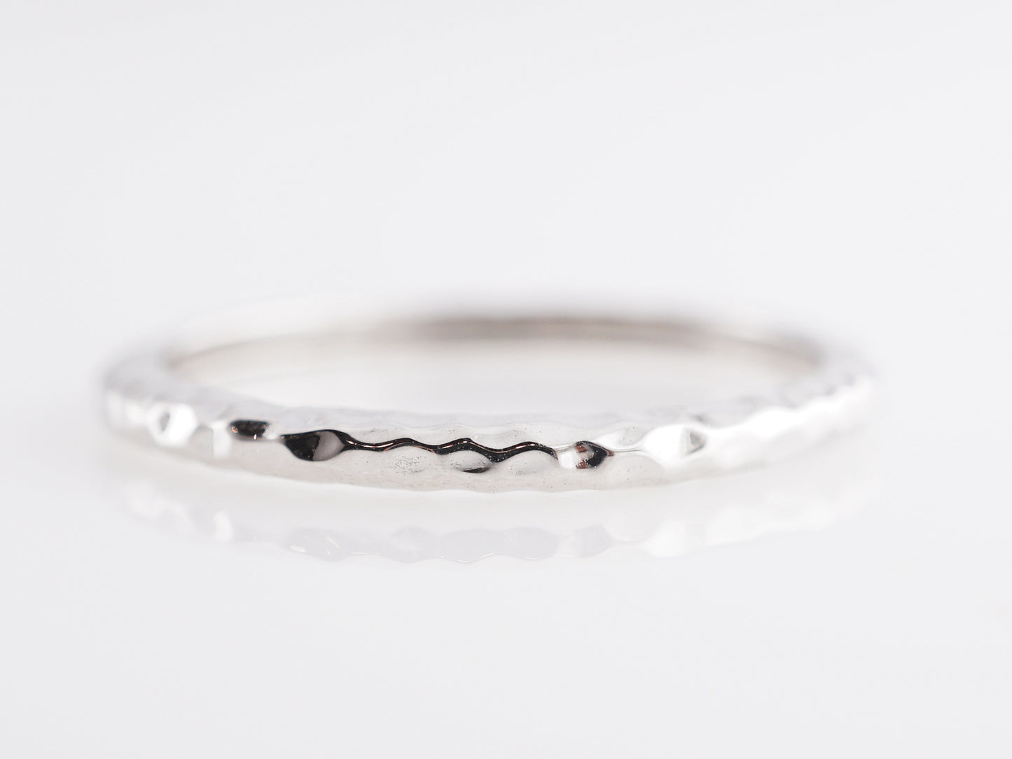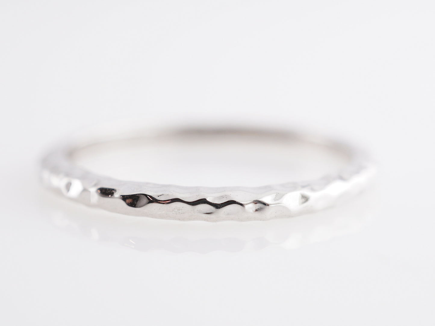 This wedding band features a hammered, wavy design in 14k white gold. This decorative technique has been used by jewelry makers for ages and creates a beautiful textured aesthetic to the precious metal. This band can be worn with an engagement ring or stacked with other rings for a modern, fashionable look. Dainty chic.