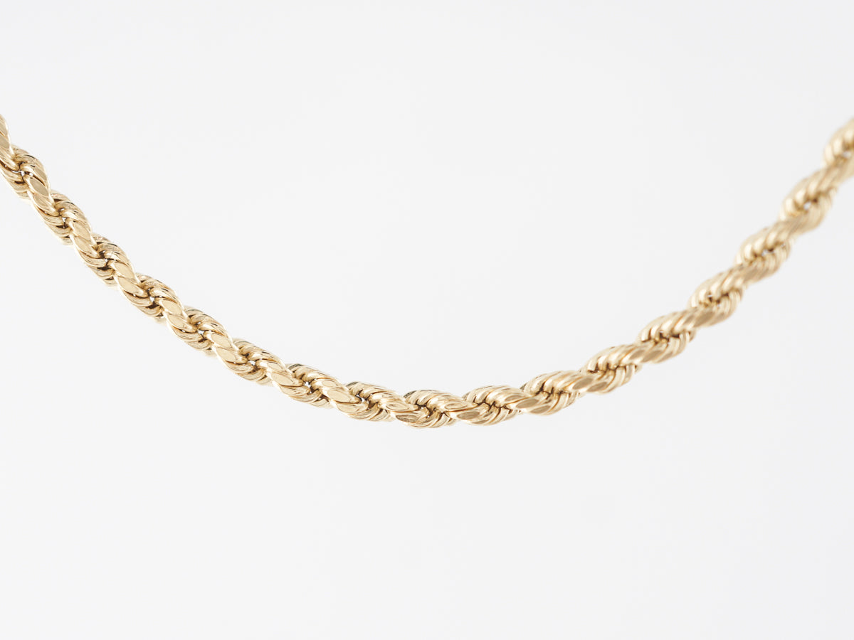Thin Rope Chain Necklace in 14k Yellow Gold. This chain necklace is 22 inches in length and weighs 2.7 grams. Easy to wear and a wonderful accent piece.