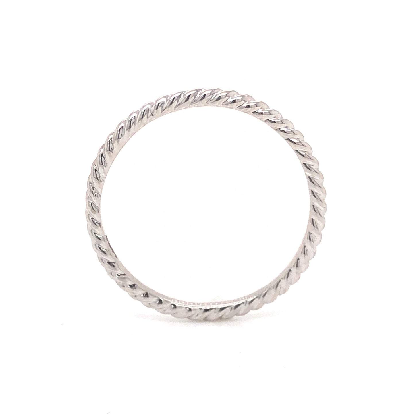 This 90s-inspired stacking ring features a thin rope design in shimmering 14 karat white gold. This slender band is fashionable and versatile, measuring just 1.41mm wide. The perfect companion for any stack of right hand rings! Twisted, dainty, and full of style!