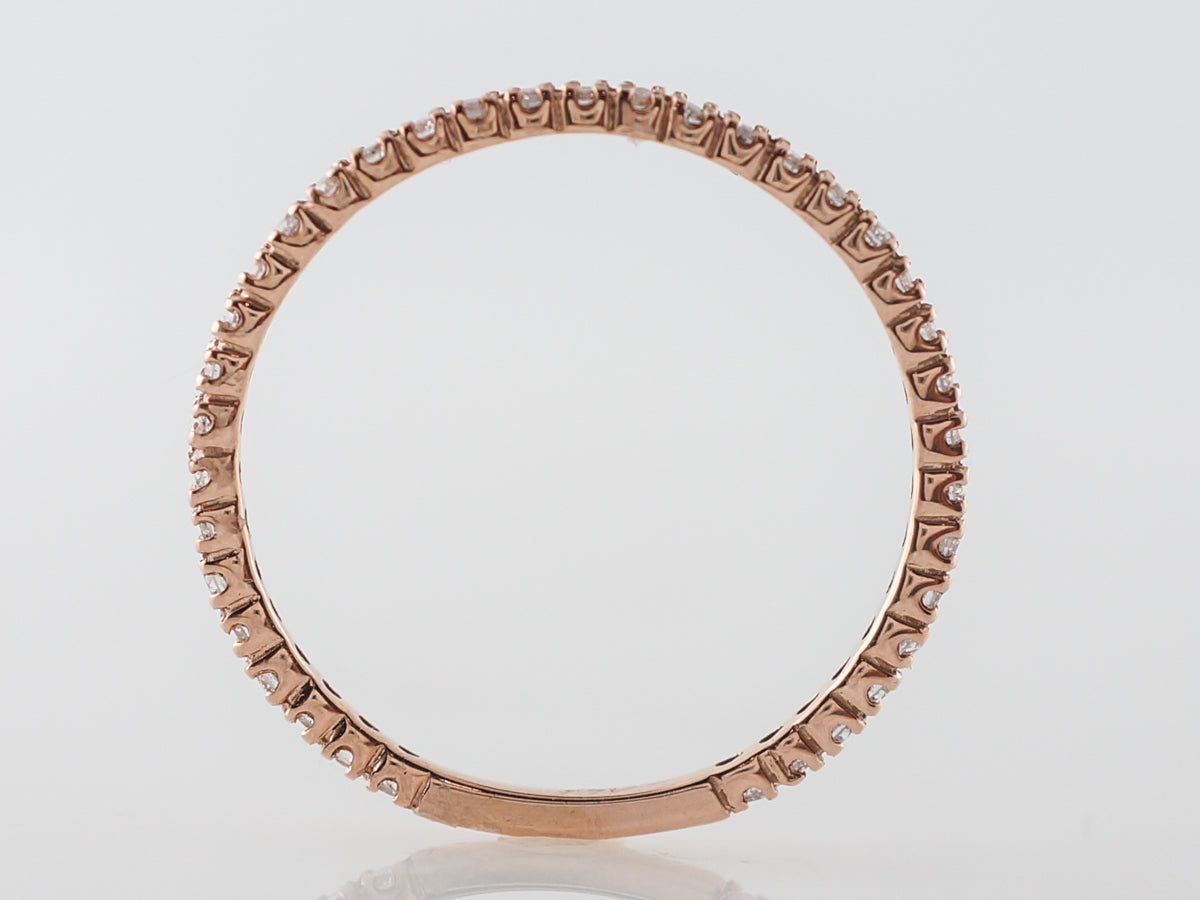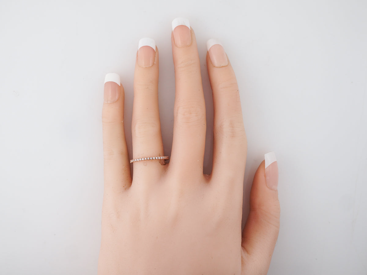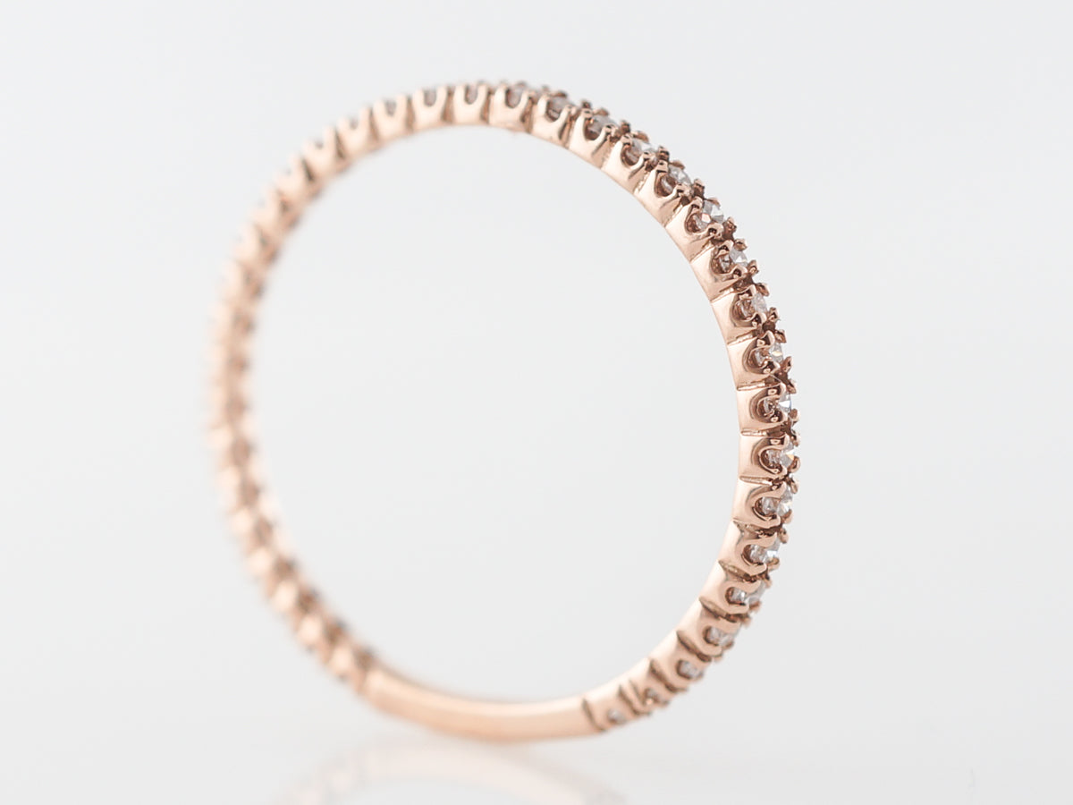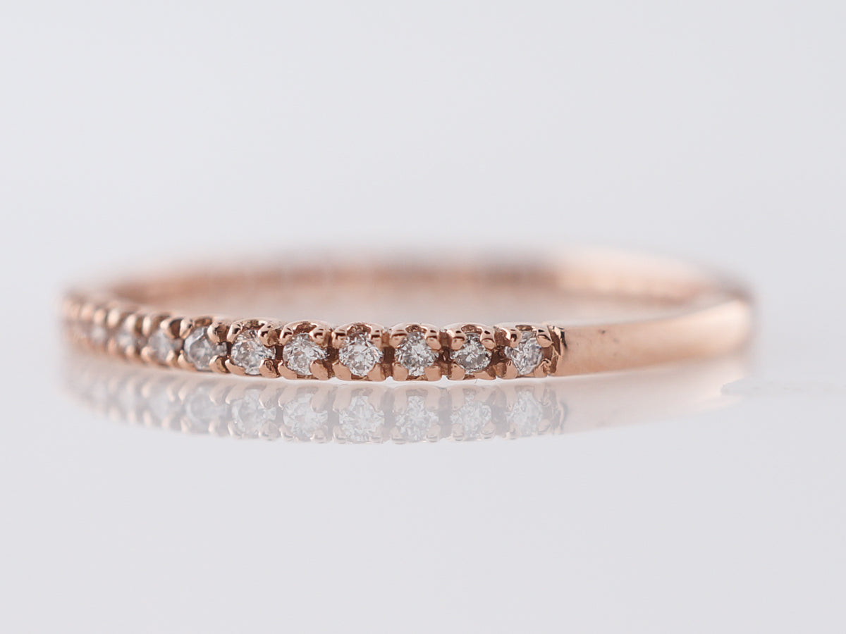 Thin Rose Gold Diamond Wedding Band in 14k. This thin diamond wedding band features thirty seven (37) prong set diamonds set in 14 karat rose gold with a total carat weight of .18 carats. The diamonds are set half way around the length of the band and provide a beautiful shimmer from every angle. This band would pair well with most any antique or modern engagement ring or stack.