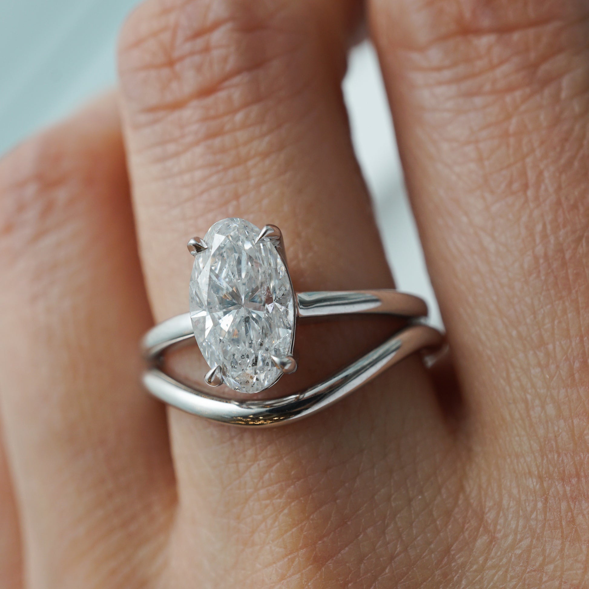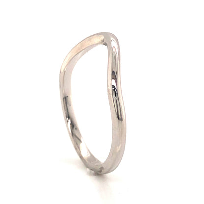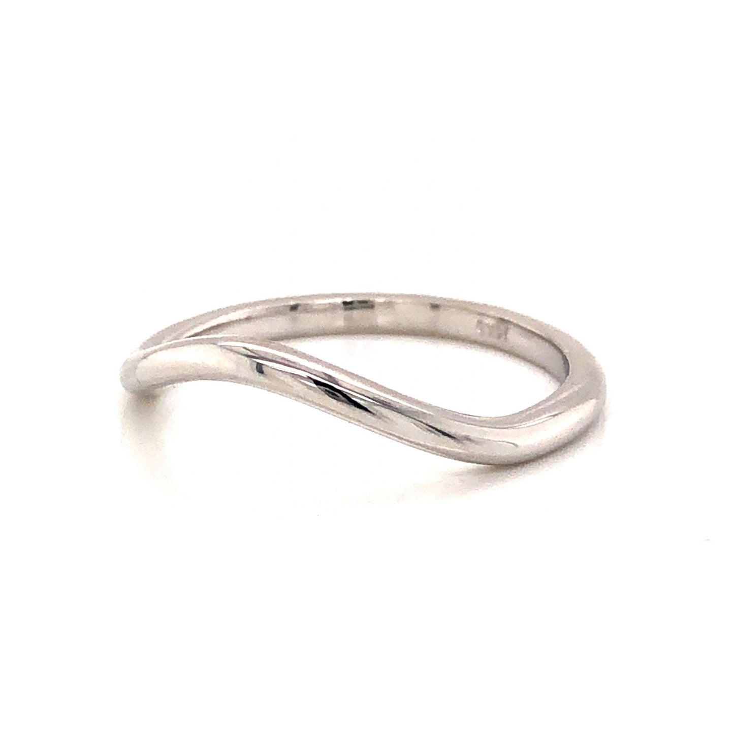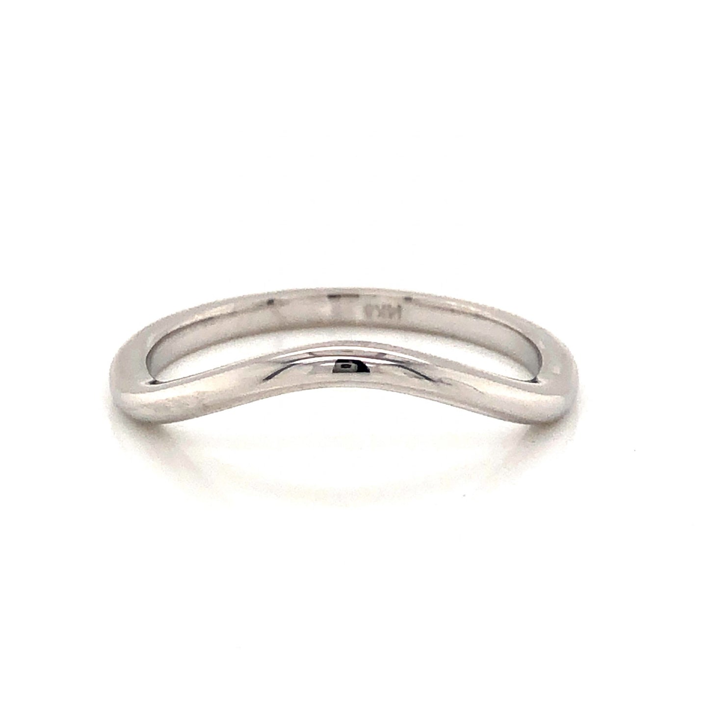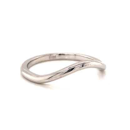 This sleek and curved wedding band in 14 karat white gold is a modern creation By Filigree. Fashionable and slender, this radiant band has a smooth notch in the center to allow space for a stone in an engagement ring. Pair with a white gold engagement ring or as an end cap on a right hand stack! Shop More Curved Wedding Bands.