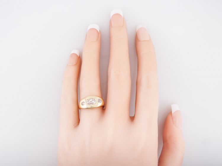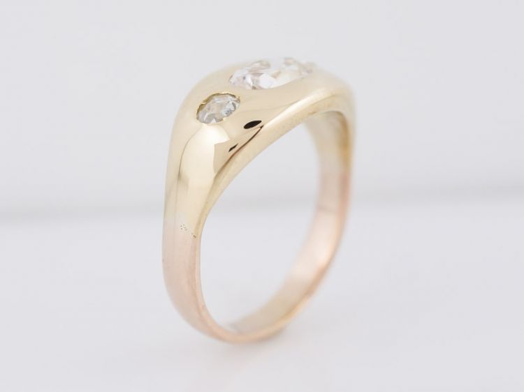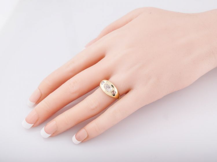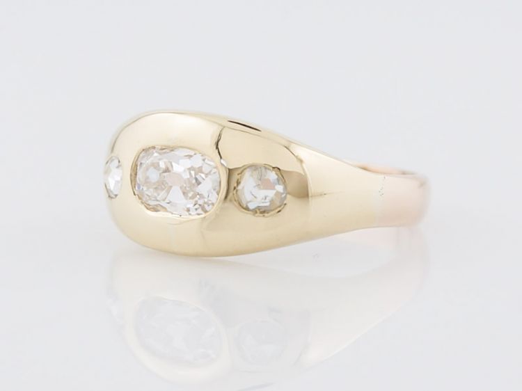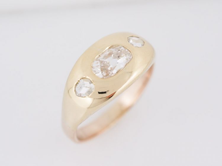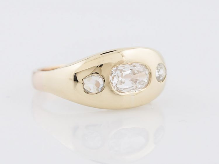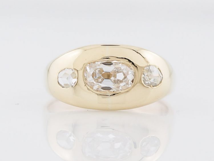 Three Stone Antique Engagement Ring Cushion Cut Diamonds. This antique engagement ring was made in the Victorian era and features a G.I.A. certified .77 carat Old Mine Cushion cut (GIA# 5171231856). The accent diamonds on either side of the center stone are rose cut diamonds that weigh .08 carat each. All three diamonds are set flush into the 14k yellow gold ring making it easy and comfortable to wear. This wedding ring has a dome shape and the band tapers as it wraps around the finger.