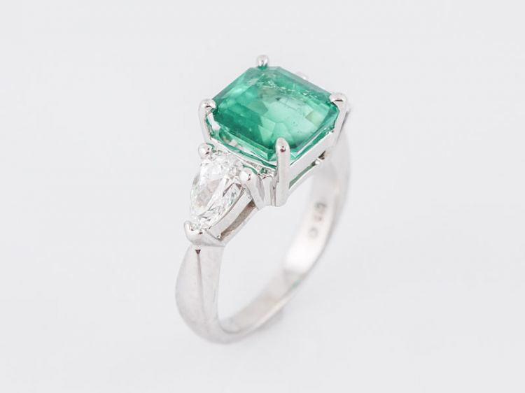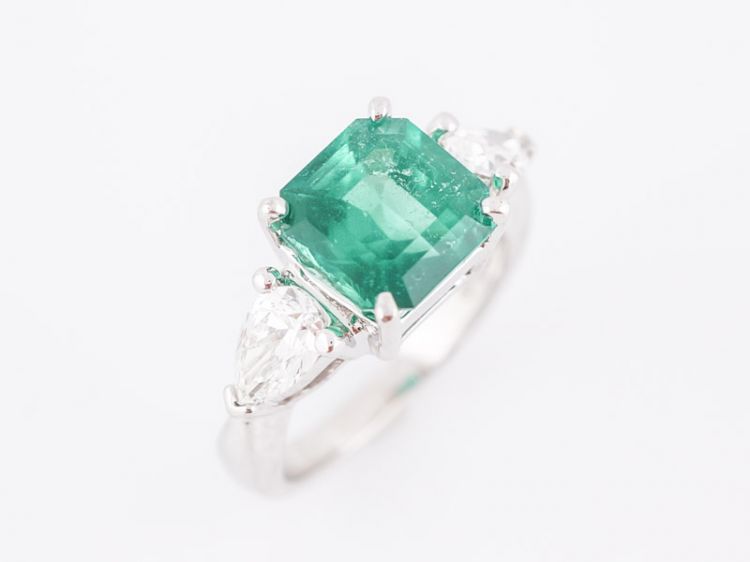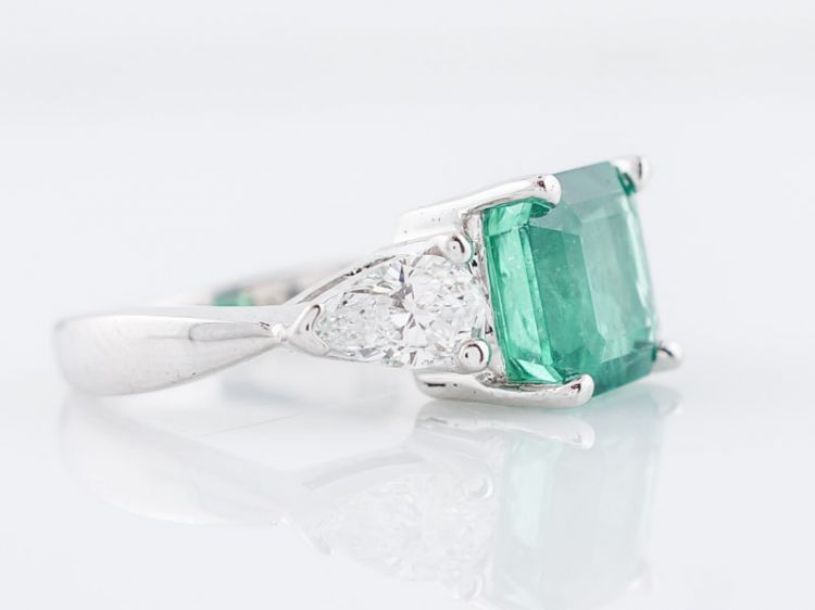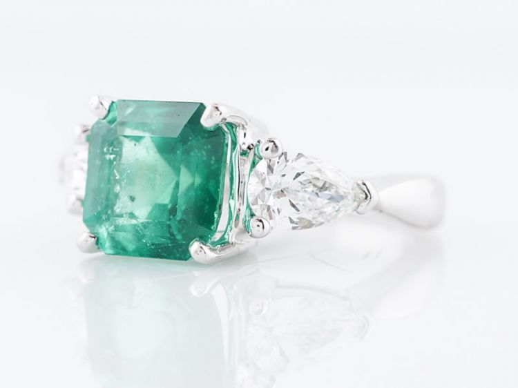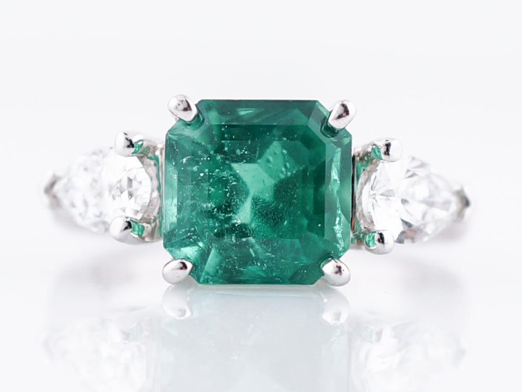 Three Stone Emerald Diamond Engagement Ring in 18k. This custom made 18 karat white gold, emerald and diamond ring is a perfect example of a elegant design popular through the decades. The square cut cornered step cut emerald has wonderful linear faceting allowing the color and clarity to speak volumes of its Columbian origin. The center 3.47 carat emerald is flanked by large pear shape diamonds weigh .97 carats total. The diamonds add a bit of brilliance with every turn of the hand.