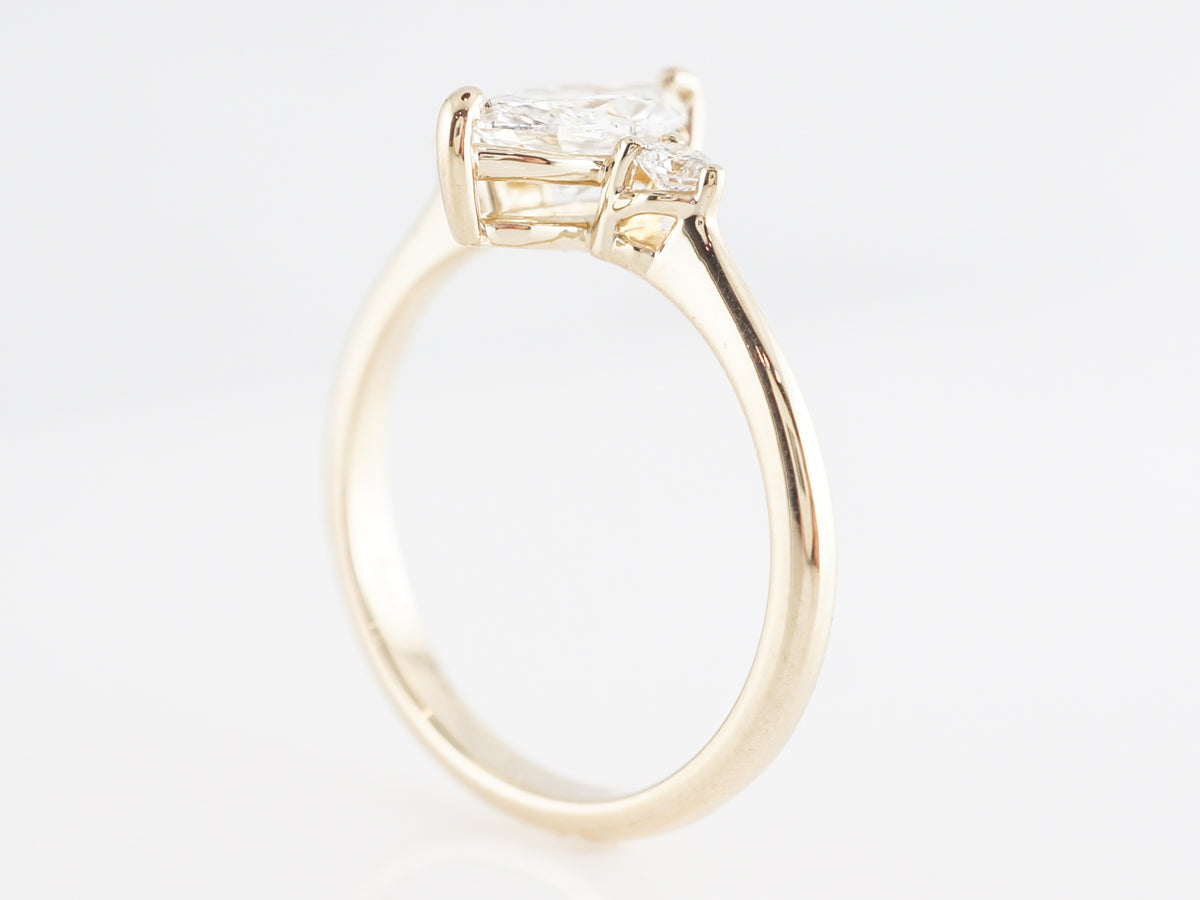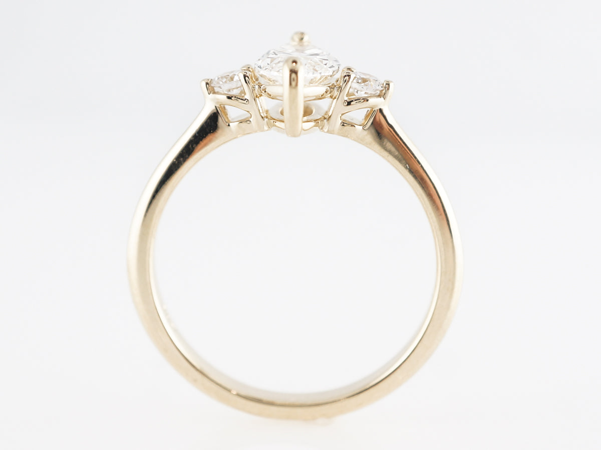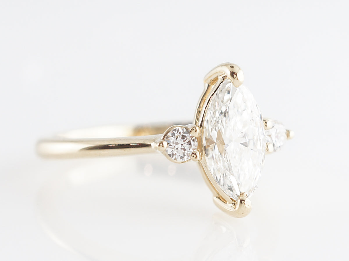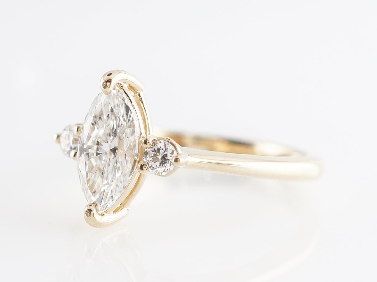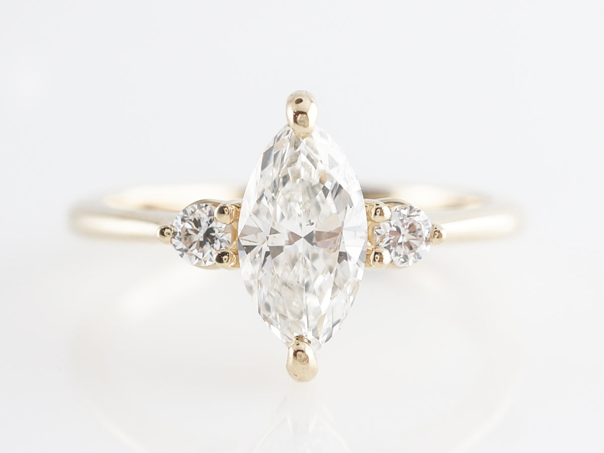 Three Stone Marquise Diamond Engagement Ring in 14K. This modern engagement ring features a .95 carat marquise cut diamond set in 14 karat yellow gold. The marquise cut has recently seen a surge in popularity, and this one is GIA certified. A rather shallow cut, marquise diamonds often appear larger than comparable weights of more traditional cuts. This stone is set on both sides by round brilliant cut diamonds to complete this beautiful look.