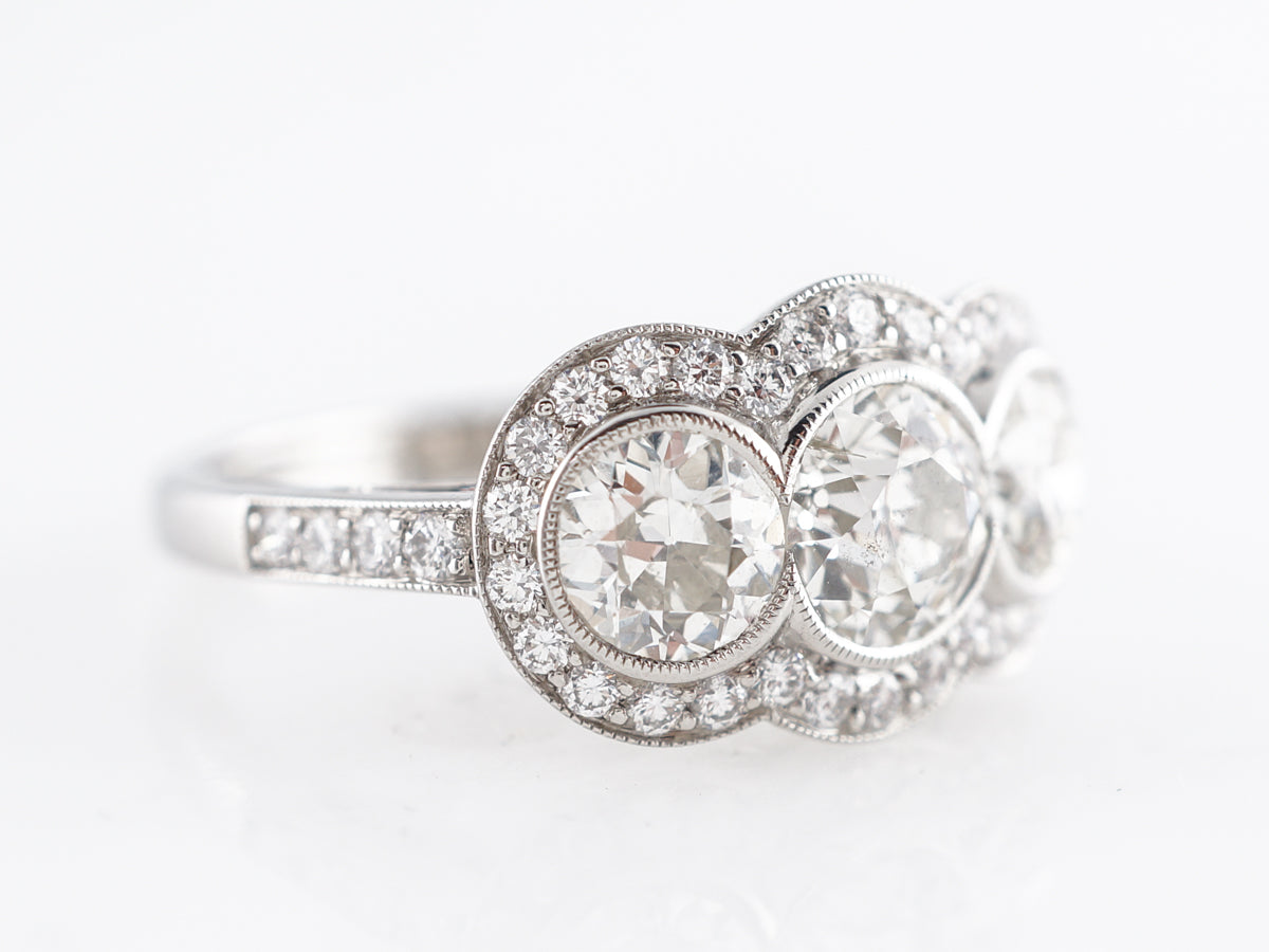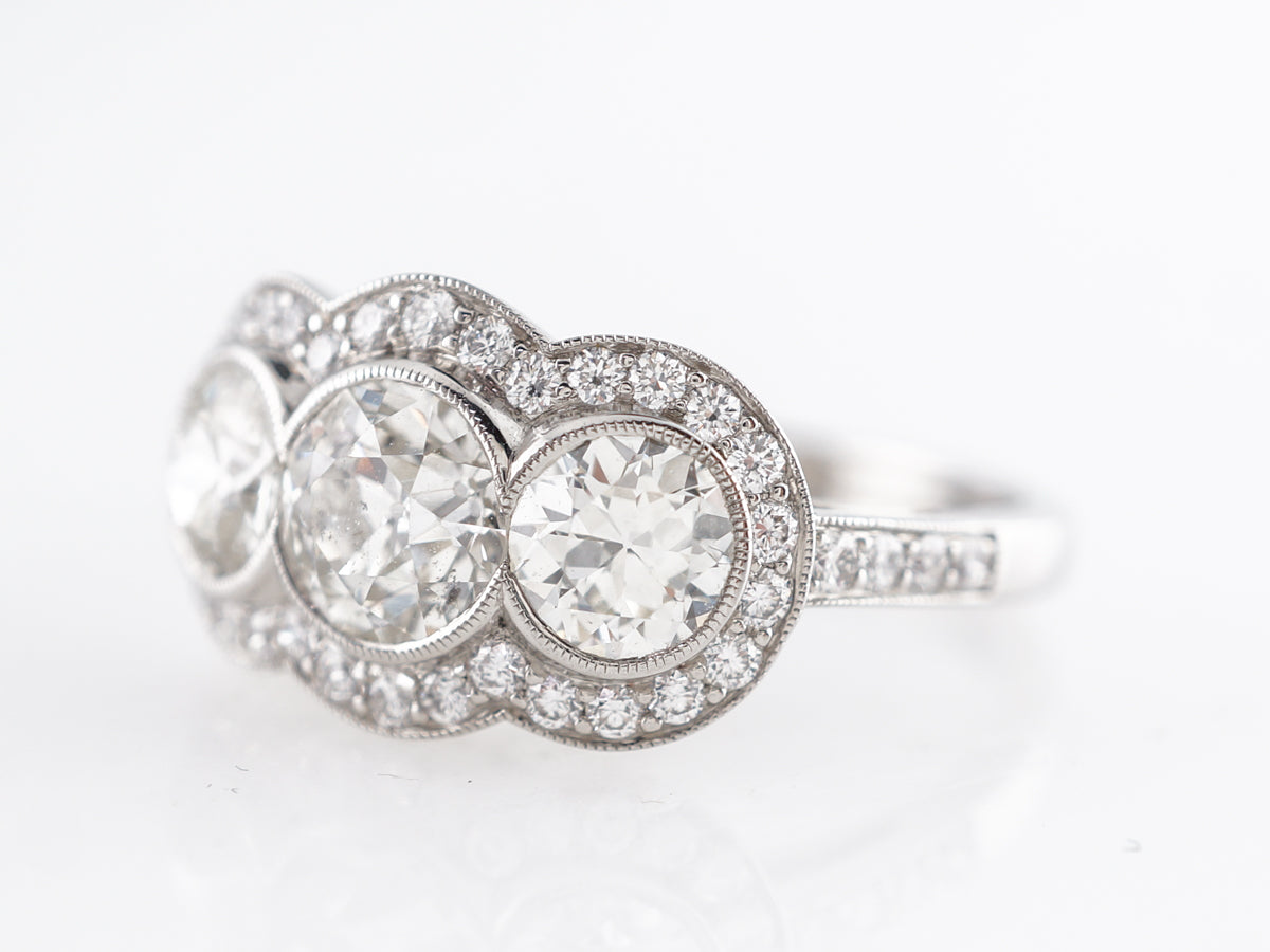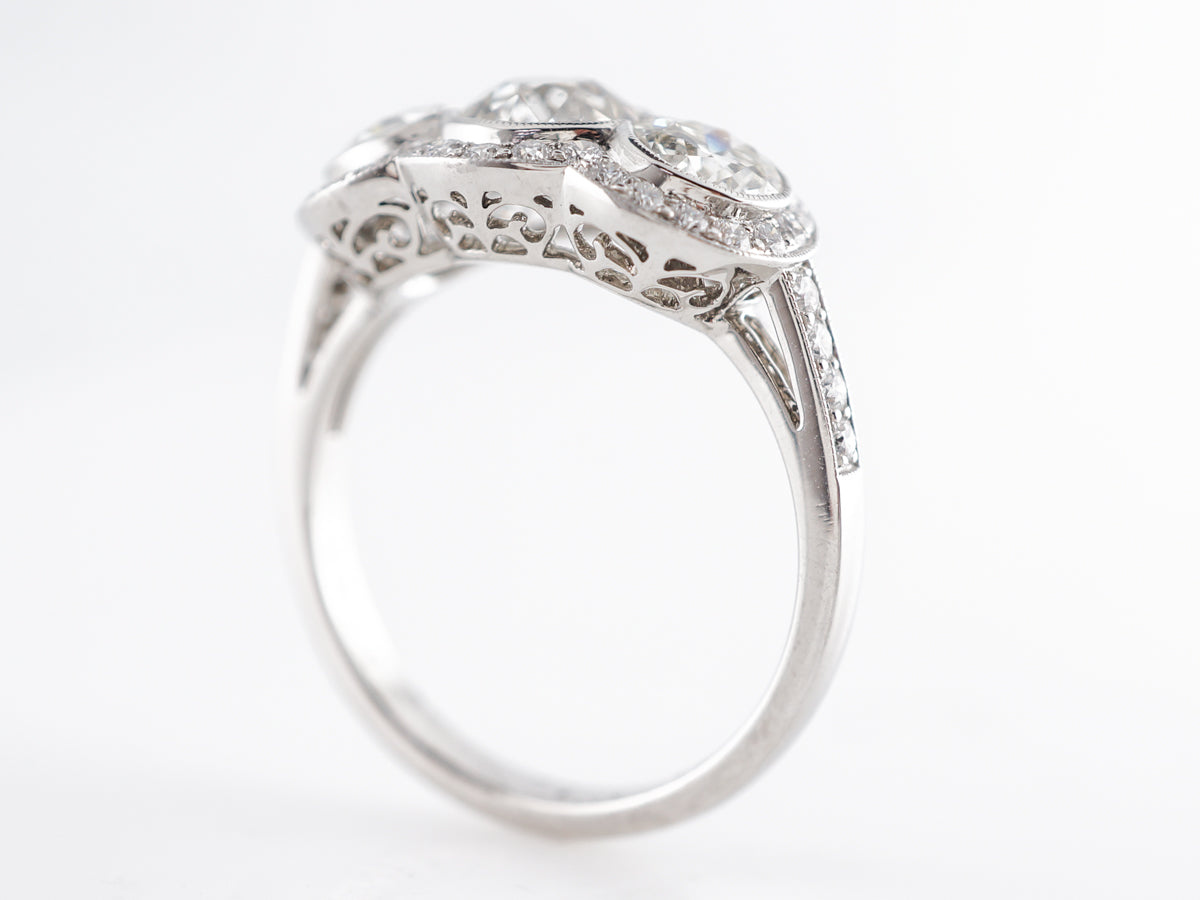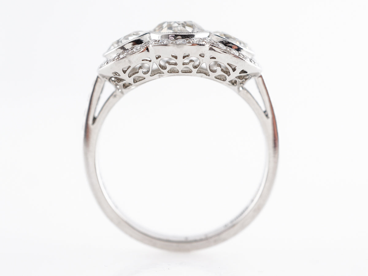 Three Stone Old European Cut Diamond Ring in Platinum.  This engagement ring is a modern interpretation of an Art Deco three stone ring.  Three old European cut diamonds are bezel set across the top of the band.  The three stones are surrounded by a halo of round brilliant cut diamonds that provide a stunning accent to the glittering center stones.  The undercarriage of the ring features lovely filigree work that allows light to move through the stones while still sitting low on the finger.