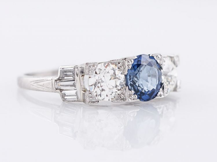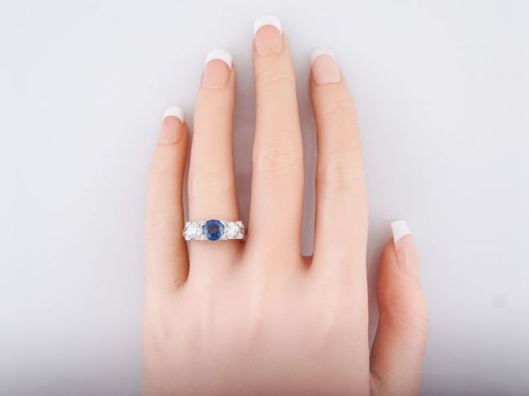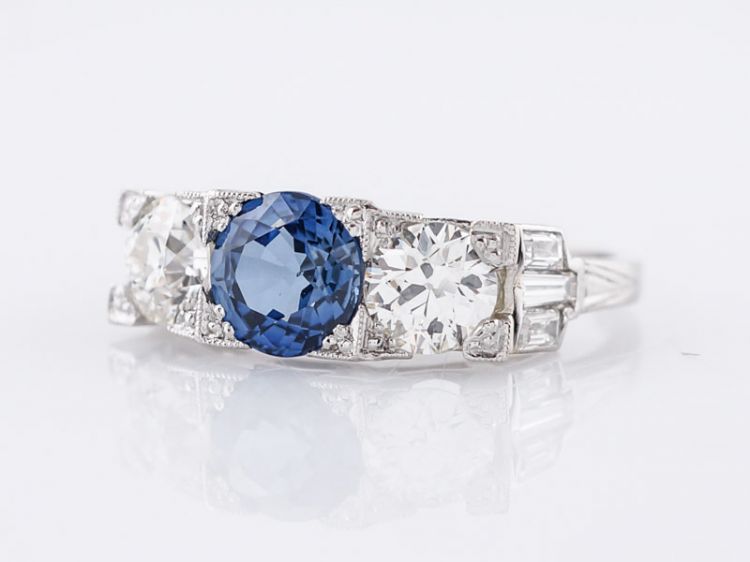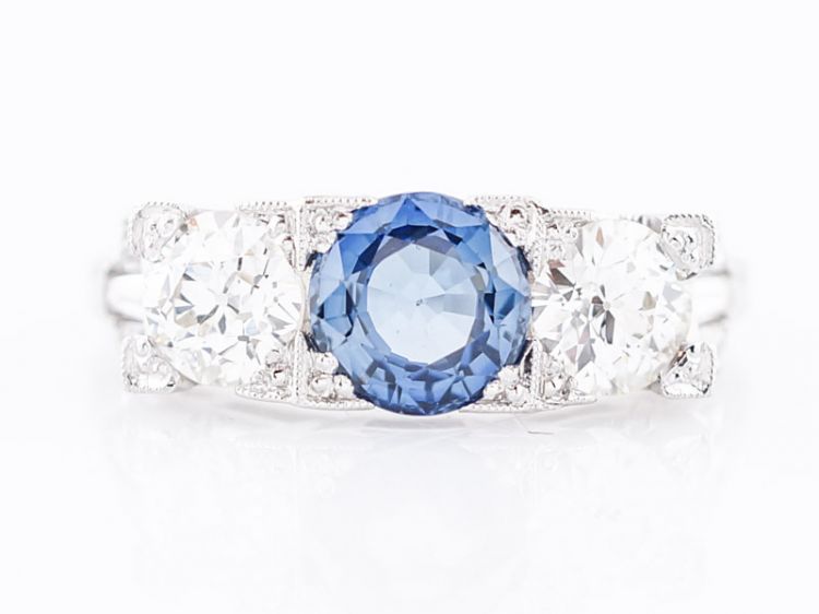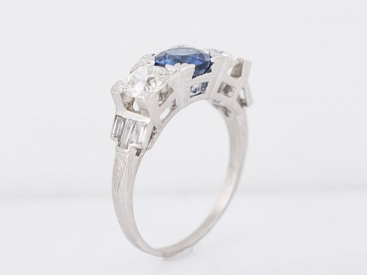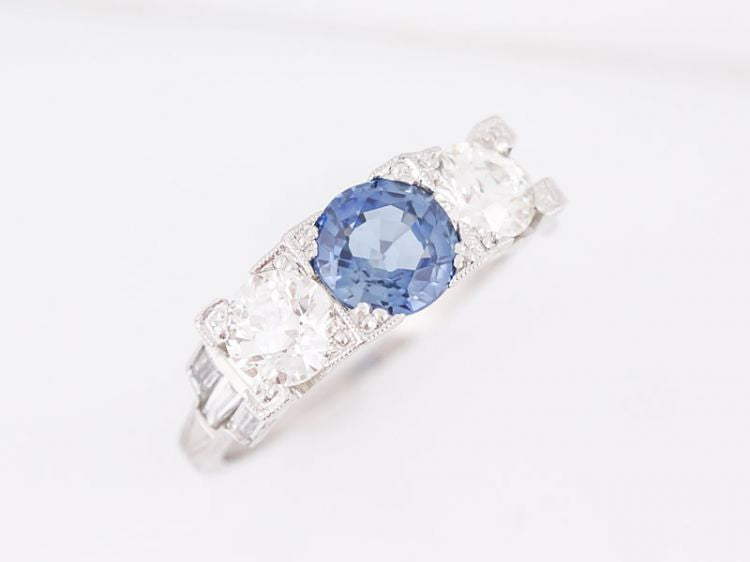 Three Stone Sapphire & Diamond Engagement Ring Art Deco Platinum