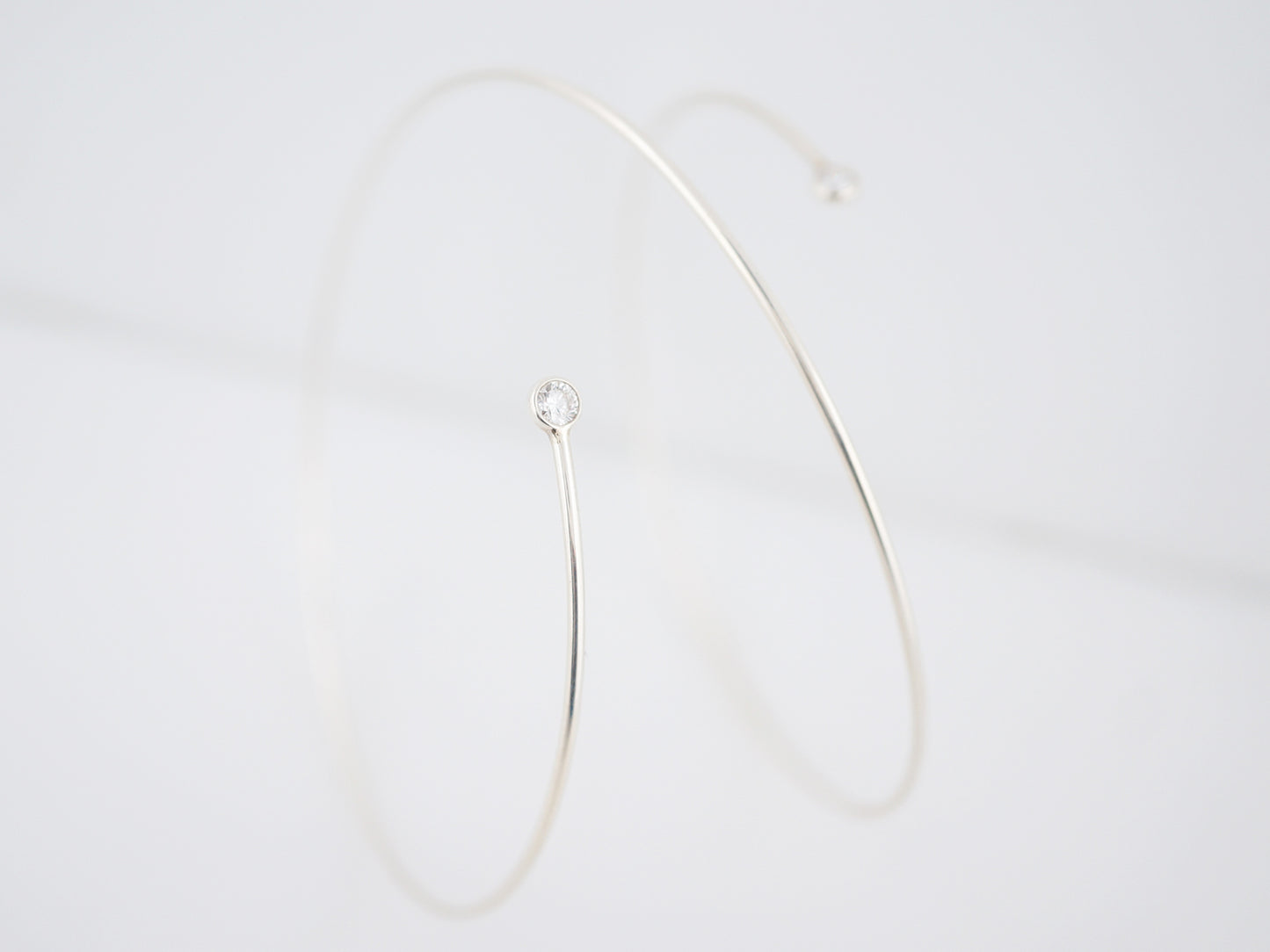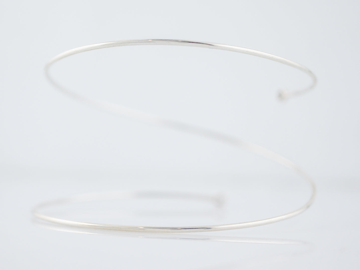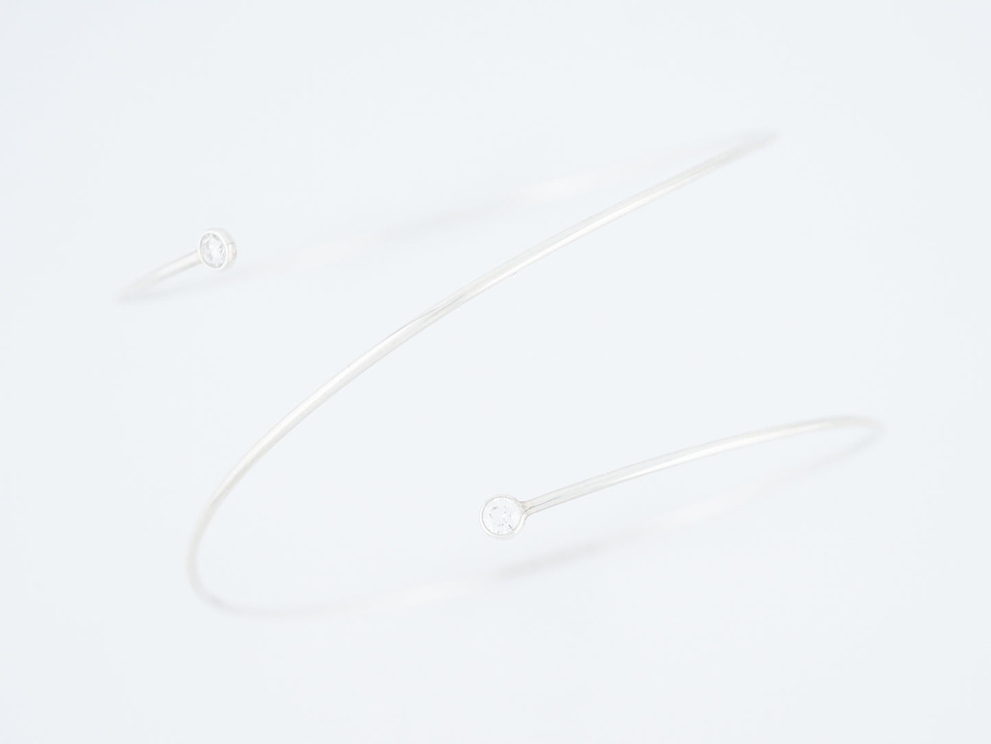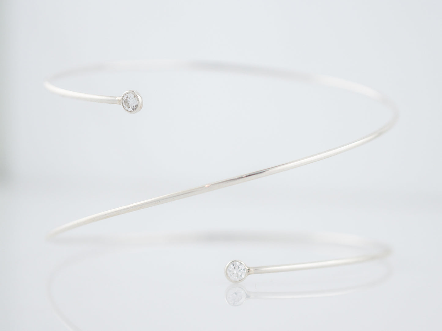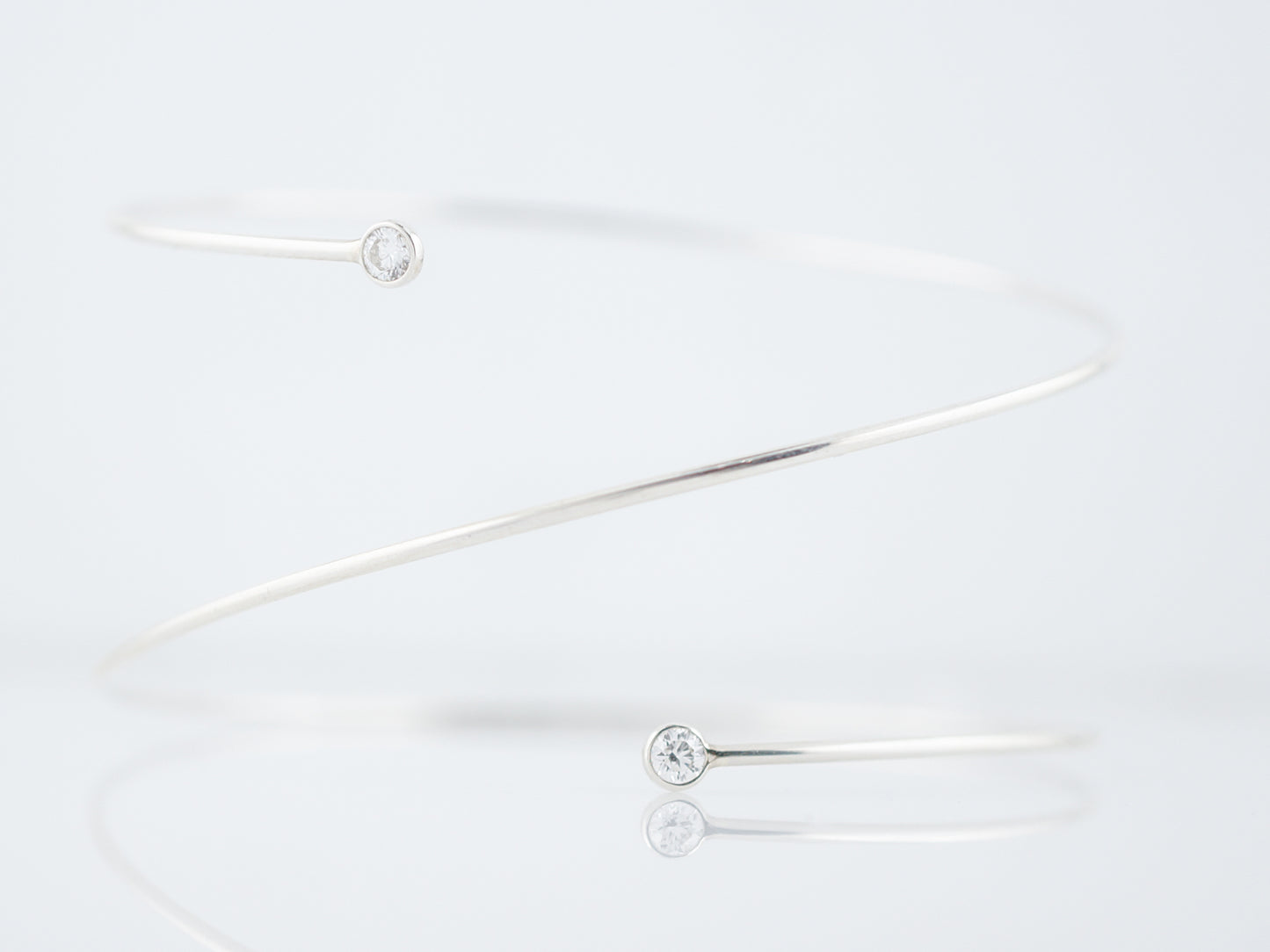 This Modern Era, Sterling Silver wire wrap bracelet was made by Tiffany Co and features two bezel set diamonds at each end of the wire. The bracelet wraps around the wrist about one and a half time and at each end is a bezel set, 0.11 carat, F color, VS2 diamond. Simple and elegant this bracelet is a wonderful transition piece from the office to date night.