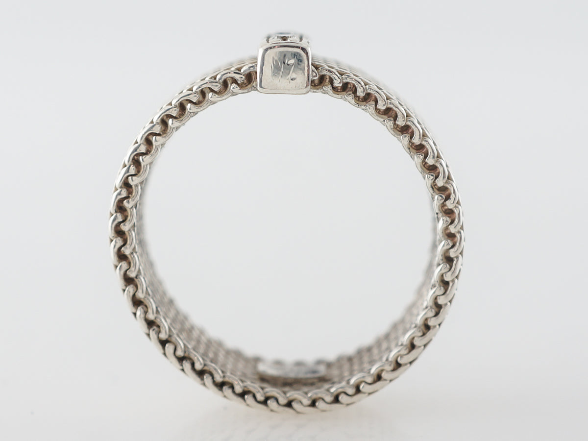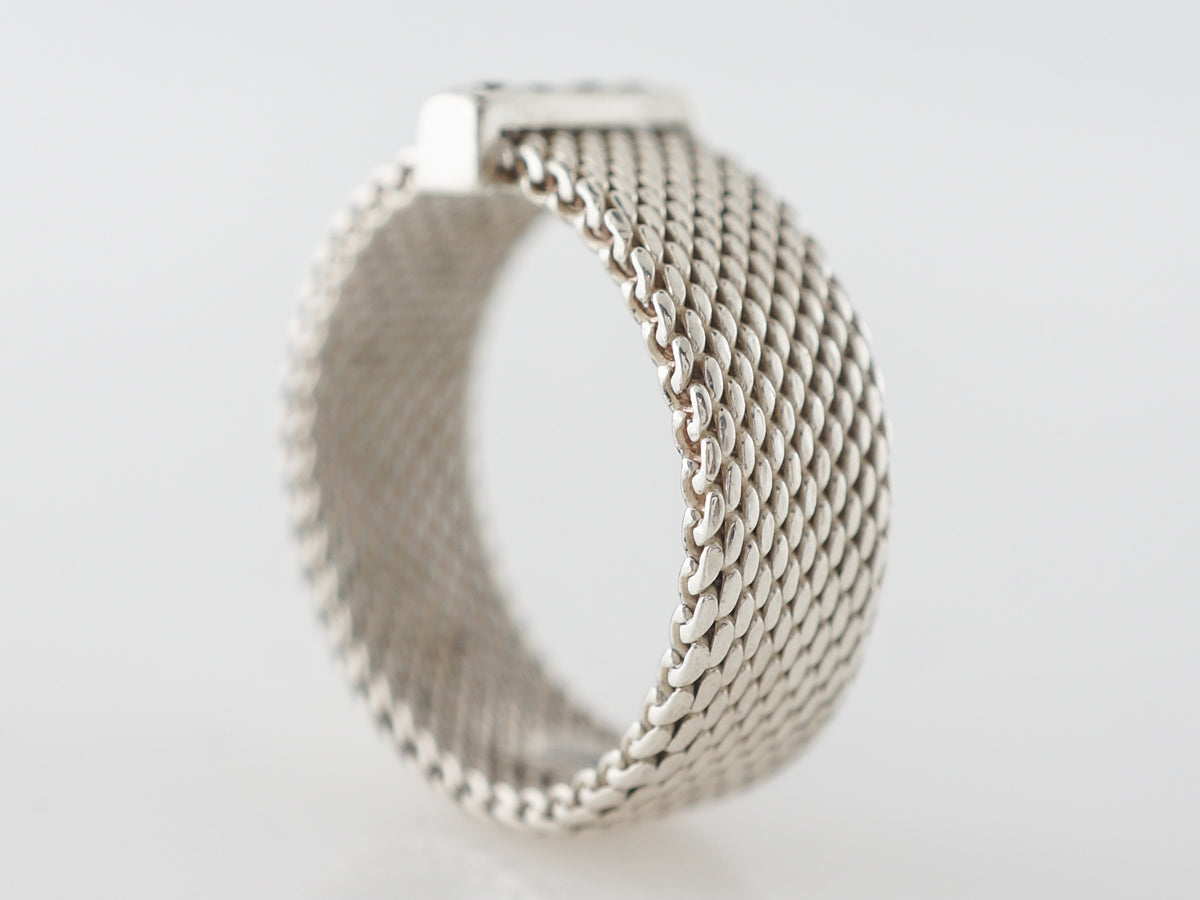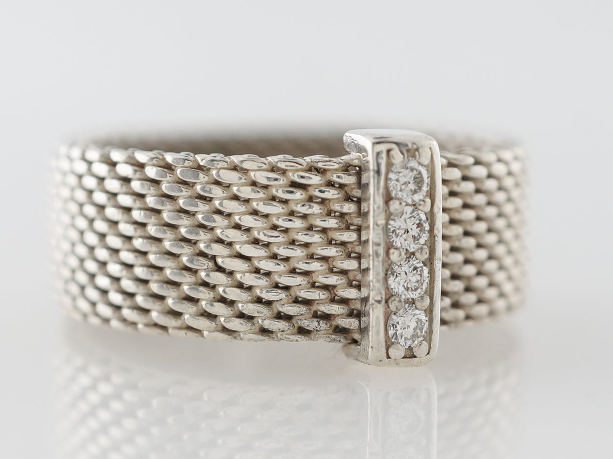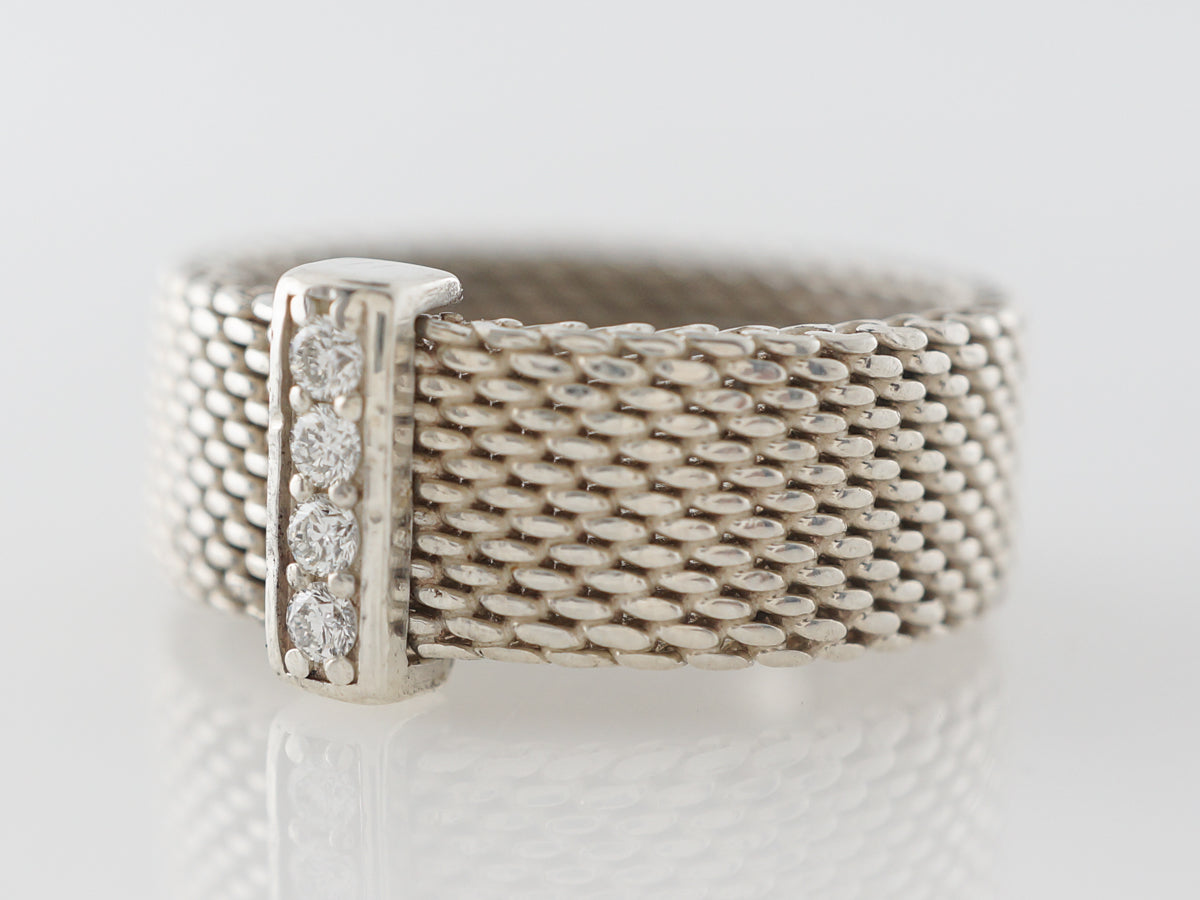 Tiffany Co. Elsa Peretti Right Hand Ring in Sterling Silver. This wonderful diamond and sterling silver right hand ring designed by Elsa Peretti is simple and elegant. The shank features a woven looking design with a bar of silver holding four (4) .15 carat diamonds in a line at the center. This ring would make a lovely gift for anyone.