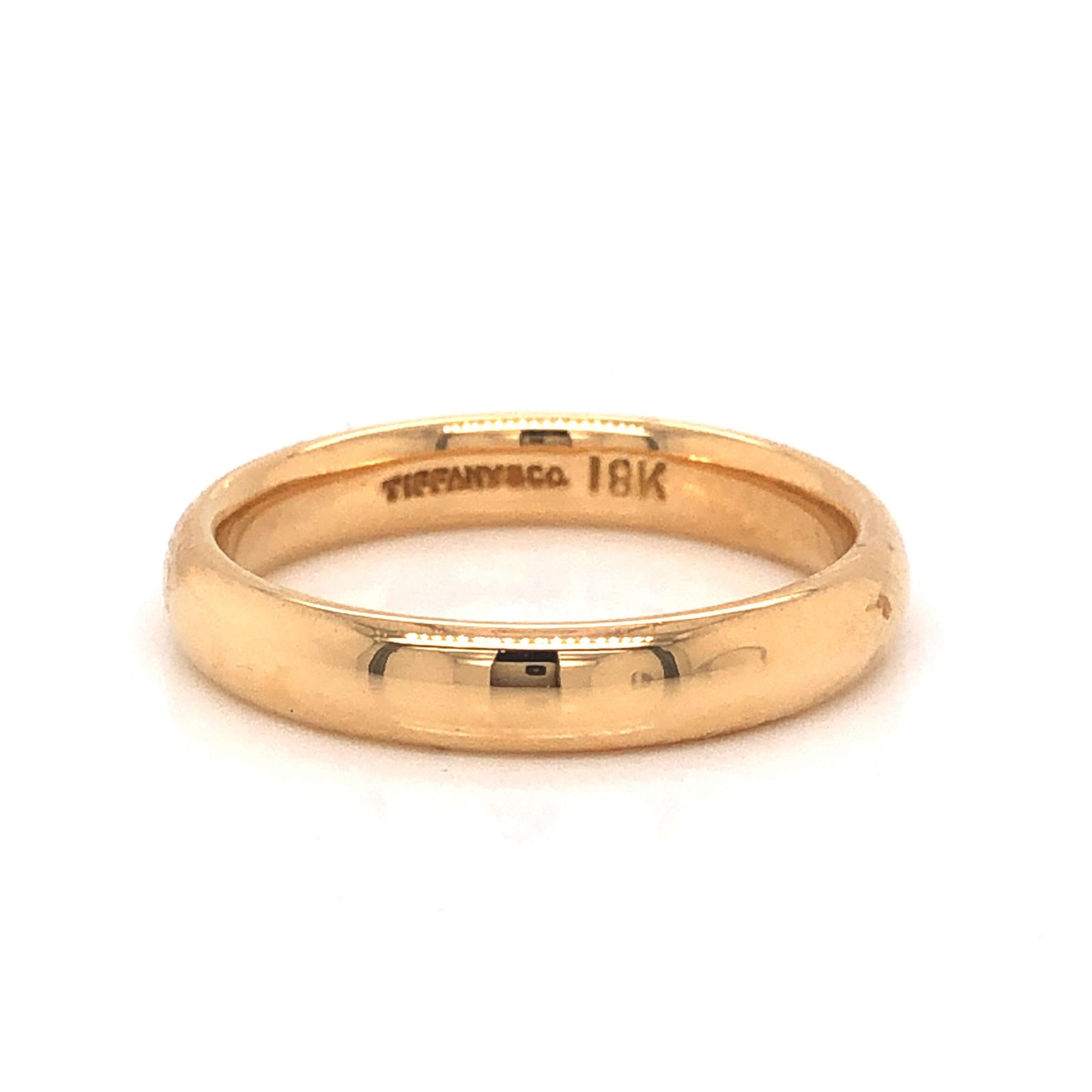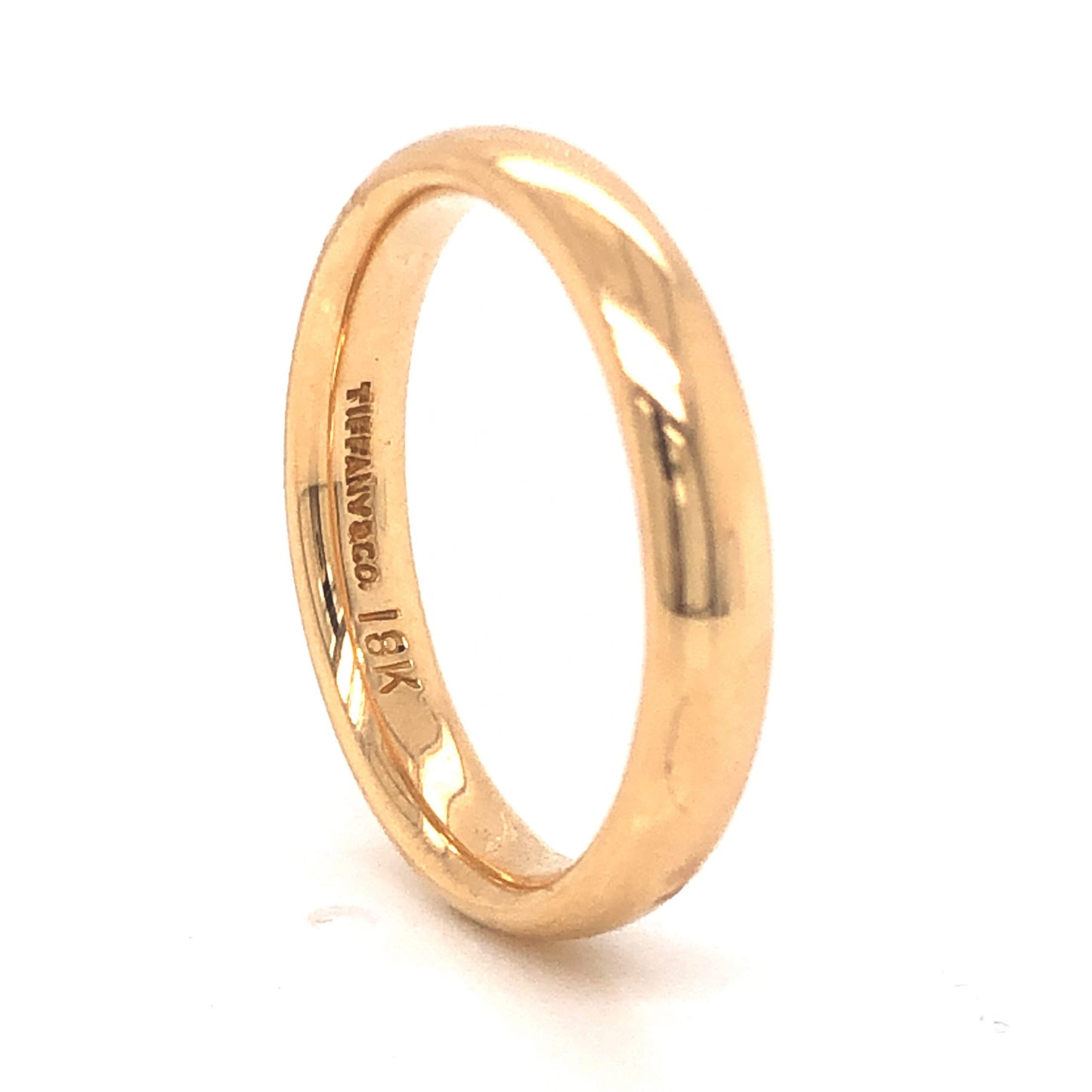 This modern Tiffany Co. designer wedding band features a classic comfort-fit profile in polished 18 karat yellow gold. The band measures 3.54mm wide and has a radiant luster. This highly-coveted style of wedding band is simple yet chic. A lovely wedding ring from Tiffany’s!