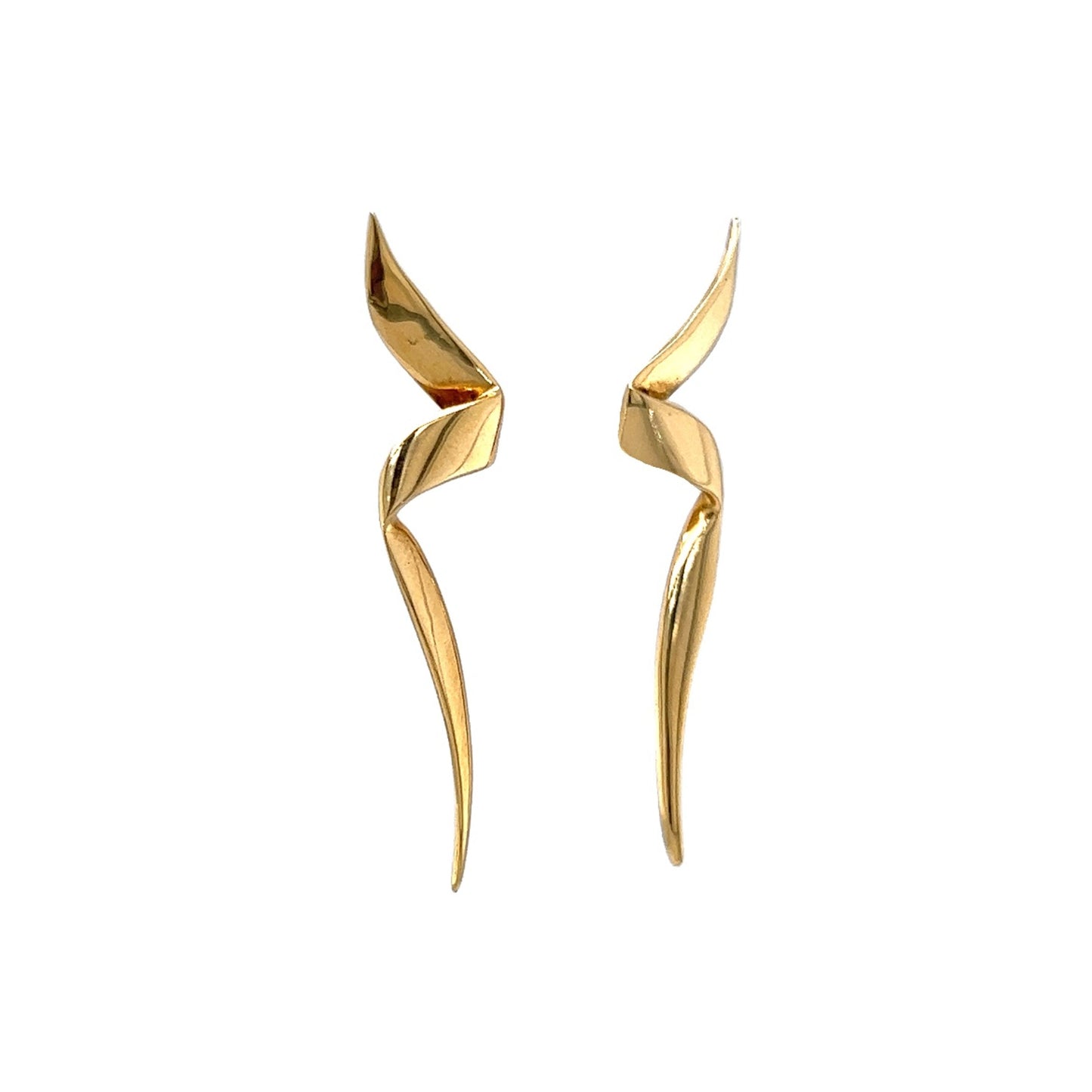 Tiffany Co. Paloma Picasso Earrings in 18k Yellow Gold. Daughter of artist Pablo Picasso and painter Françoise Gilot, jewelry designer Paloma Picasso uses natural shapes and unique forms in her one of a kind creations. These 90s era Tiffany Co. Paloma Picasso drop earrings feature two structured ribbons finished in polished 18 karat yellow gold. The twisted dangles are sleek and lightweight. The perfect set of earrings with an imaginative and universal feel.