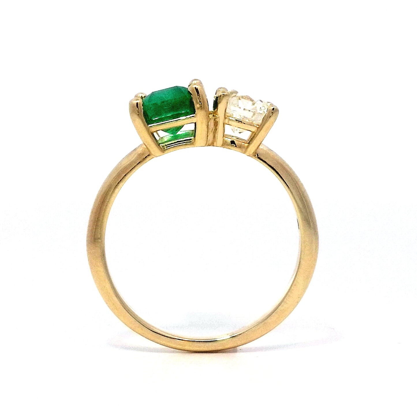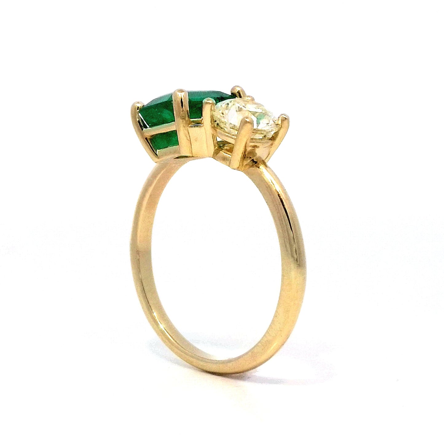 Crafted from 14 karat yellow gold, this ring features an emerald cut emerald along side a round brilliant cut diamond. The emerald has a total carat weight of 1.39 while the diamond is .78 carats. The stones are set in toi et moi design and along with the 14k yellow gold provide a gorgeous mix of color, contrast and sparkle. This unique ring is versatile and can be worn everyday or as a sometimes ring.