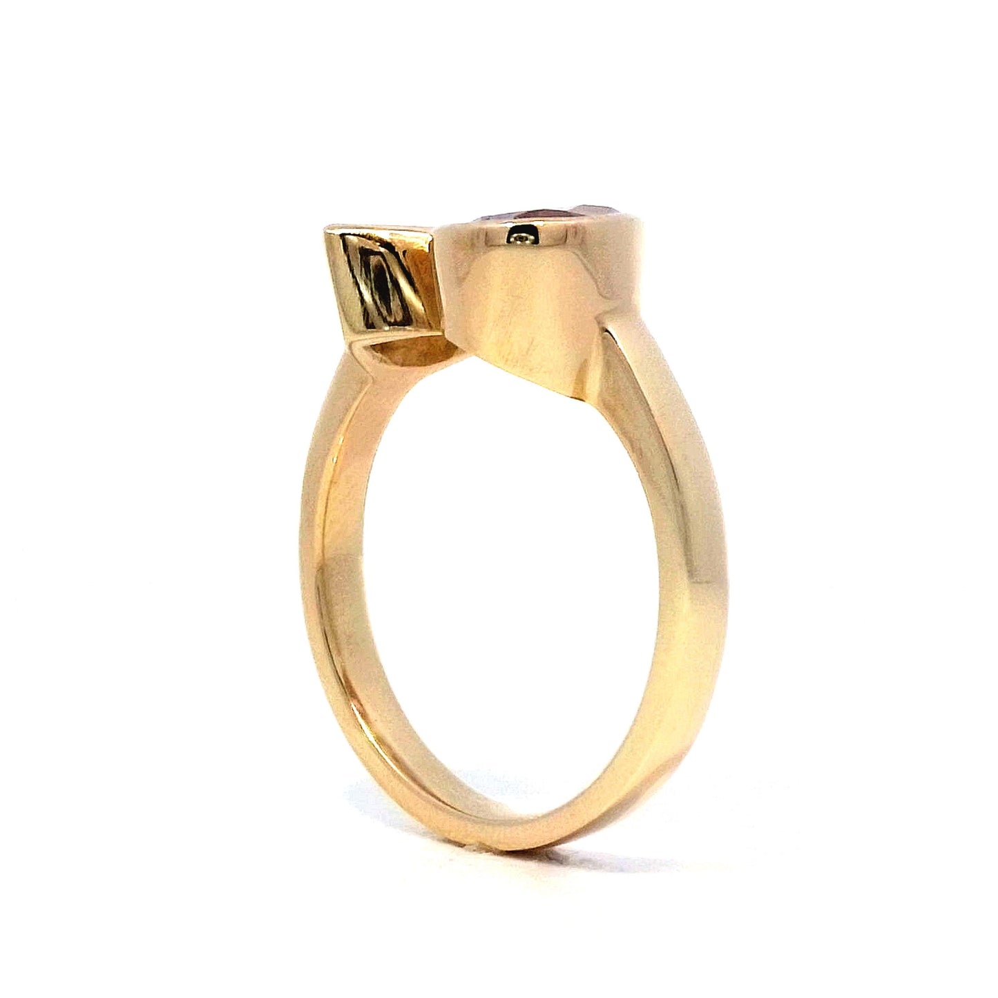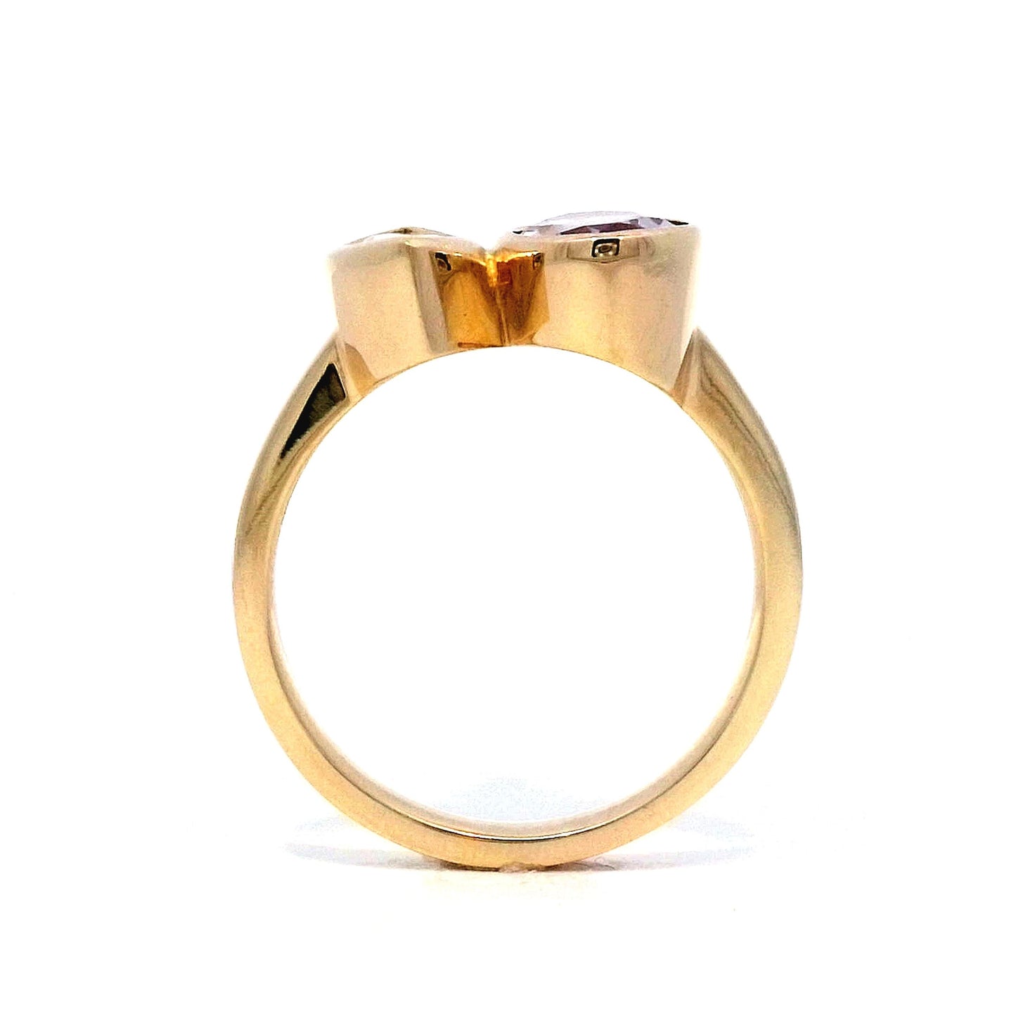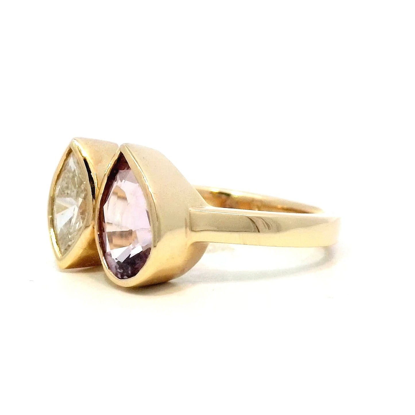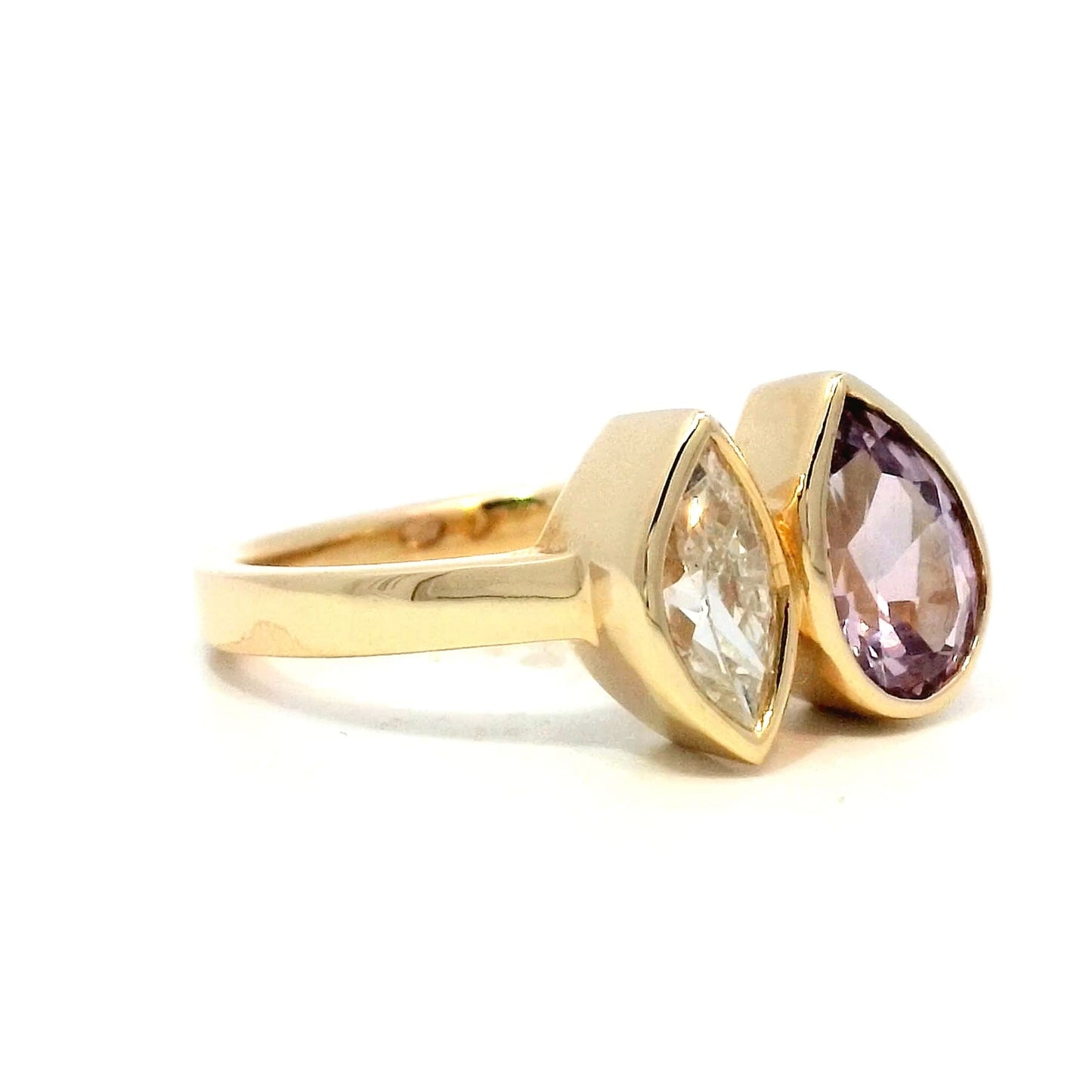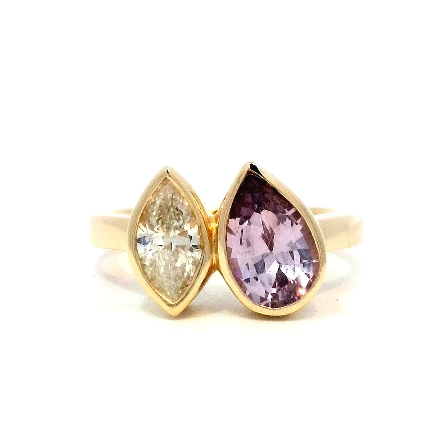 This modern cocktail ring is dripping with style! Crafted in 14 karat yellow gold, the Toi Et Moi design features a .73 carat marquise cut diamond alongside a pear cut purple spinel. The diamond has a stunning E color and VS2 clarity and is full of life and brilliance. Both stones are bezel set in polished yellow gold, creating a sleek and contemporary look. The 2.5 mm flat edge band makes this ring easy to wear all day long.