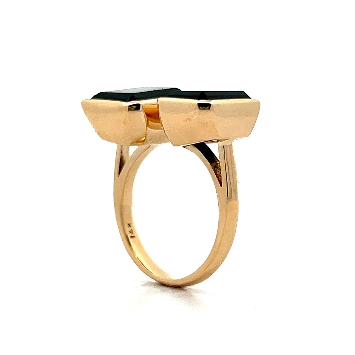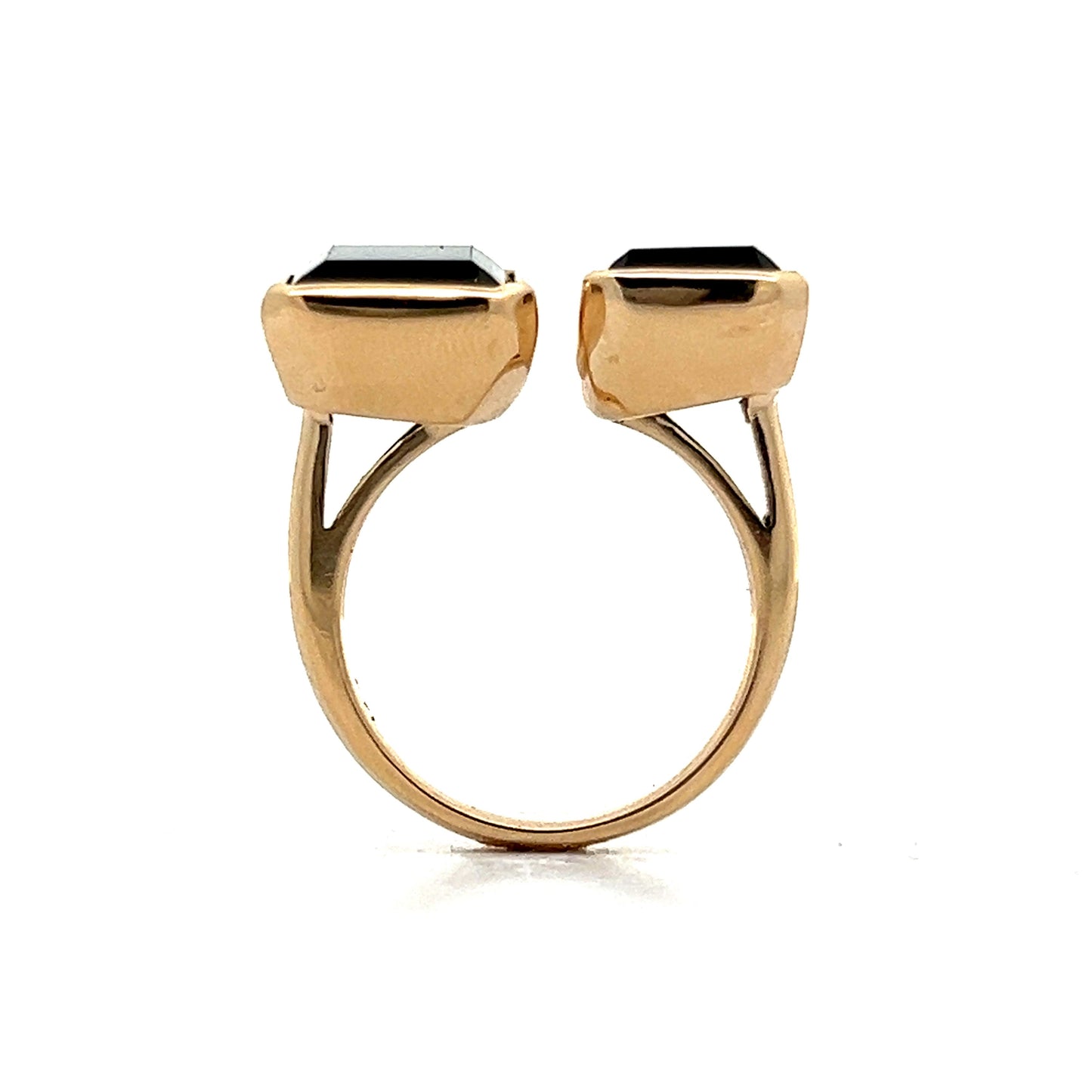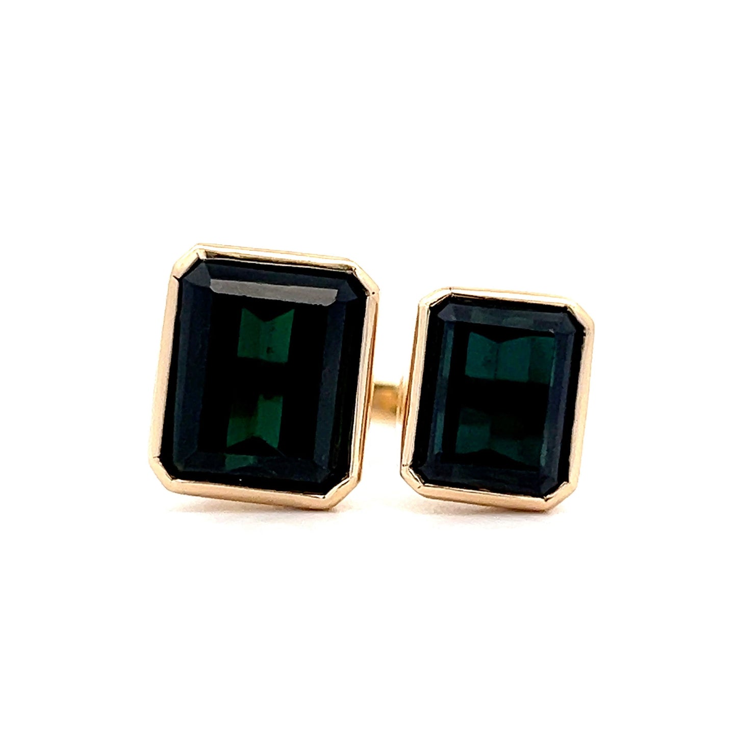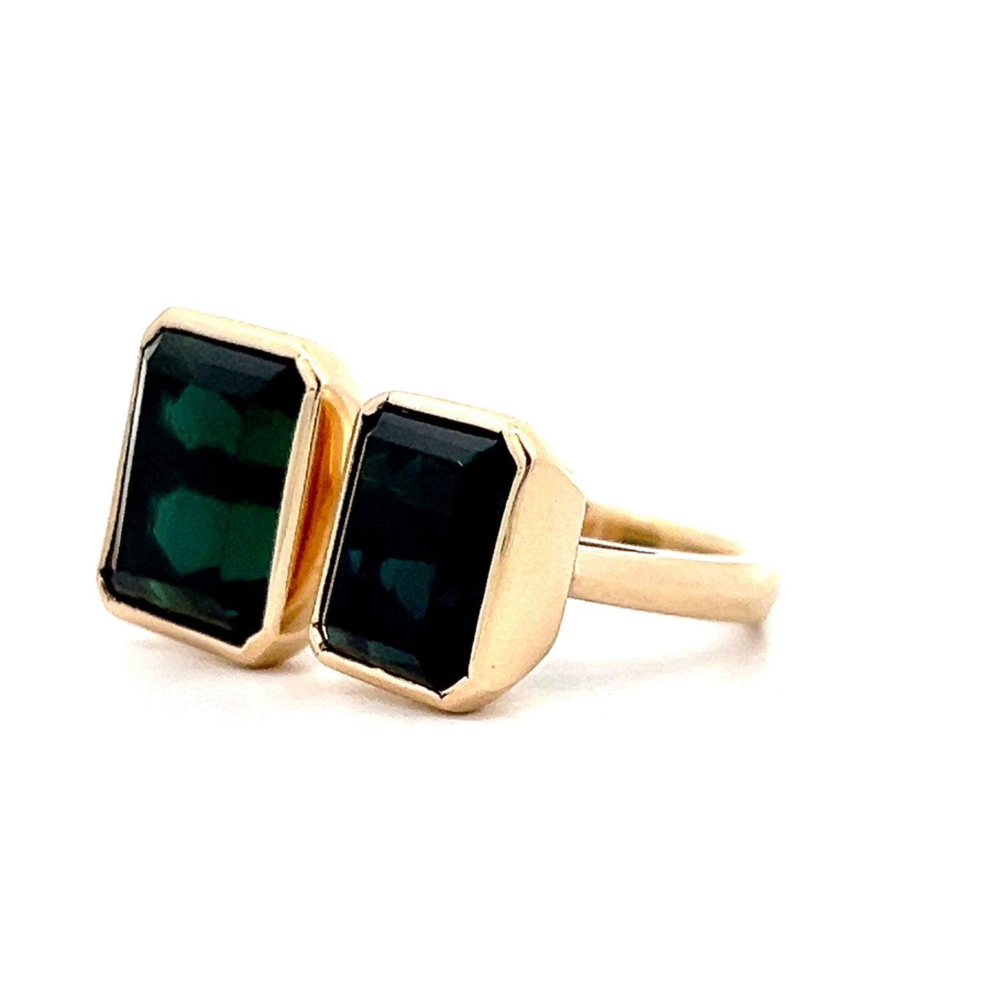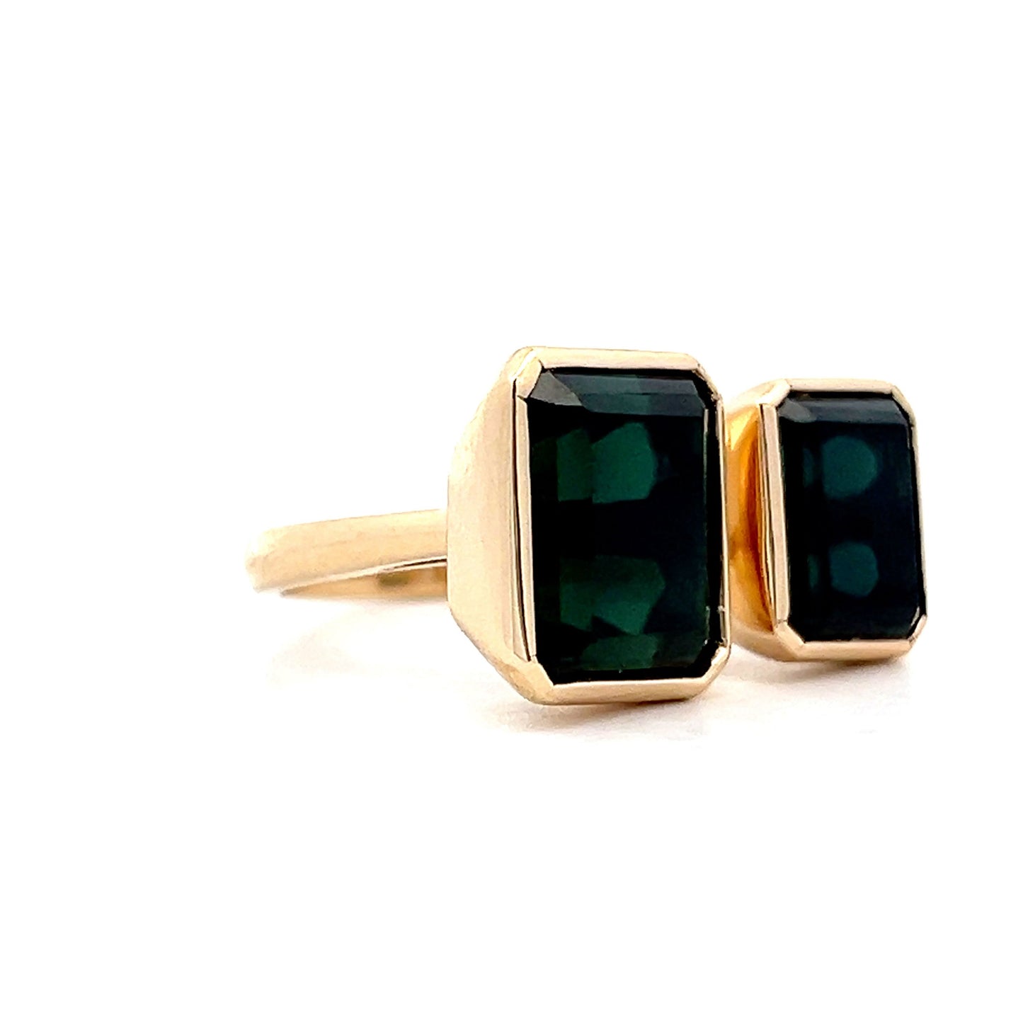 This modern cocktail ring made 'By Filigree' showcases a striking two-stone design, featuring bezel-set emerald-cut green tourmalines, perfectly capturing the "Toi et Moi" style with a unique open center and gap between the tourmalines. Crafted in polished 14k yellow gold, the ring displays meticulous craftsmanship with its bezel setting, ensuring both security and elegance. The primary gemstone measures 11.47 x 9.22 x 6.50 mm and weighs 6.52 carats, while the secondary gemstone measures 9.75 x 7.50 x 5.11 mm and weighs 4.14 carats. Ideal for cocktail parties, special occasions, or as a statement piece for everyday wear, this ring checks all the versatility boxes.
