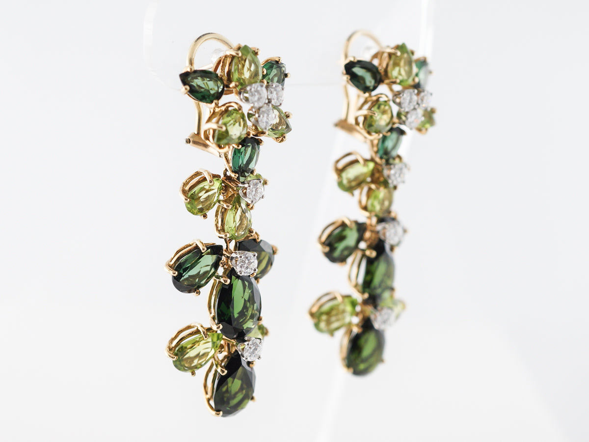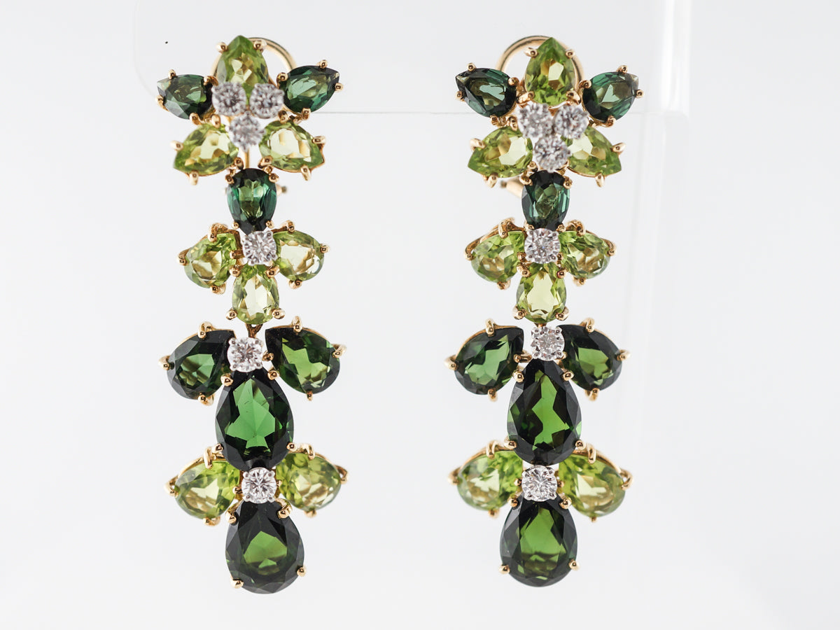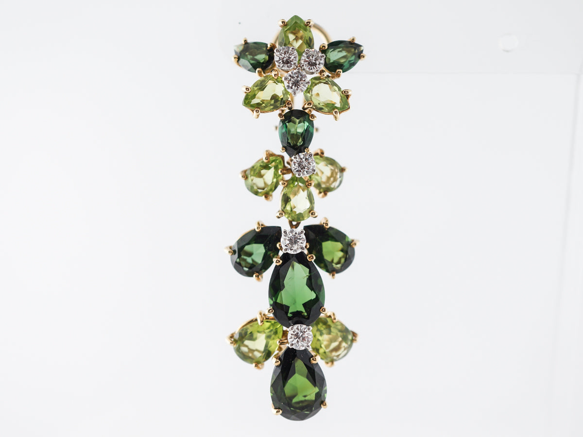 Tourmaline Diamond Dangle Earrings in Yellow Gold. These tourmaline and diamond earrings are beyond fabulous. The pear cut tourmalines are two different shades of green, making for an incredibly interplay of color. Two carats of round brilliant cut diamonds are set into the earrings and provide wonderful sparkle from every angle.