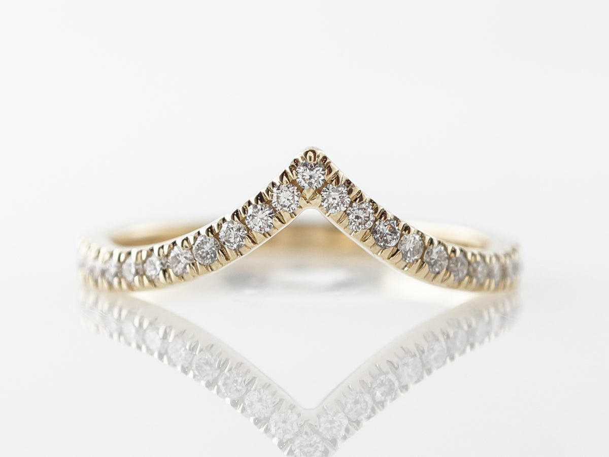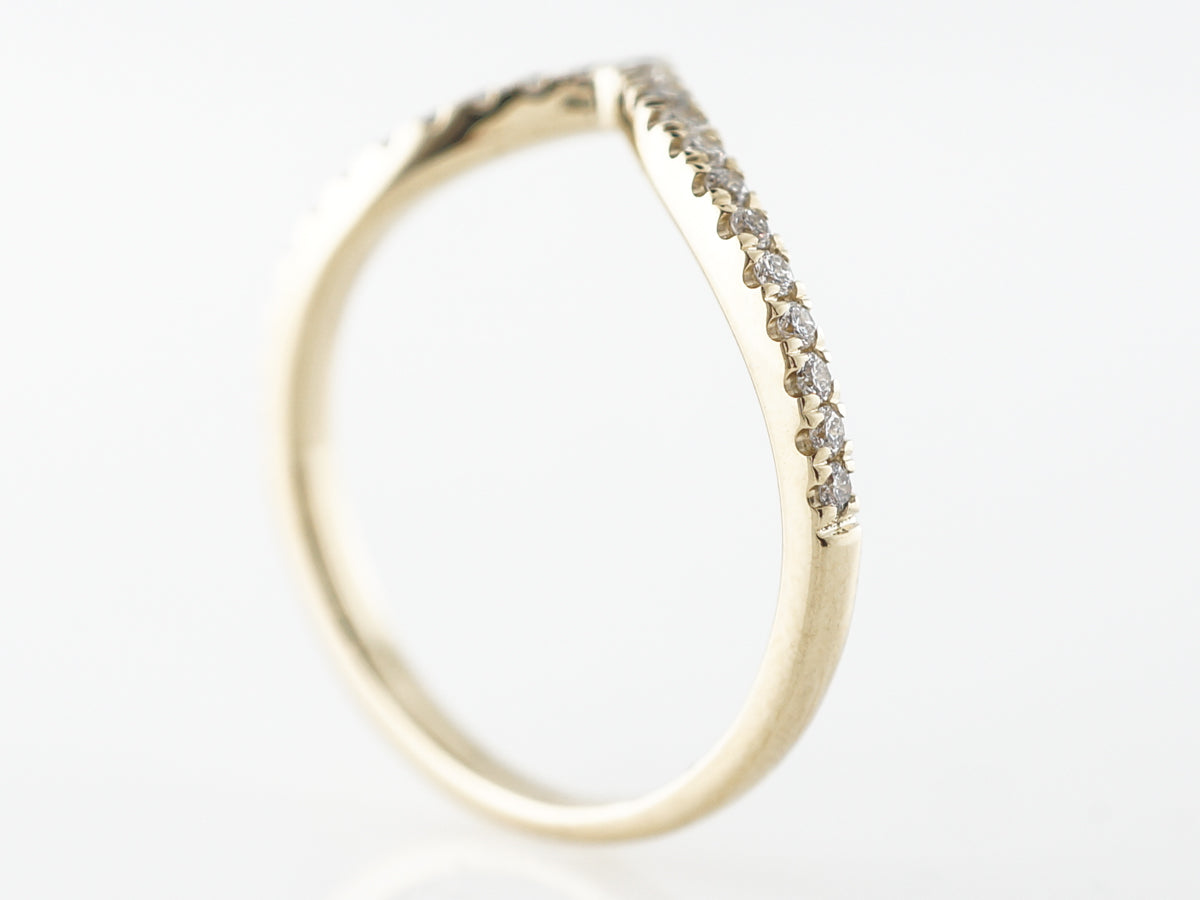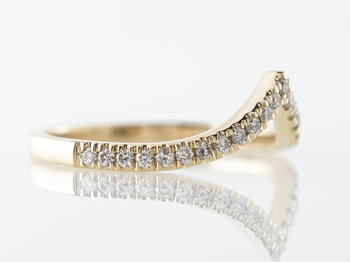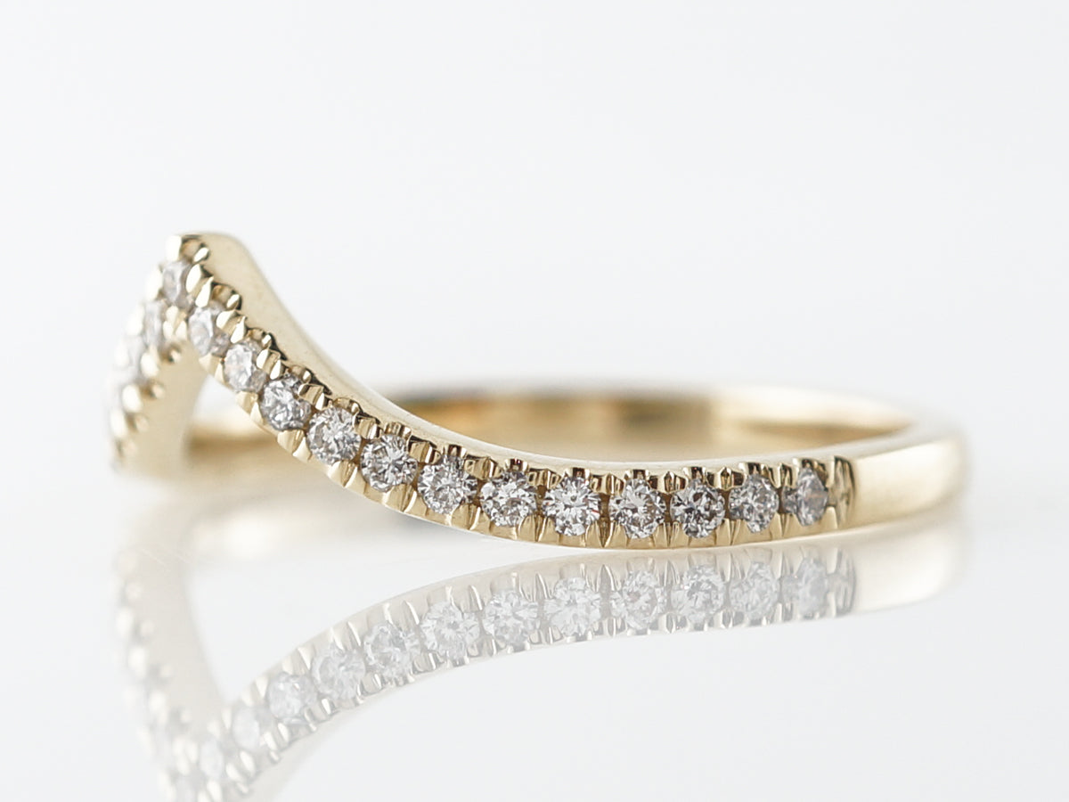 Triangular Diamond Wedding Band in 14k Yellow Gold. This modern wedding band band features thirty (25) round brilliant diamonds set into a yellow gold band. The band also features a dramatic curvature allowing the band to sit flush to most engagement rings. A lovely pairing for a wider engagement ring!